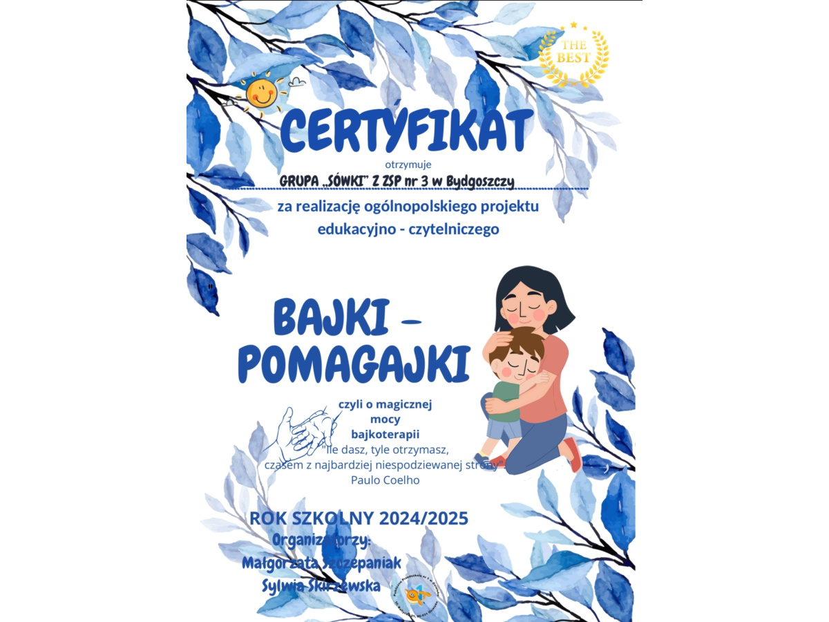 Koniec roku szkolnego zbliża się wielkimi krokami. W tym roku ,,Sówki" brały udział w ogólnopolskim projekcie edukacyjno - czytelniczym ,,BAJKI - POMAGAJKI czyli o magicznej mocy bajkoterapii". Za udział w projekcie dzieci otrzymały pamiątkowy certyfikat.
