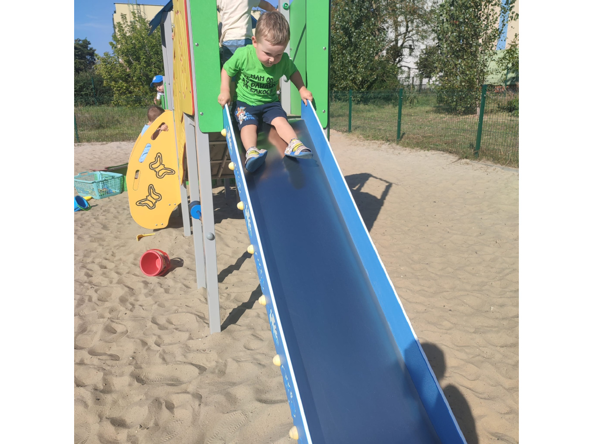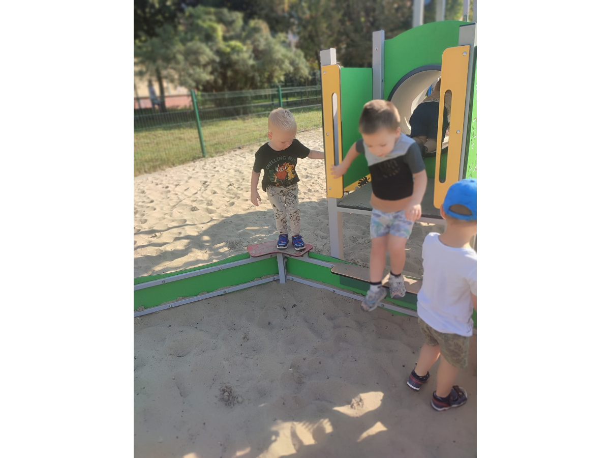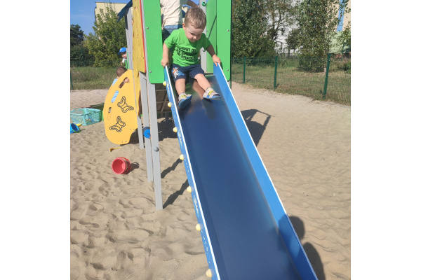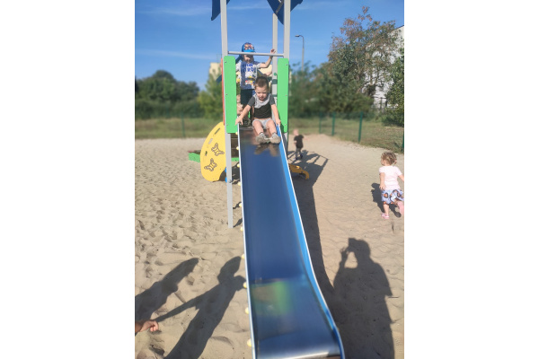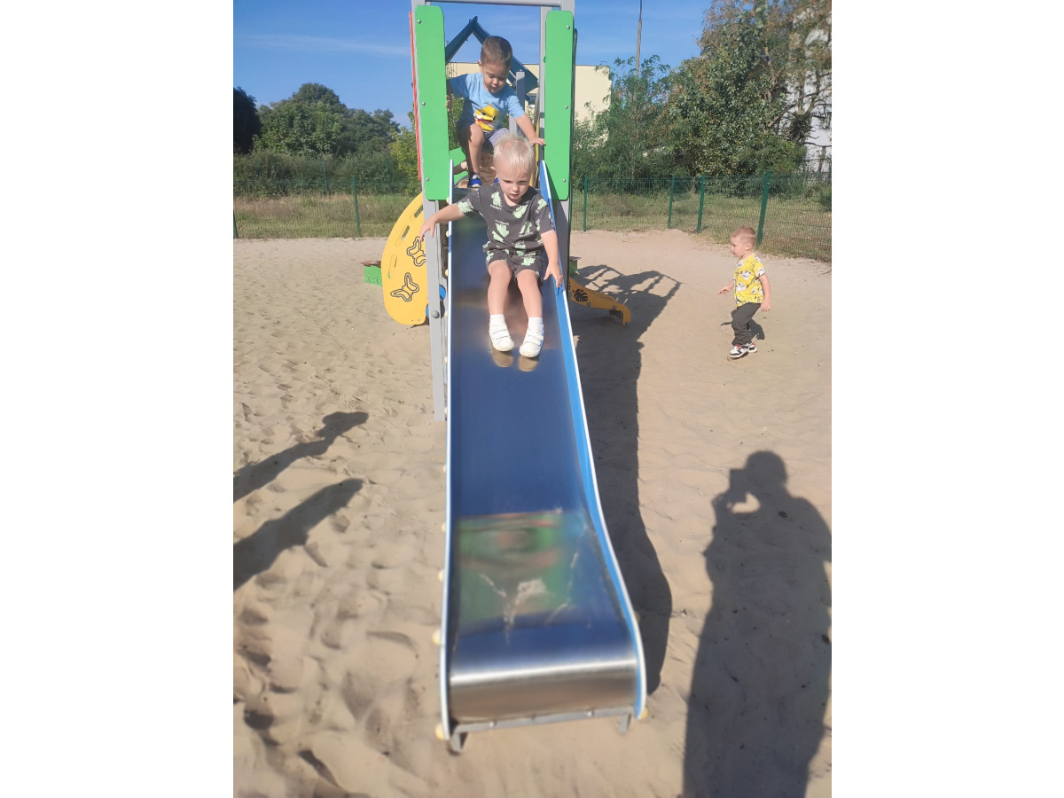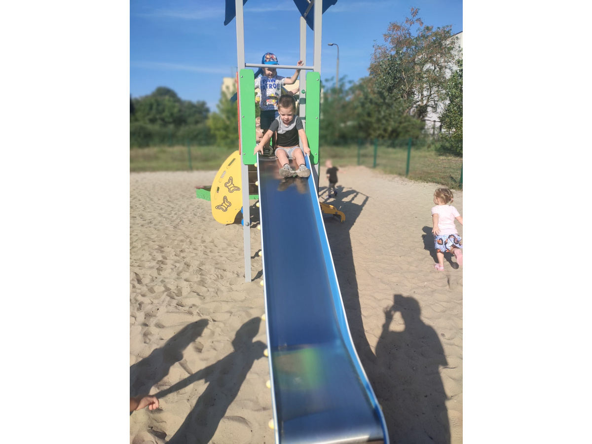 Dzieci z entuzjazmem poznawały nowe miejsce, korzystając ze zjeżdżalni i piaskownicy. Wspólna zabawa sprzyjała integracji grupy, uczyła dzielenia się i współpracy. Przedszkolaki wróciły do sali z uśmiechami na twarzach i miłymi wspomnieniami.