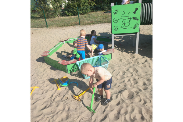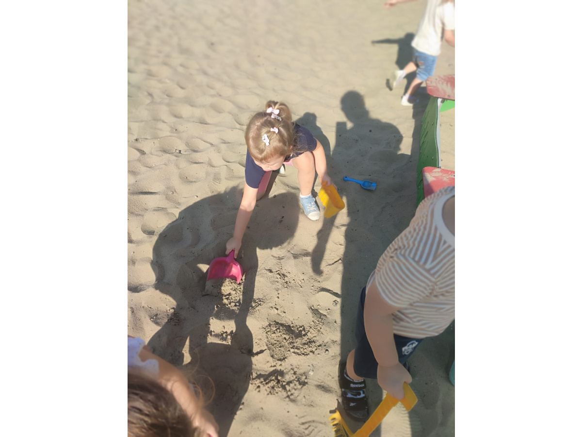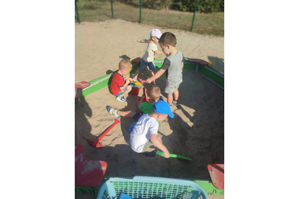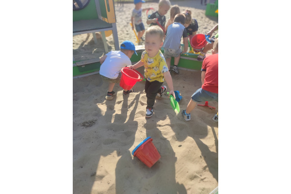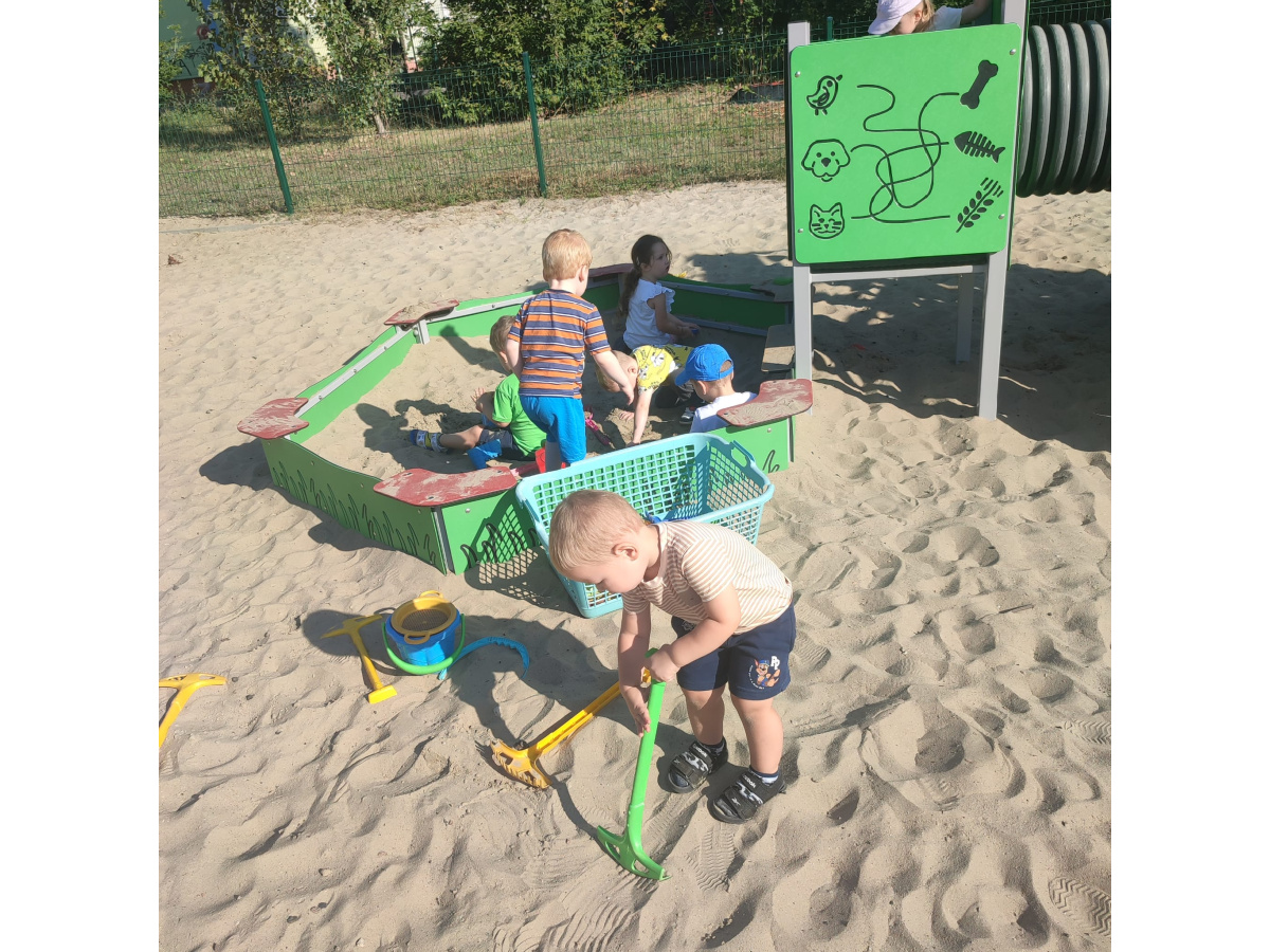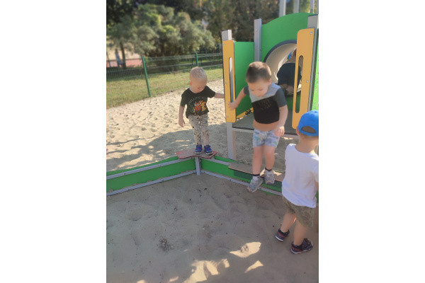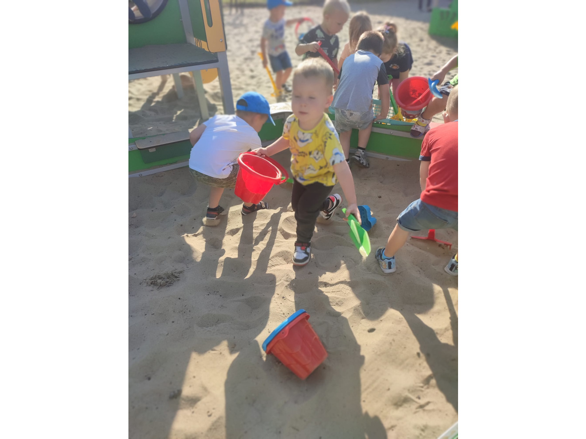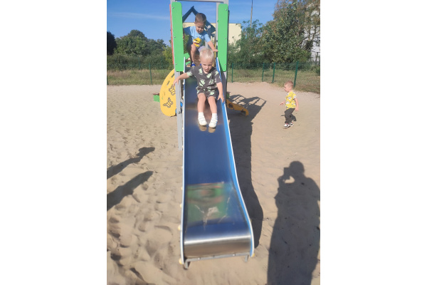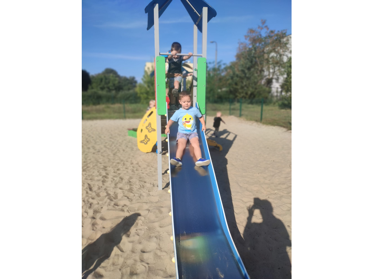 Dzieci z entuzjazmem poznawały nowe miejsce, korzystając ze zjeżdżalni i piaskownicy. Wspólna zabawa sprzyjała integracji grupy, uczyła dzielenia się i współpracy. Przedszkolaki wróciły do sali z uśmiechami na twarzach i miłymi wspomnieniami.
