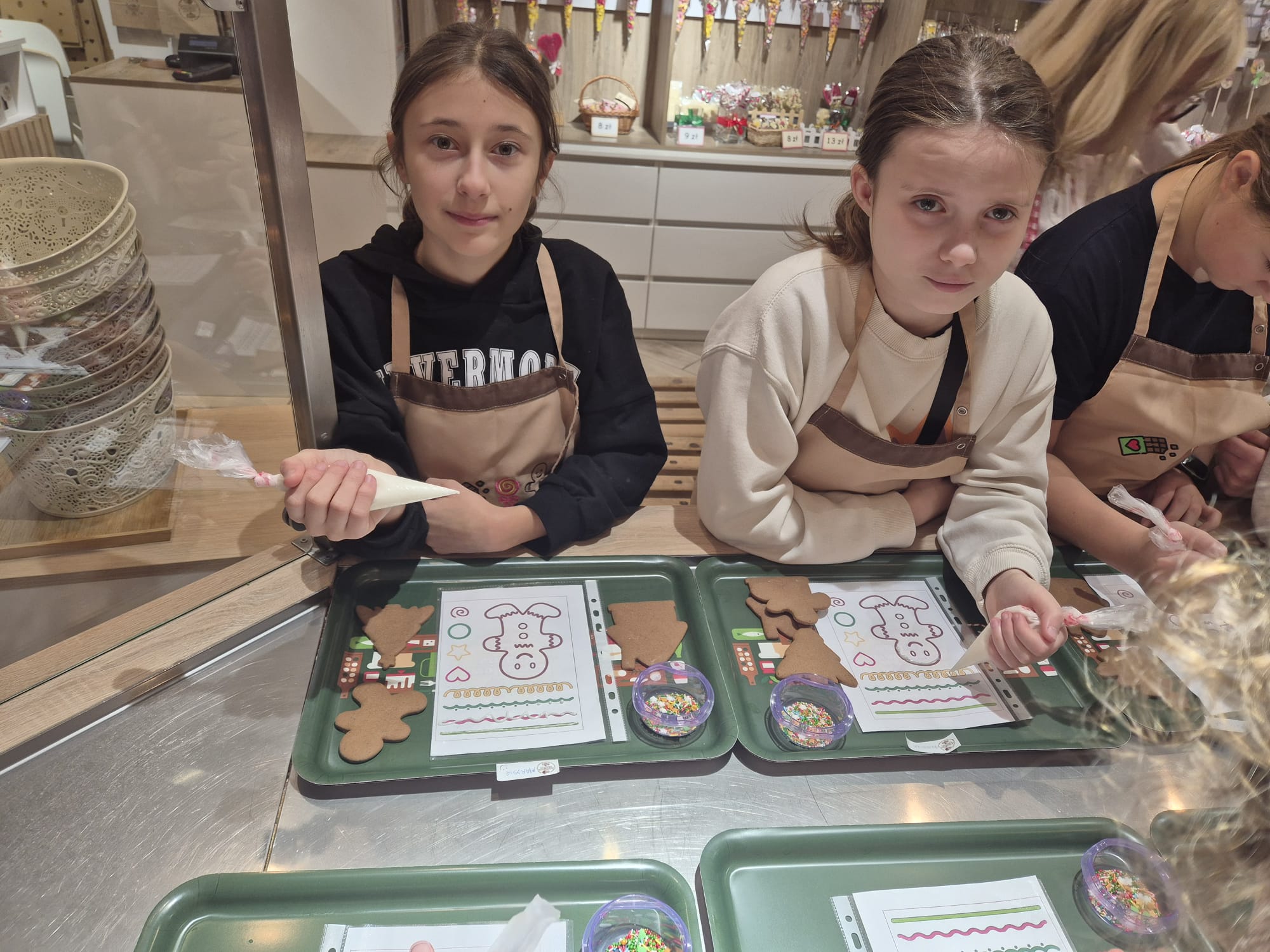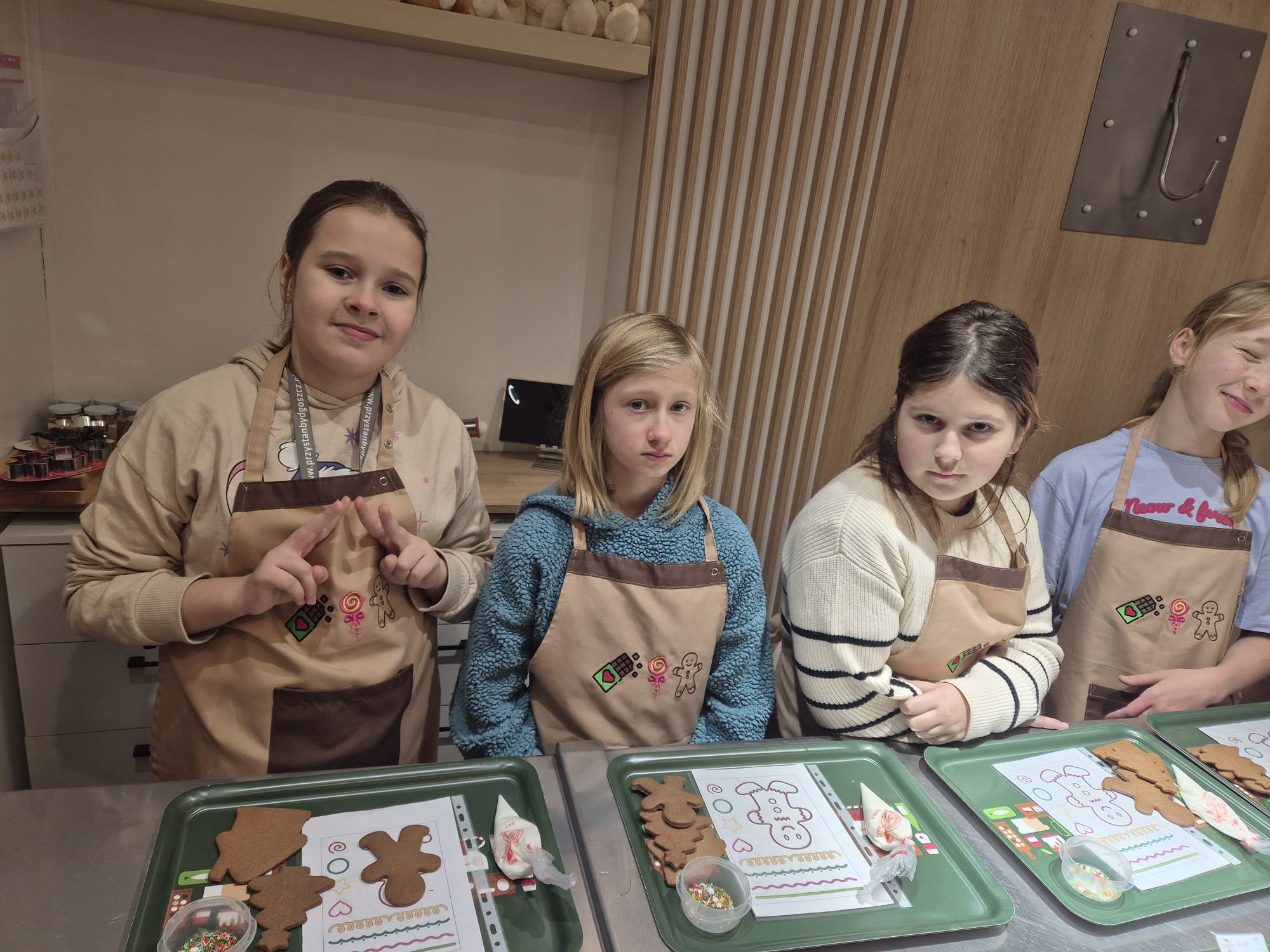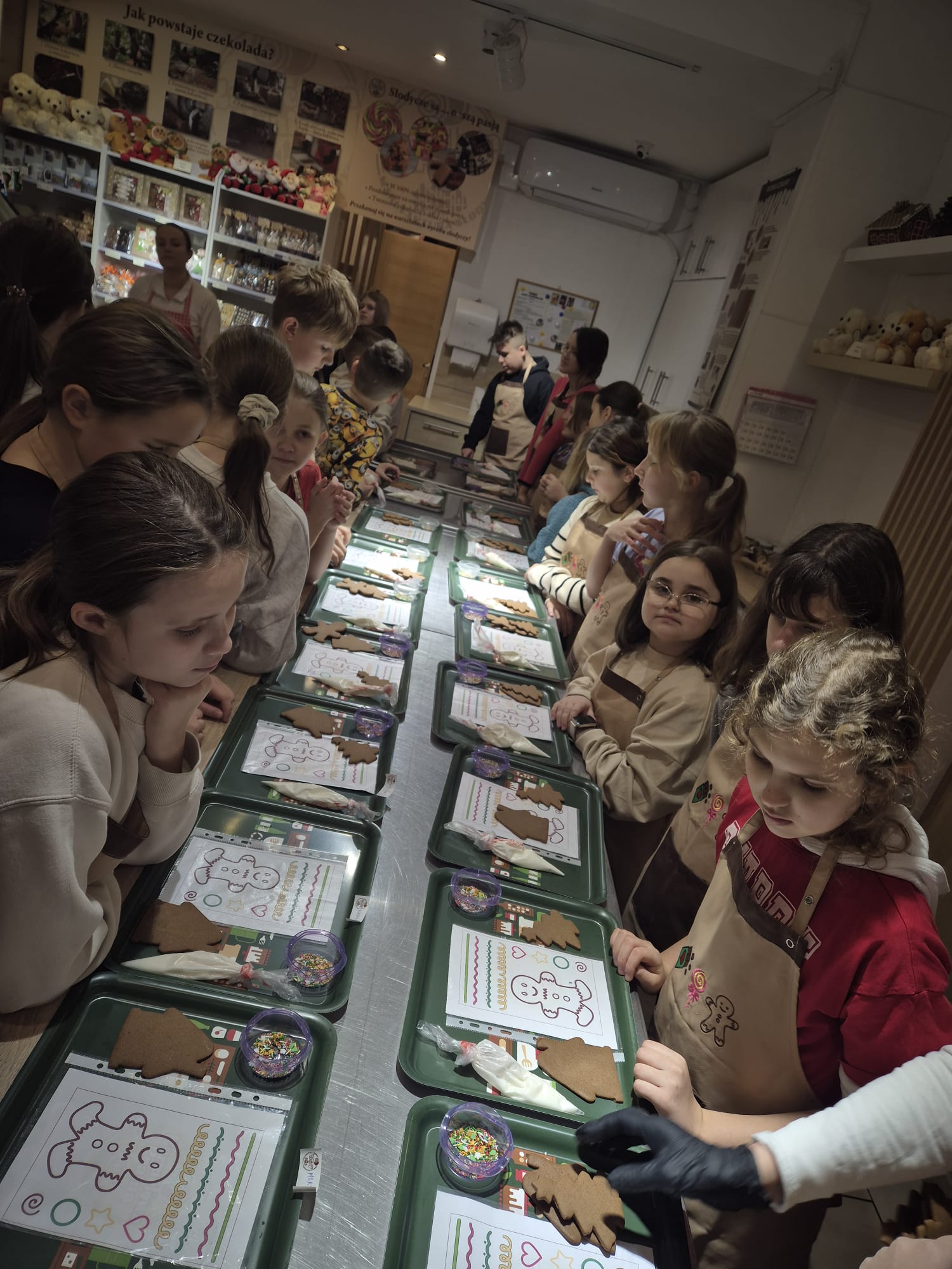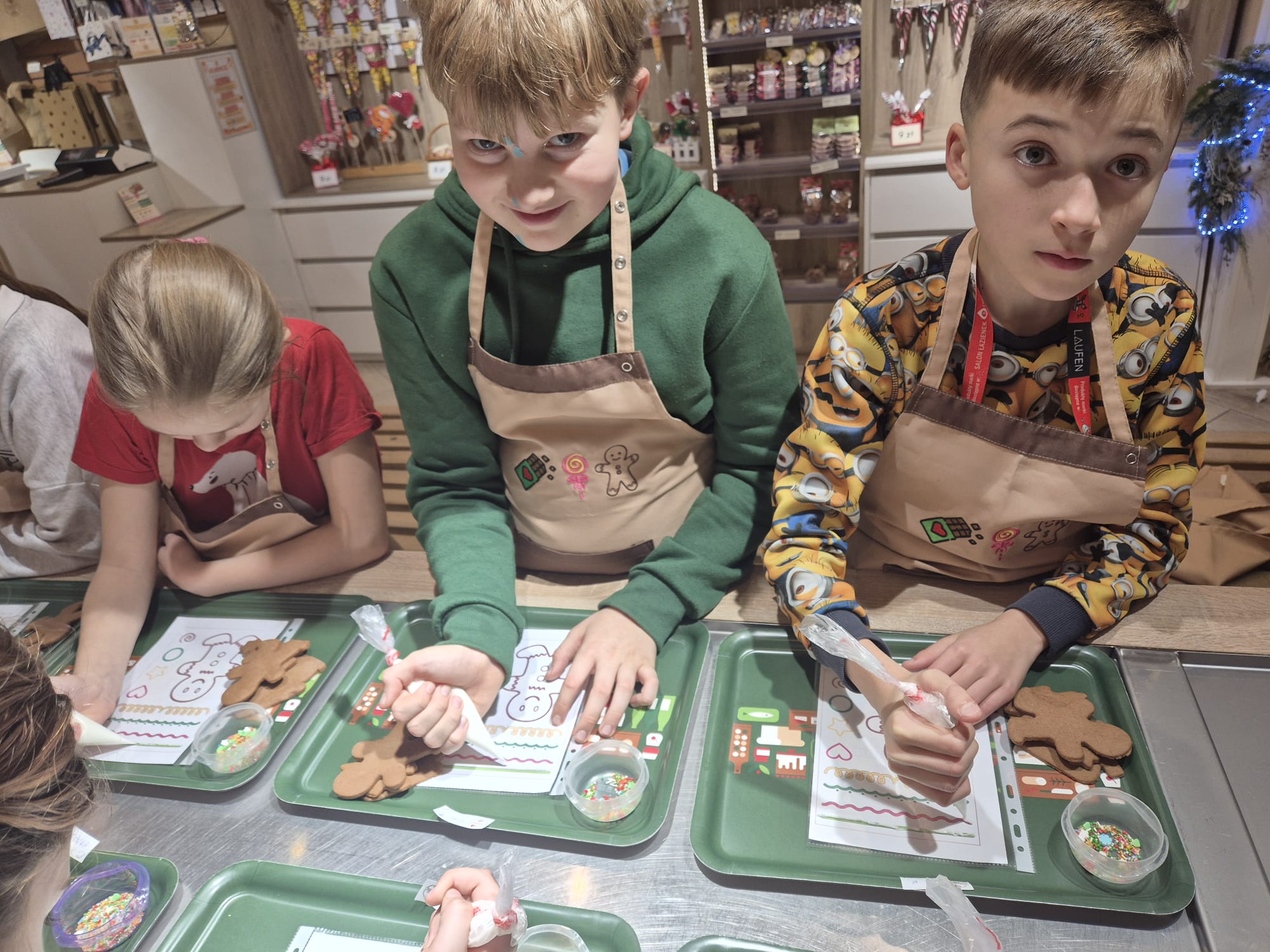 17 grudnia klasa 5a wybrała się na wycieczkę do Manufaktury Słodyczy „Karmelowa Kraina”. Uczestniczyliśmy w warsztatach, w trakcie których dowiedzieliśmy się, jak wygląda proces produkcyjny pierników. Panie w ciekawy sposób opowiedziały historię piernikarstwa. Uczniowie ręcznie dekorowali pierniki, które zabrali do domu. Każdy swoje pierniki dekorował z ogromną starannością i zaangażowaniem: lukrem królewskim, posypkami. Bardzo nam się podobało – było kolorowo, pysznie i mega ciekawie.