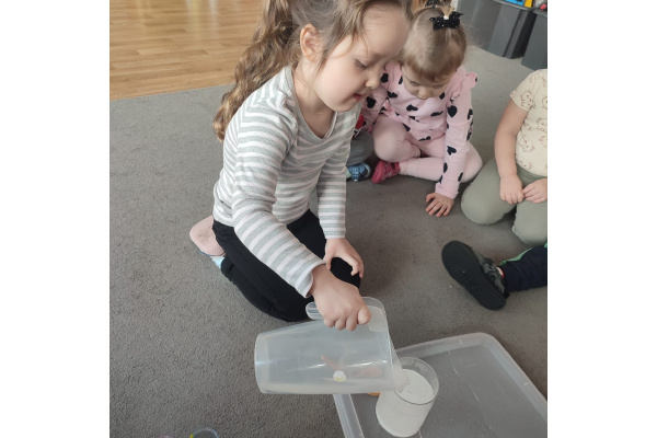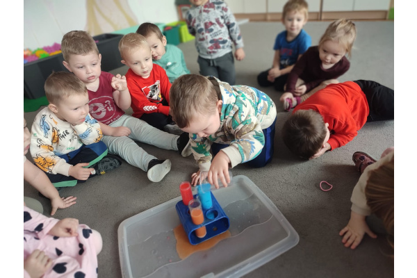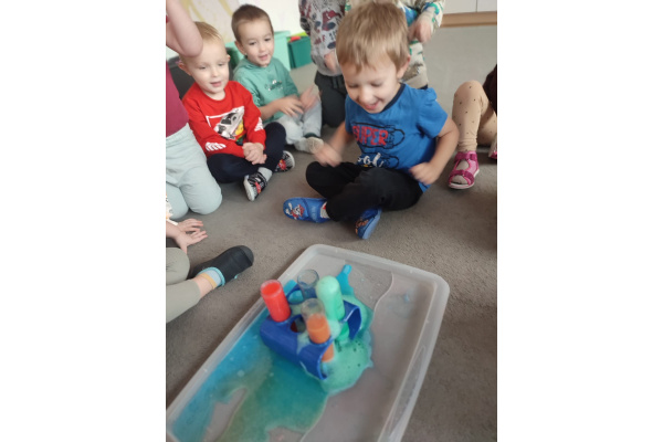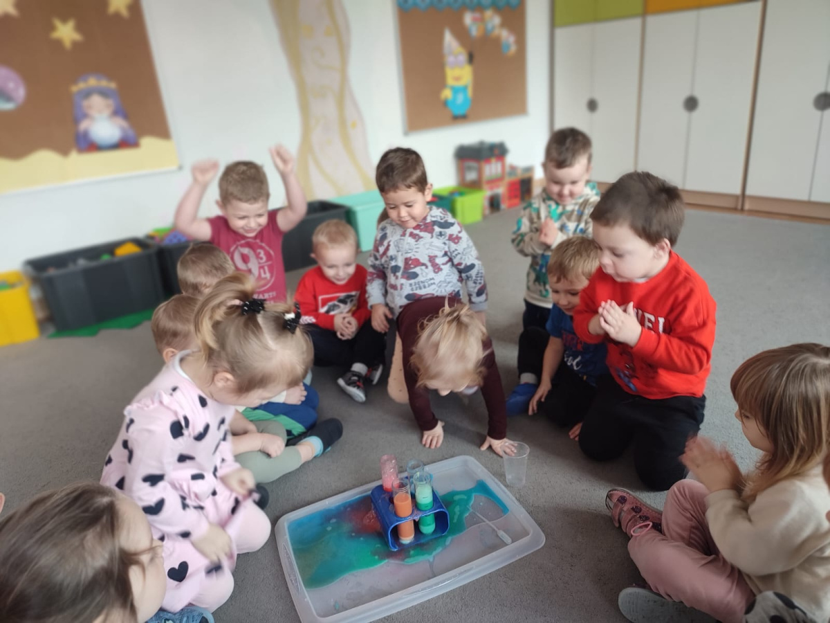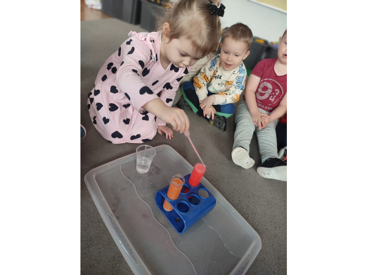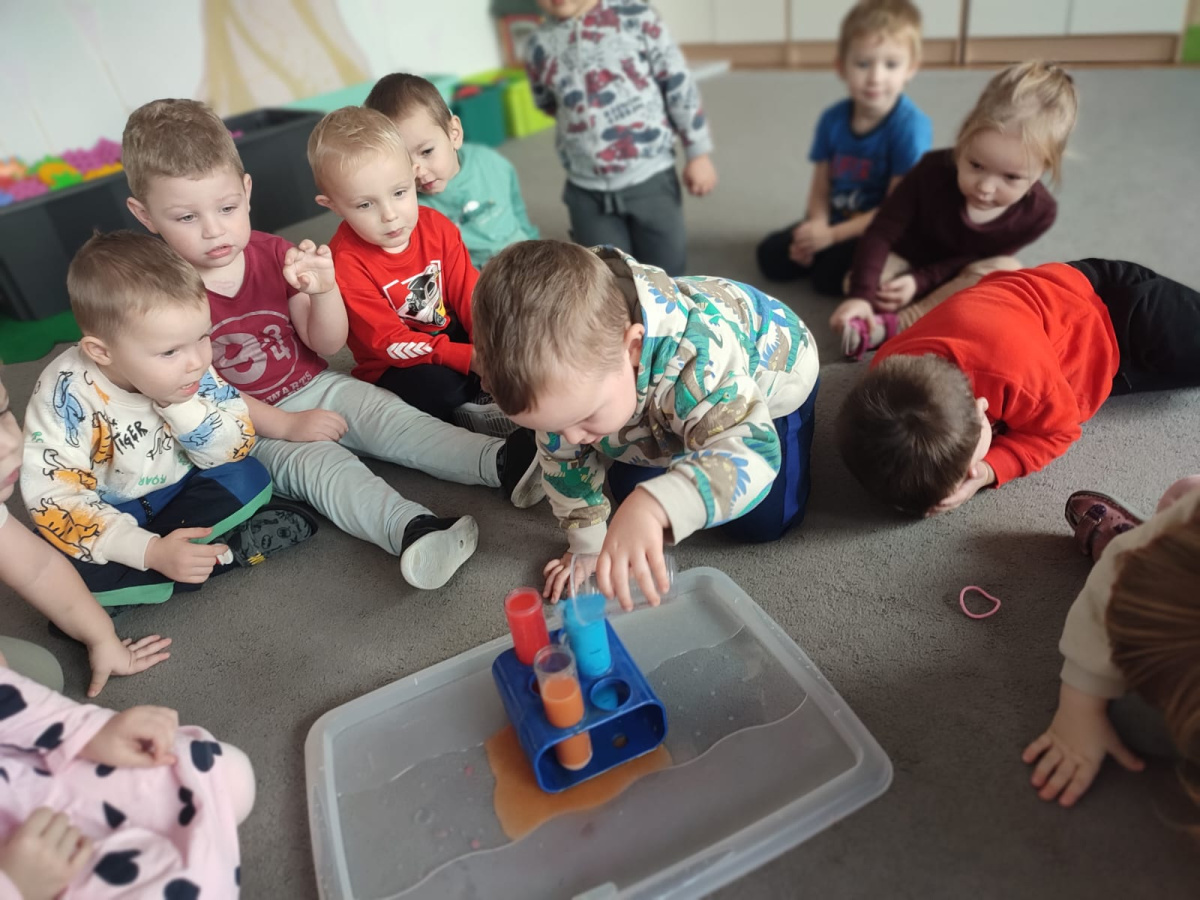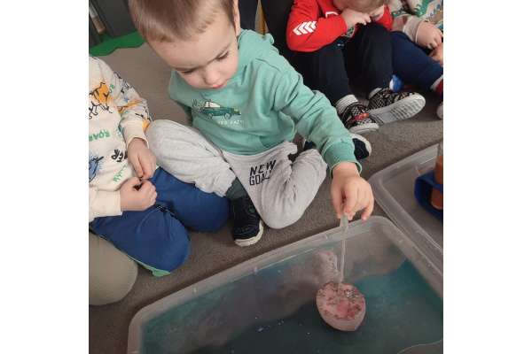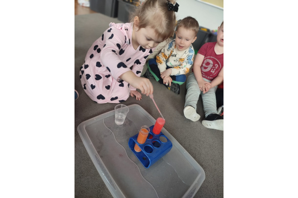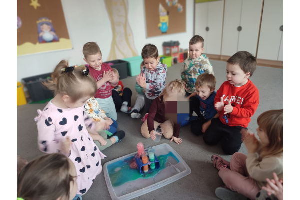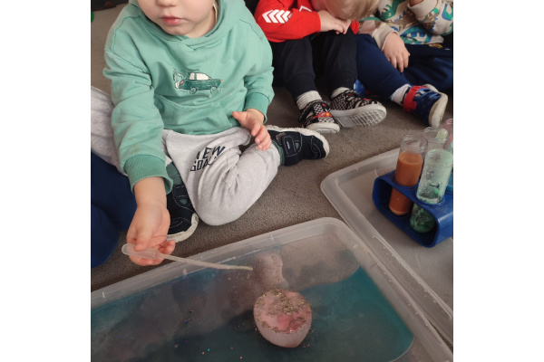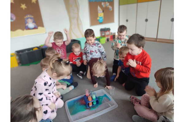 Dzieci uczestniczyły w zabawach badawczych, podczas których mogły obserwować zmiany zachodzące w prostych doświadczeniach.