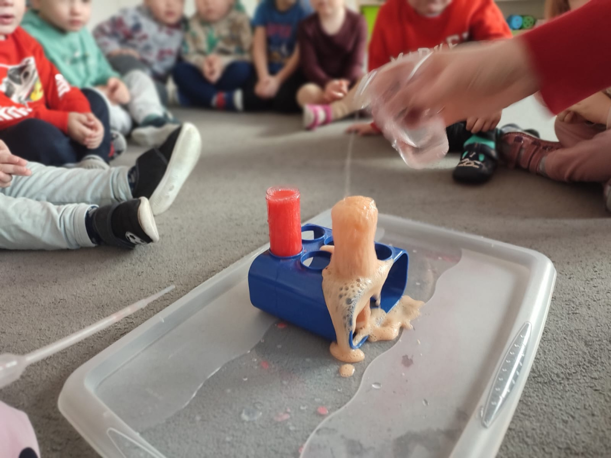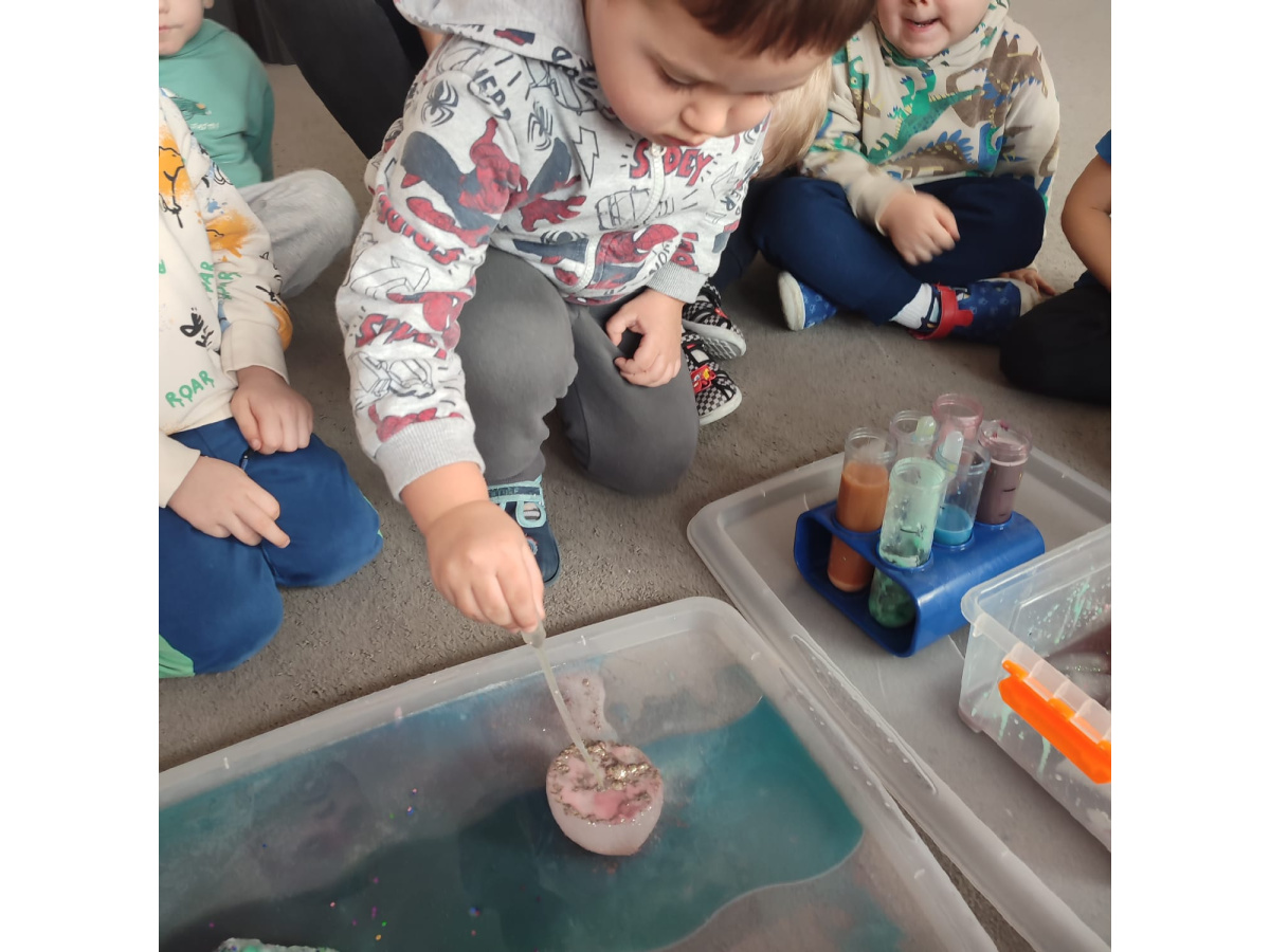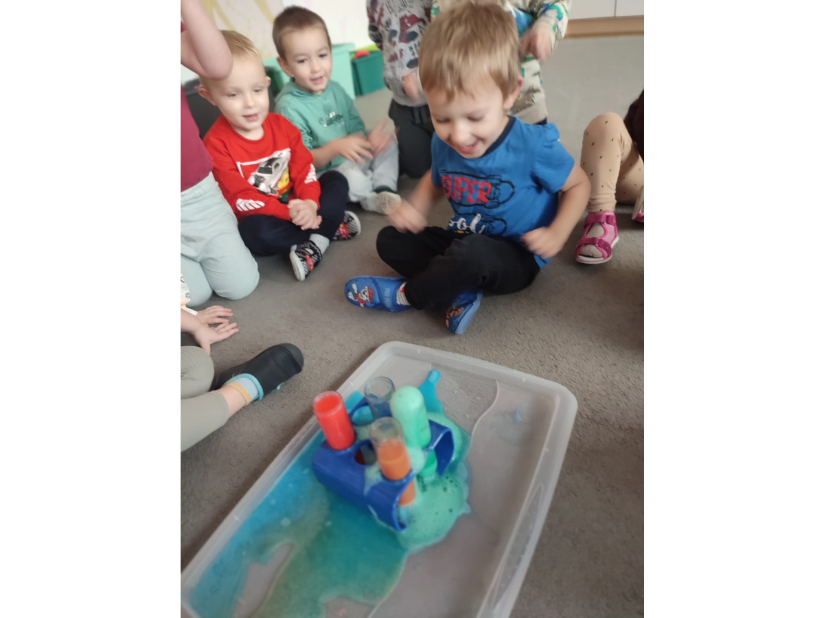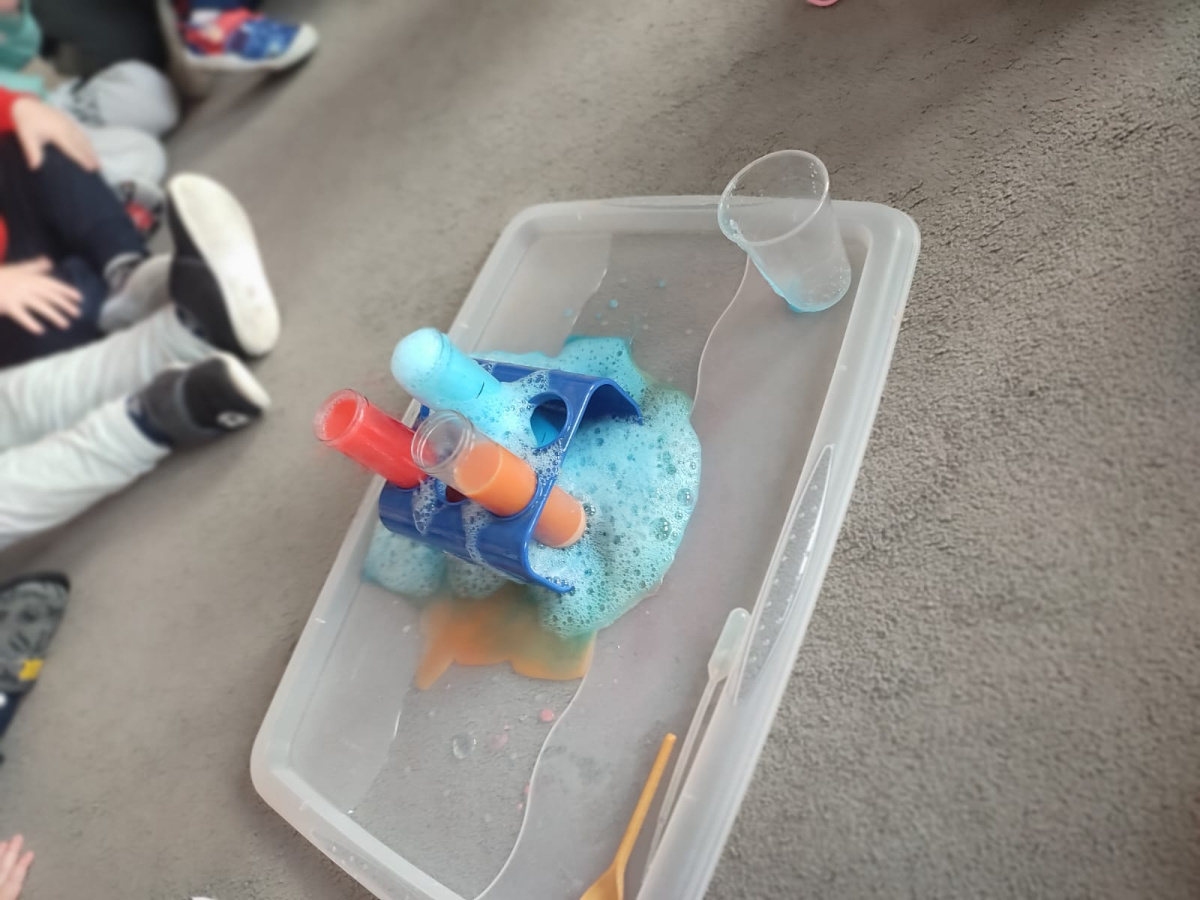 Nie zabrakło również eksperymentów sensorycznych, które pozwoliły dzieciom rozwijać zmysły poprzez dotyk, zapach i obserwację. Kolorowa piana, pachnące mikstury dostarczyły mnóstwo frajdy i pobudziły dziecięcą ciekawość.