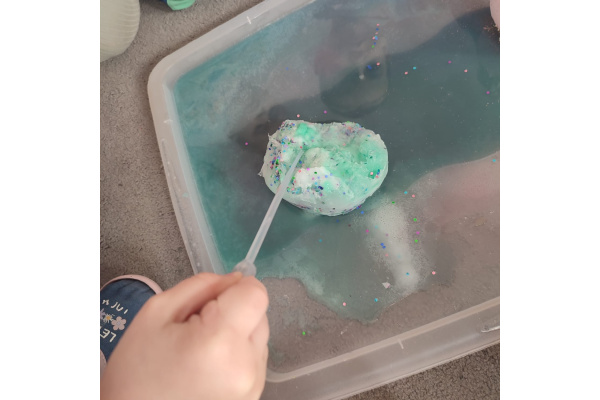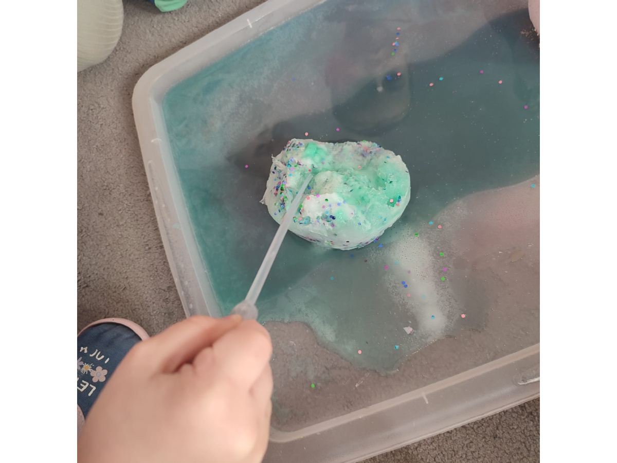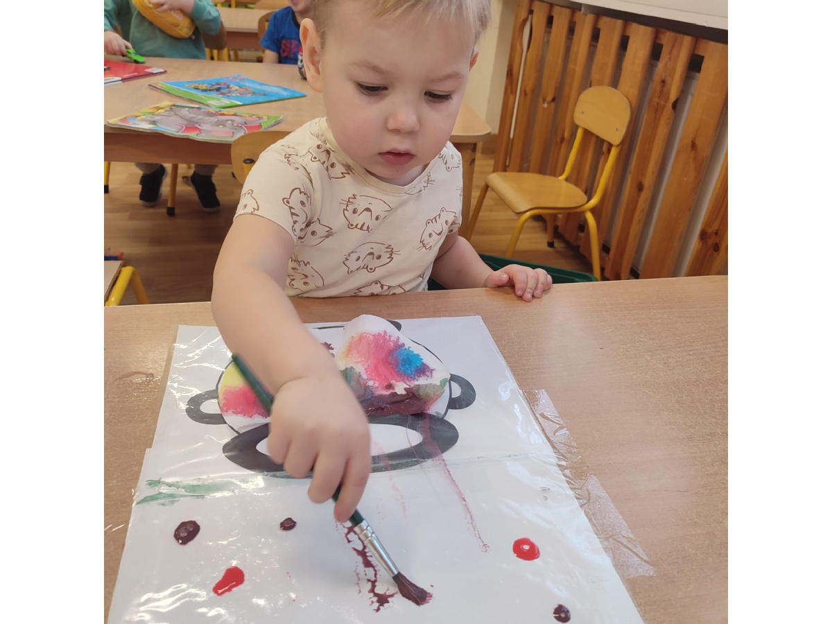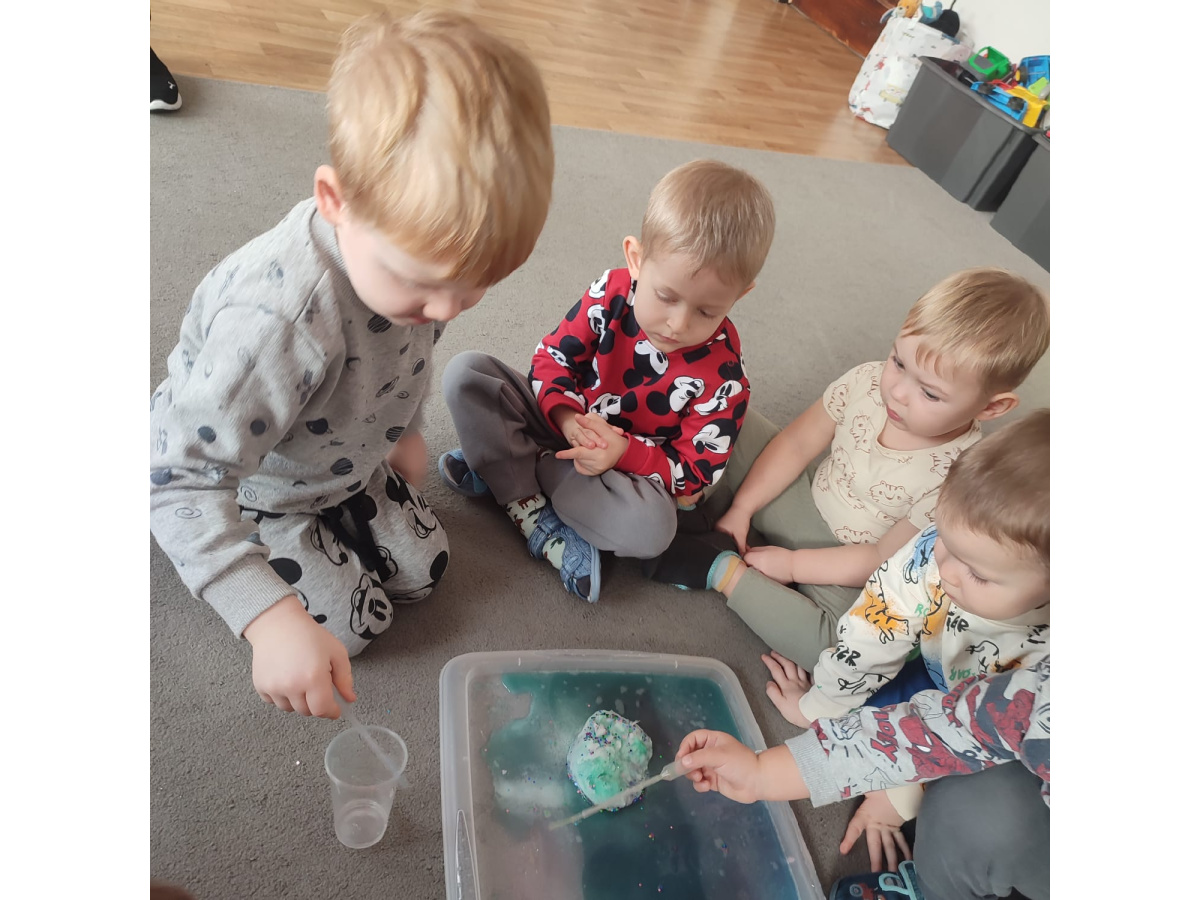 Nie zabrakło również eksperymentów sensorycznych, które pozwoliły dzieciom rozwijać zmysły poprzez dotyk, zapach i obserwację. Kolorowa piana, pachnące mikstury dostarczyły mnóstwo frajdy i pobudziły dziecięcą ciekawość.