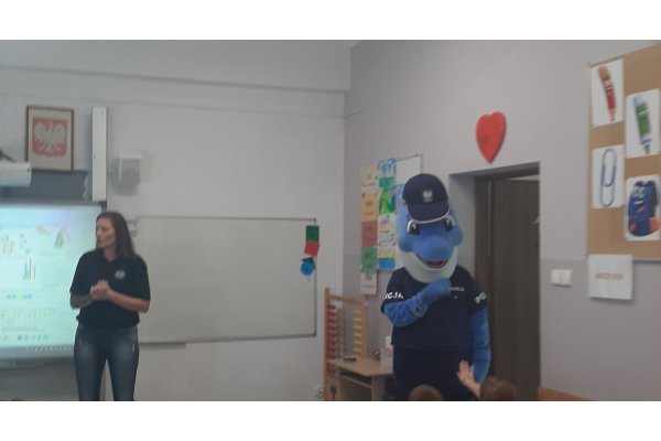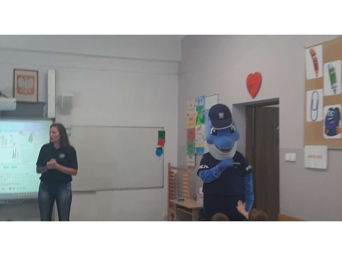 Ucznioiwe klas 1 wzięłi udział w zajęciach profilaktycznych prowadzonych przez Policję oraz policyjną maskotkę Polfinka. Przypomniała zostały zasady bezpieczeństwa podczas drogi do szkoly.