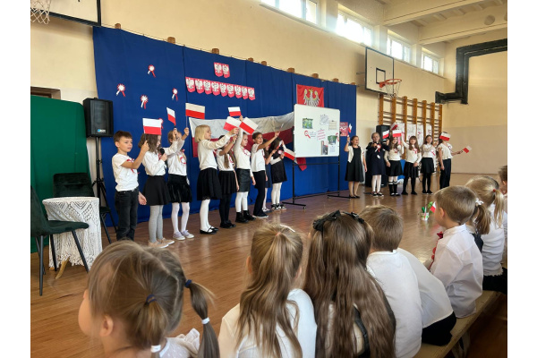 Dnia 7 listopada starszaki z grupy Biedronek wzięły udział w uroczystości z okazji Narodowego Święta Niepodległości, która odbyła się na sali gimnastycznej szkoły.