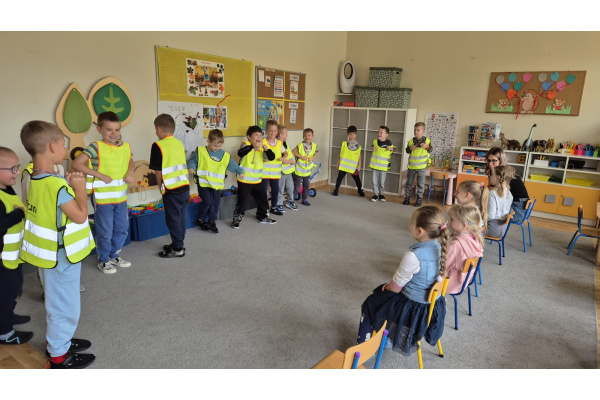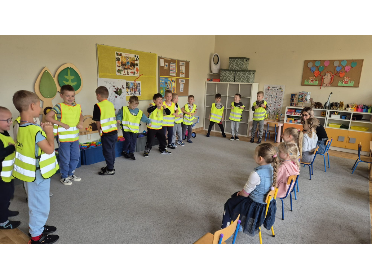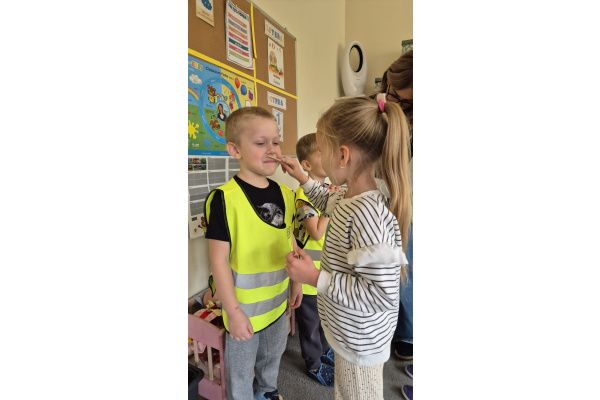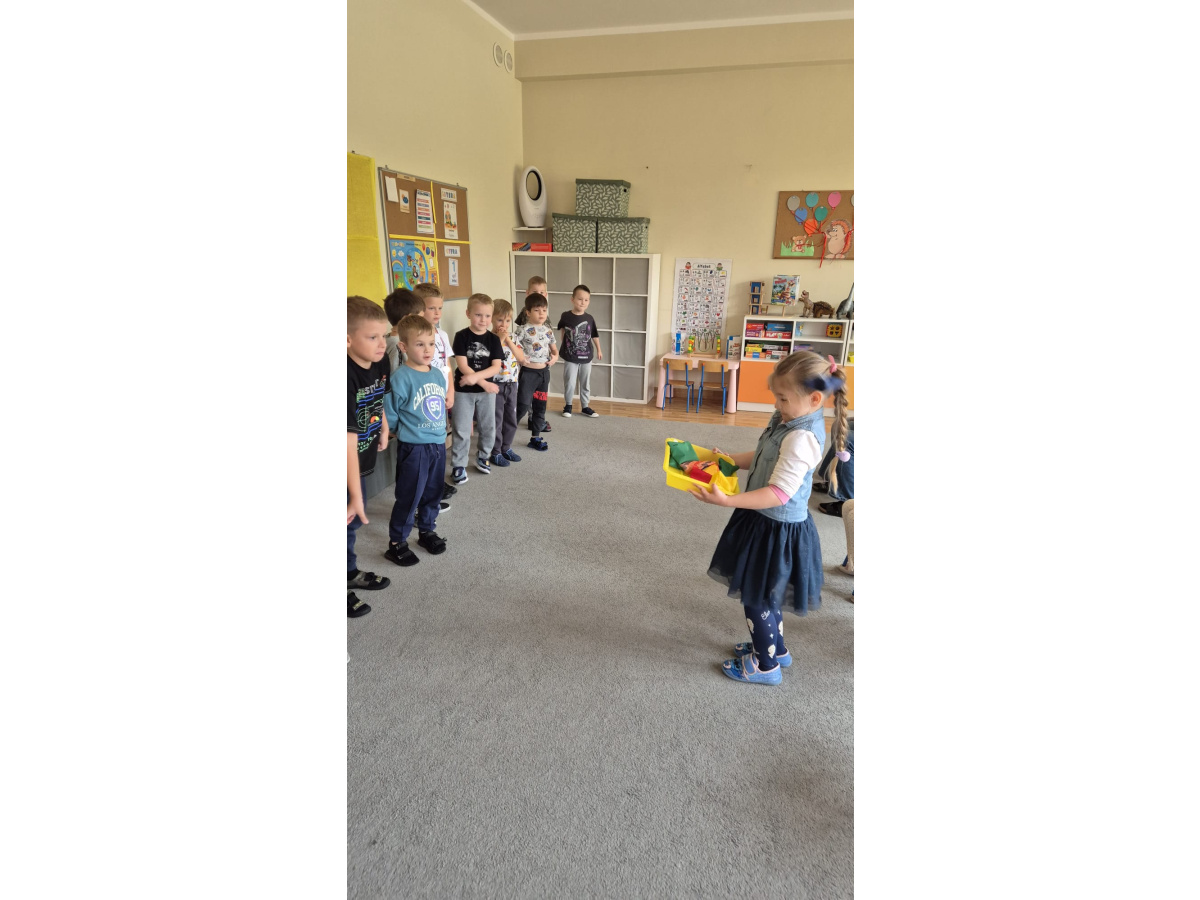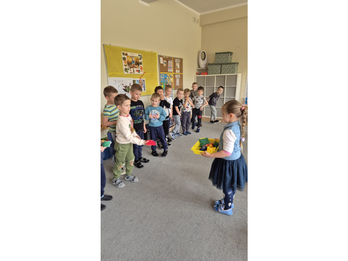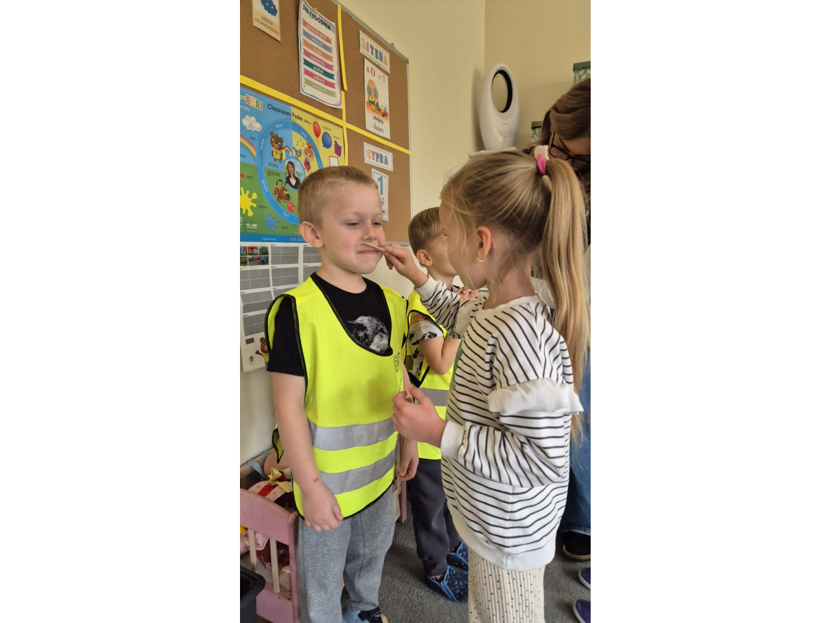 Na początek chłopcy zmierzyli się w konkurencji „Kto pierwszy założy kamizelkę” – emocje sięgały zenitu, a rywalizacja była zacięta! Następnie przyszedł czas na taneczne popisy – każdy z chłopców zaprezentował swój układ do znanej melodii „Kaczuszki”. Jury, czyli nasze urocze dziewczynki, miały trudne zadanie, bo wszyscy tancerze spisali się znakomicie!