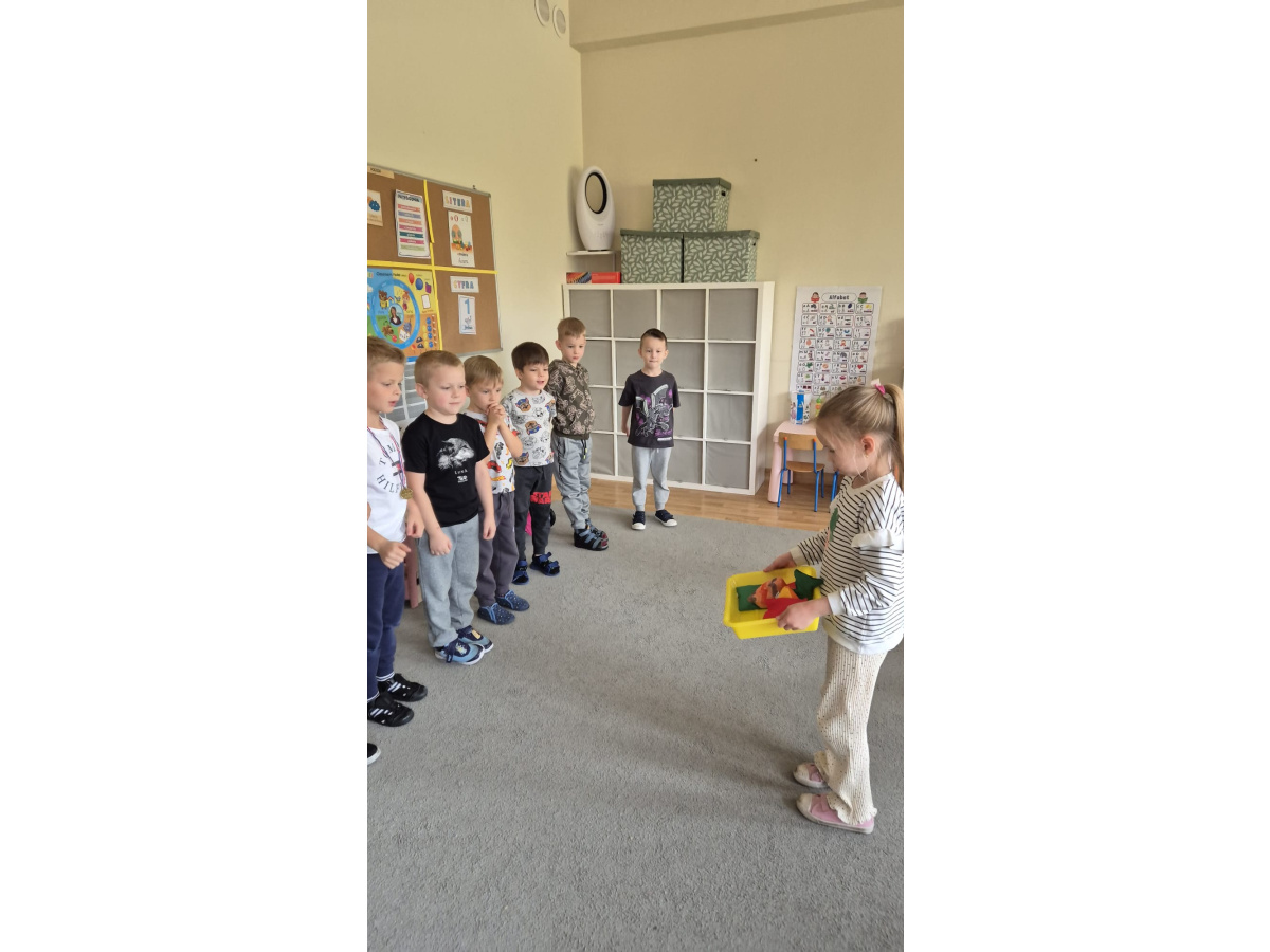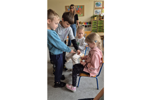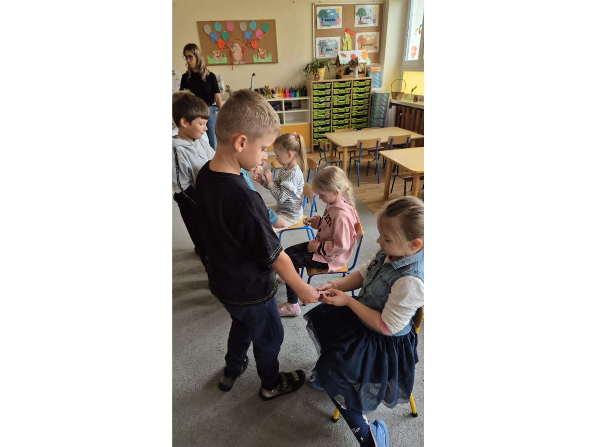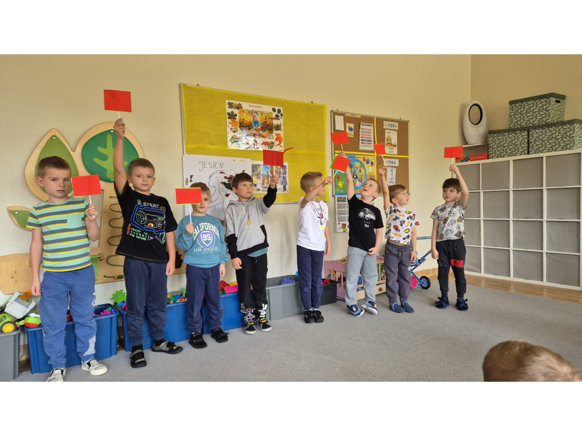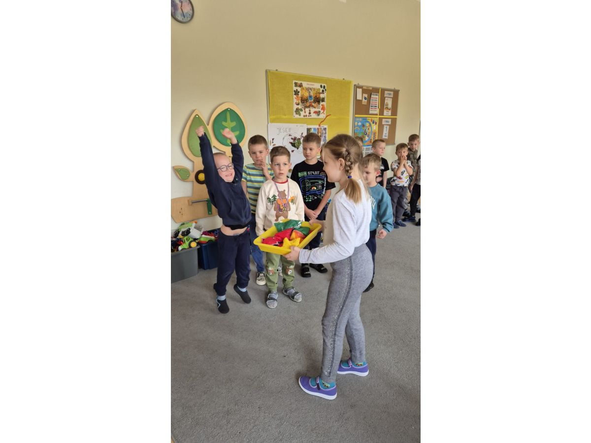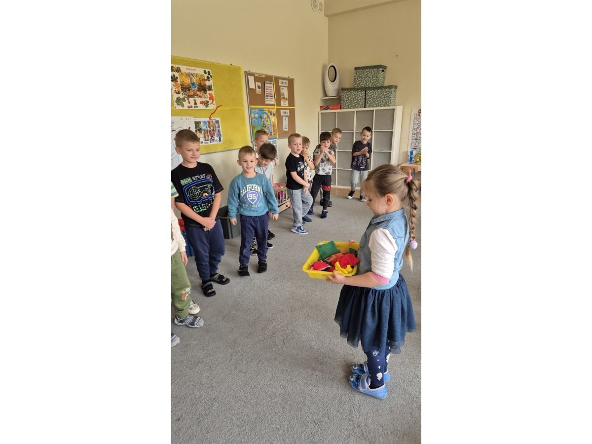 Na początek chłopcy zmierzyli się w konkurencji „Kto pierwszy założy kamizelkę” – emocje sięgały zenitu, a rywalizacja była zacięta! Następnie przyszedł czas na taneczne popisy – każdy z chłopców zaprezentował swój układ do znanej melodii „Kaczuszki”. Jury, czyli nasze urocze dziewczynki, miały trudne zadanie, bo wszyscy tancerze spisali się znakomicie!