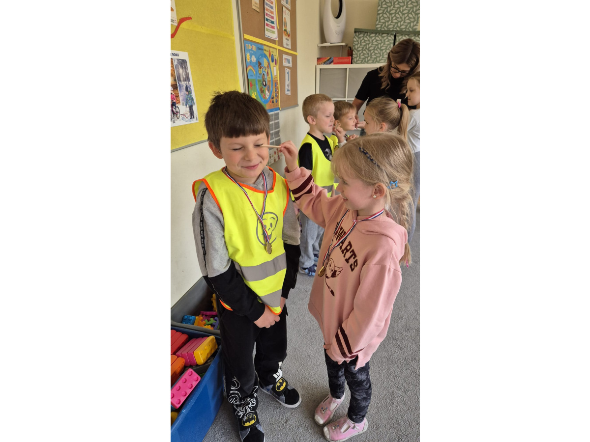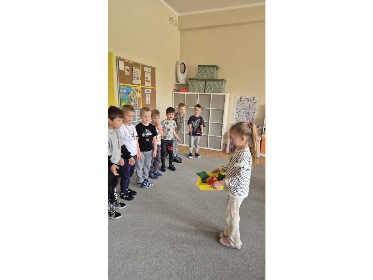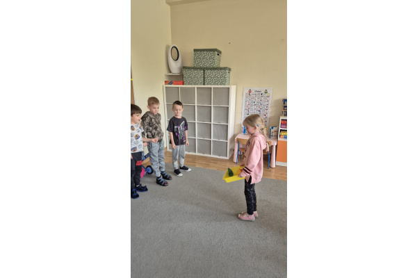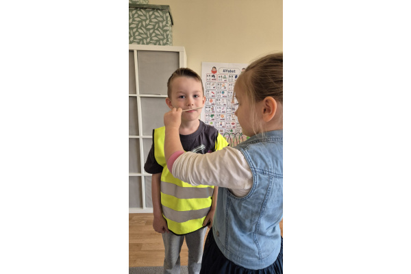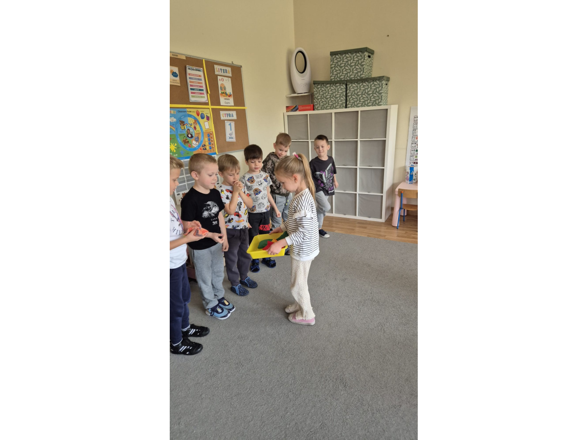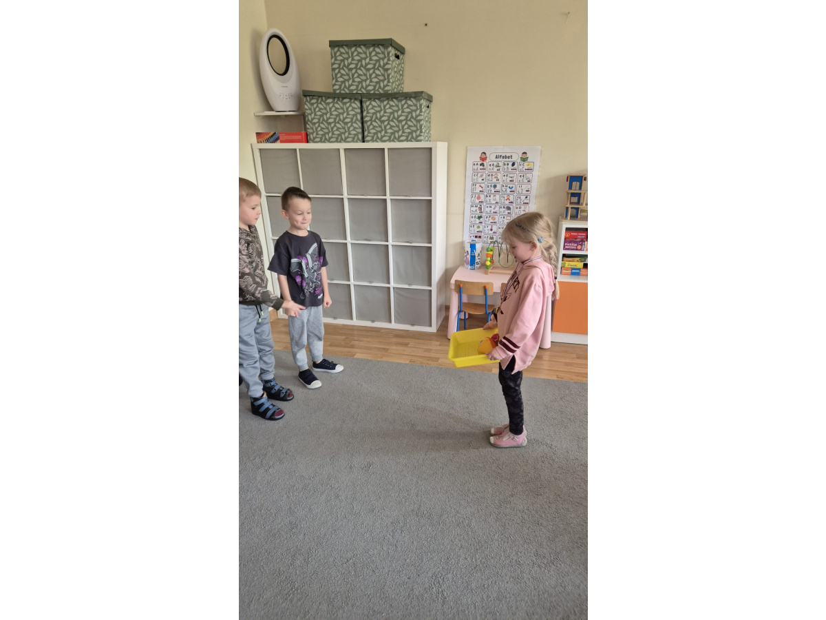 Na początek chłopcy zmierzyli się w konkurencji „Kto pierwszy założy kamizelkę” – emocje sięgały zenitu, a rywalizacja była zacięta! Następnie przyszedł czas na taneczne popisy – każdy z chłopców zaprezentował swój układ do znanej melodii „Kaczuszki”. Jury, czyli nasze urocze dziewczynki, miały trudne zadanie, bo wszyscy tancerze spisali się znakomicie!