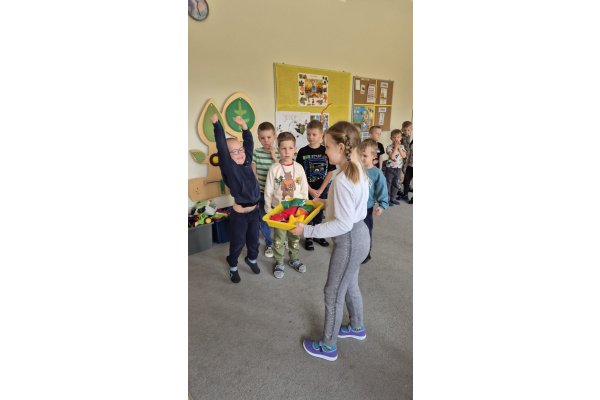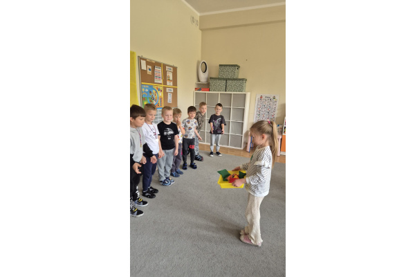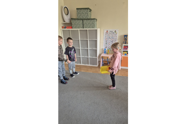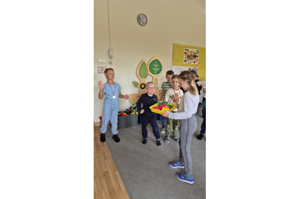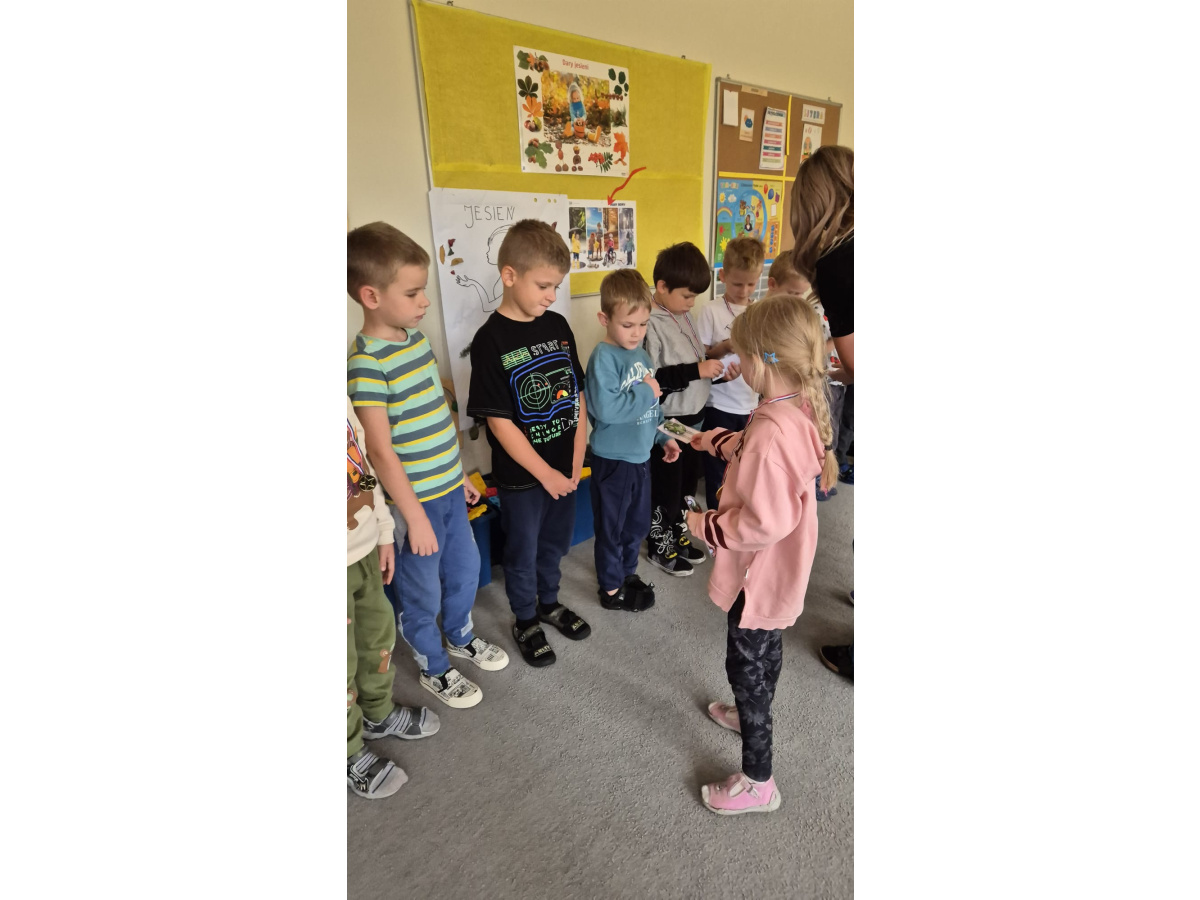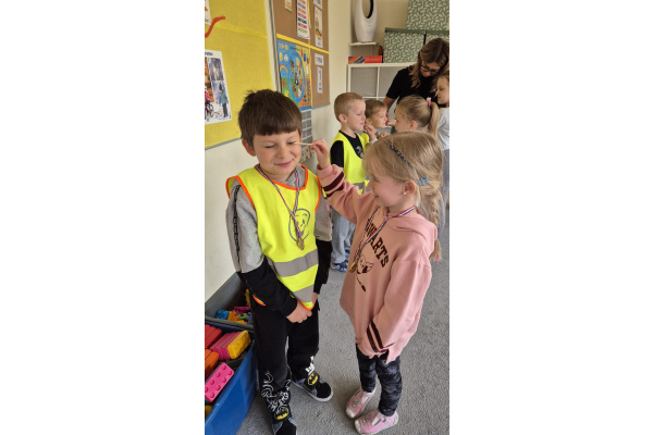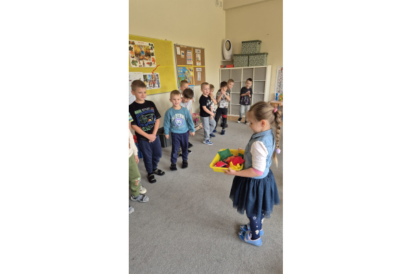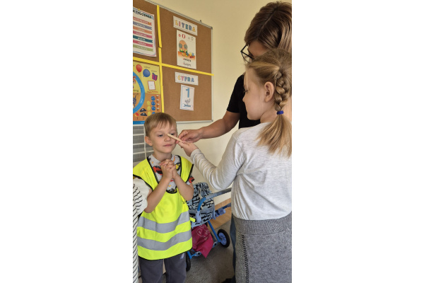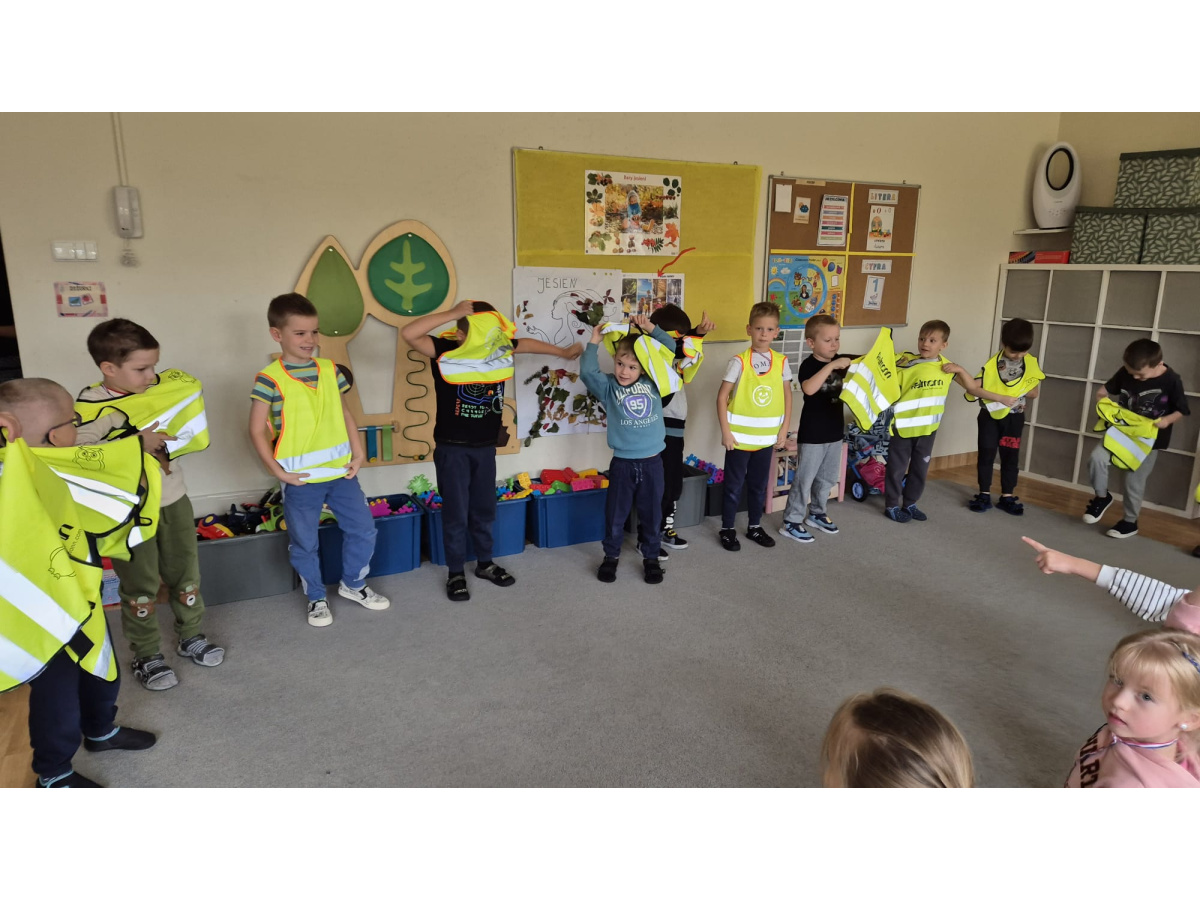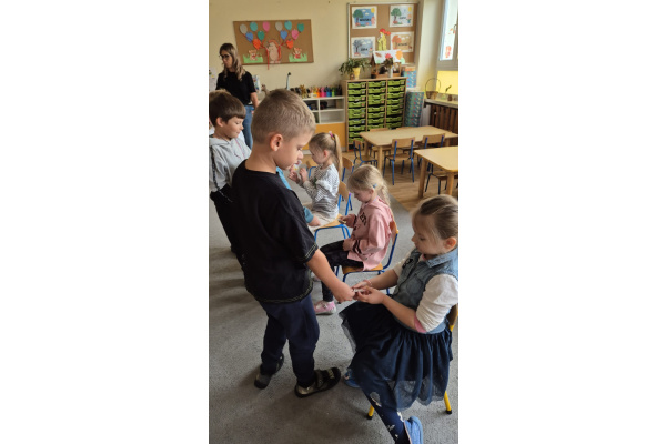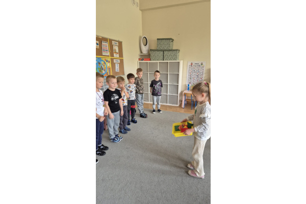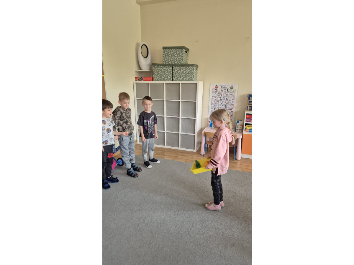 Na początek chłopcy zmierzyli się w konkurencji „Kto pierwszy założy kamizelkę” – emocje sięgały zenitu, a rywalizacja była zacięta! Następnie przyszedł czas na taneczne popisy – każdy z chłopców zaprezentował swój układ do znanej melodii „Kaczuszki”. Jury, czyli nasze urocze dziewczynki, miały trudne zadanie, bo wszyscy tancerze spisali się znakomicie!