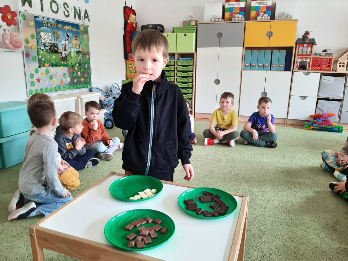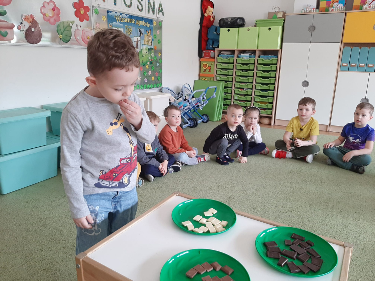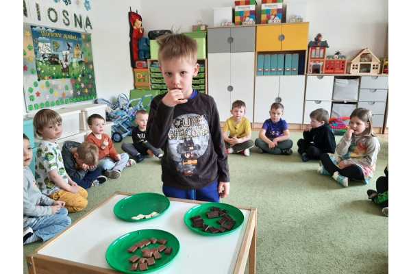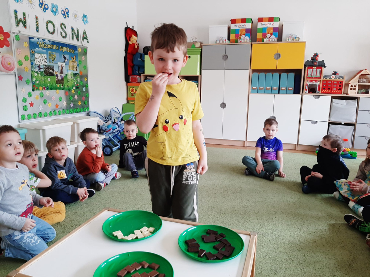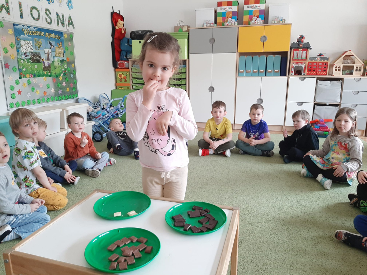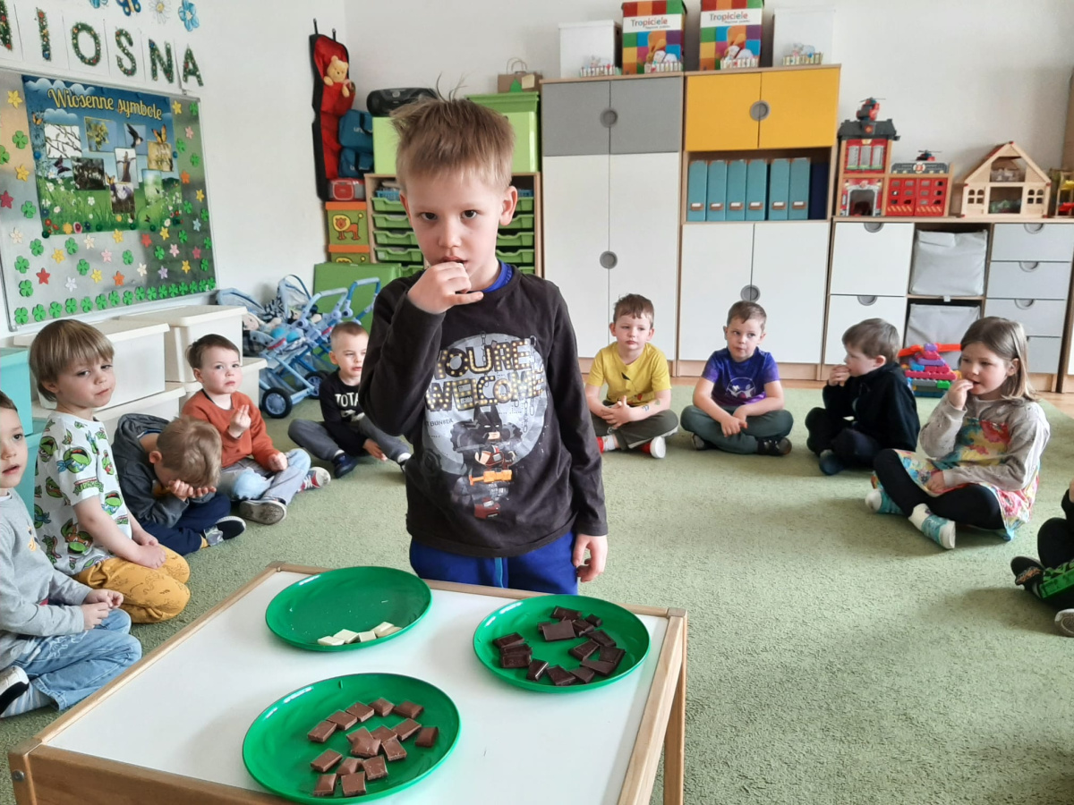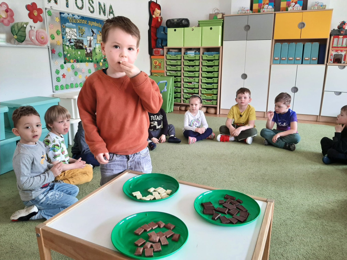 Nie zabrakło także degustacji – przedszkolaki próbowały różnych rodzajów czekolady i poznawały ich smaki.