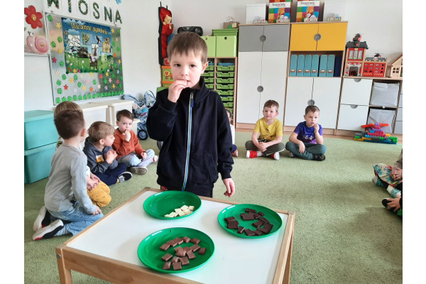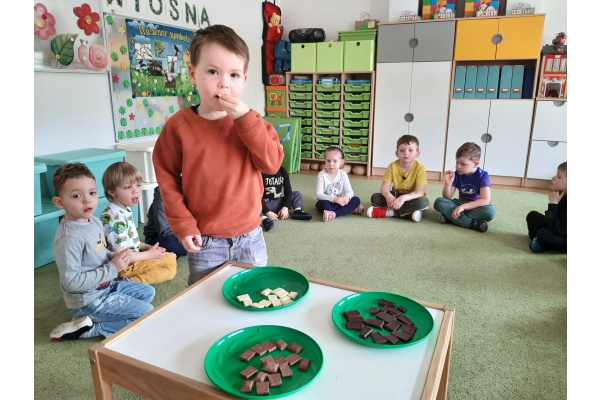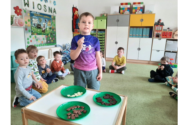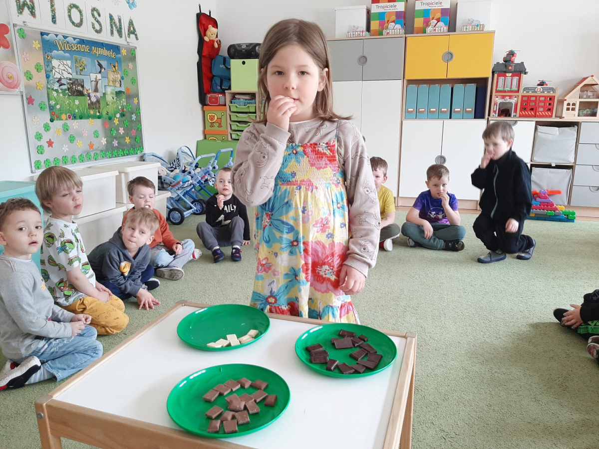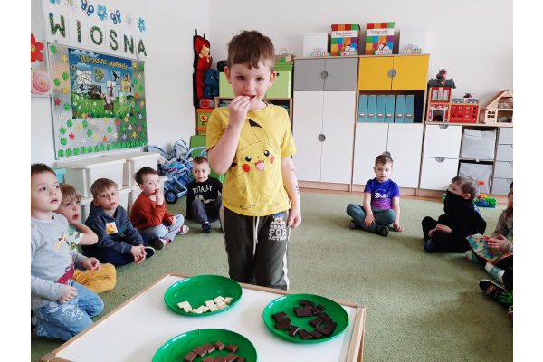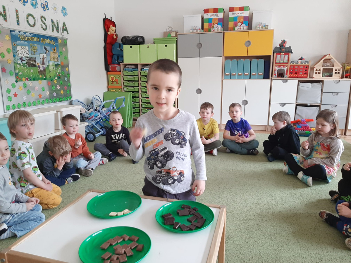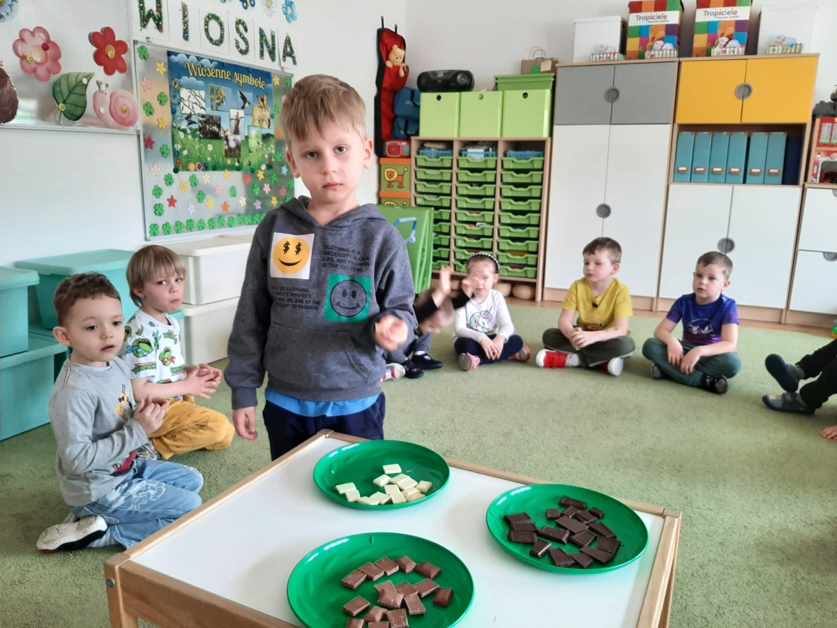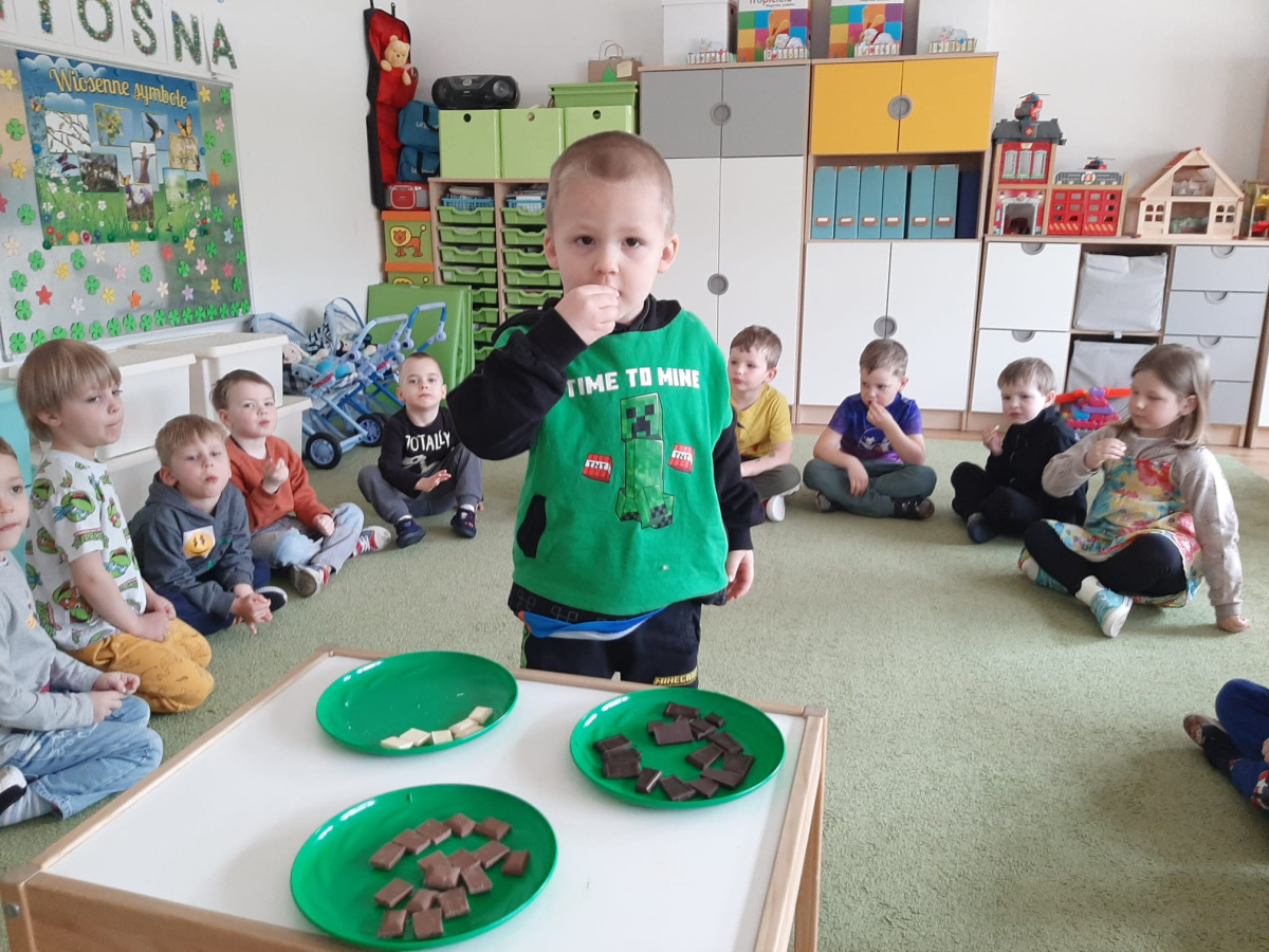Nie zabrakło także degustacji – przedszkolaki próbowały różnych rodzajów czekolady i poznawały ich smaki.