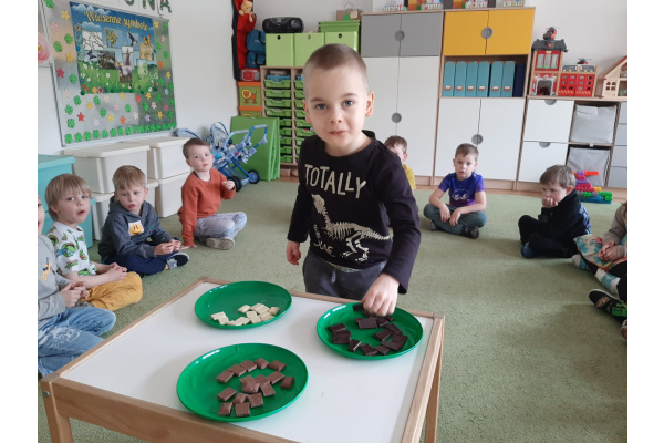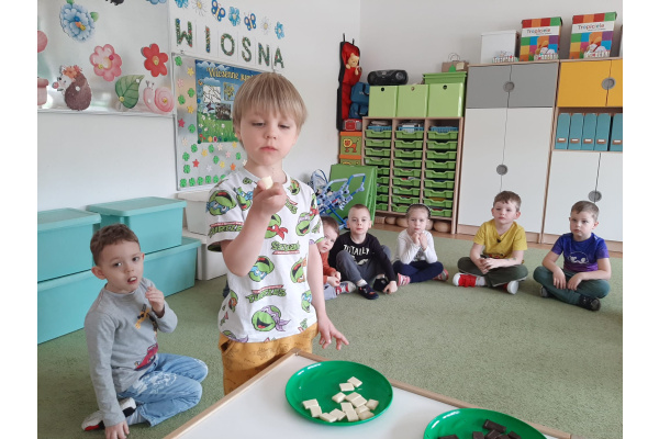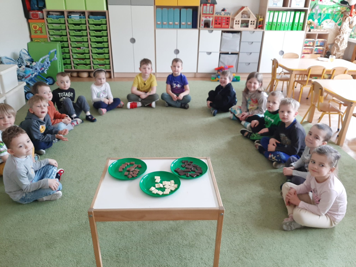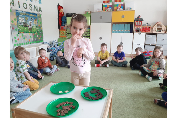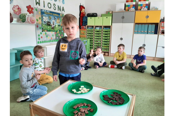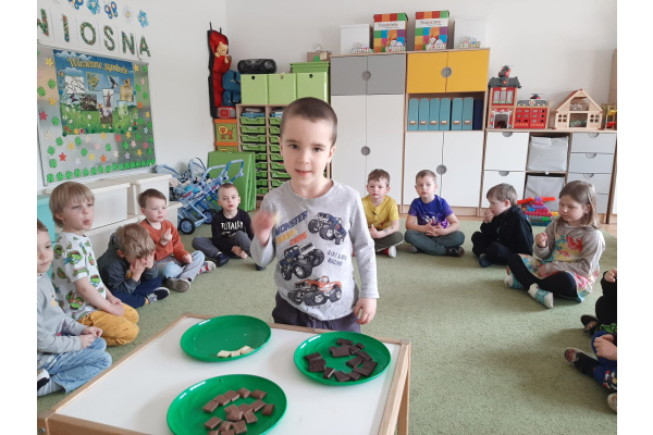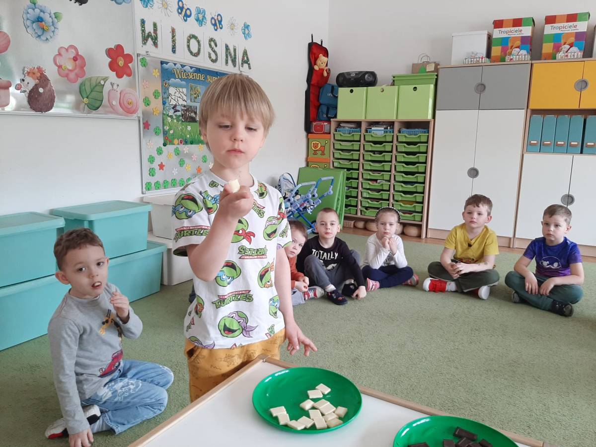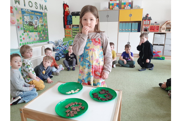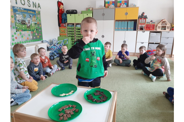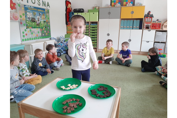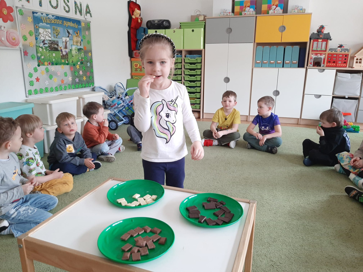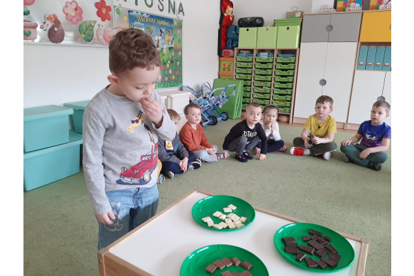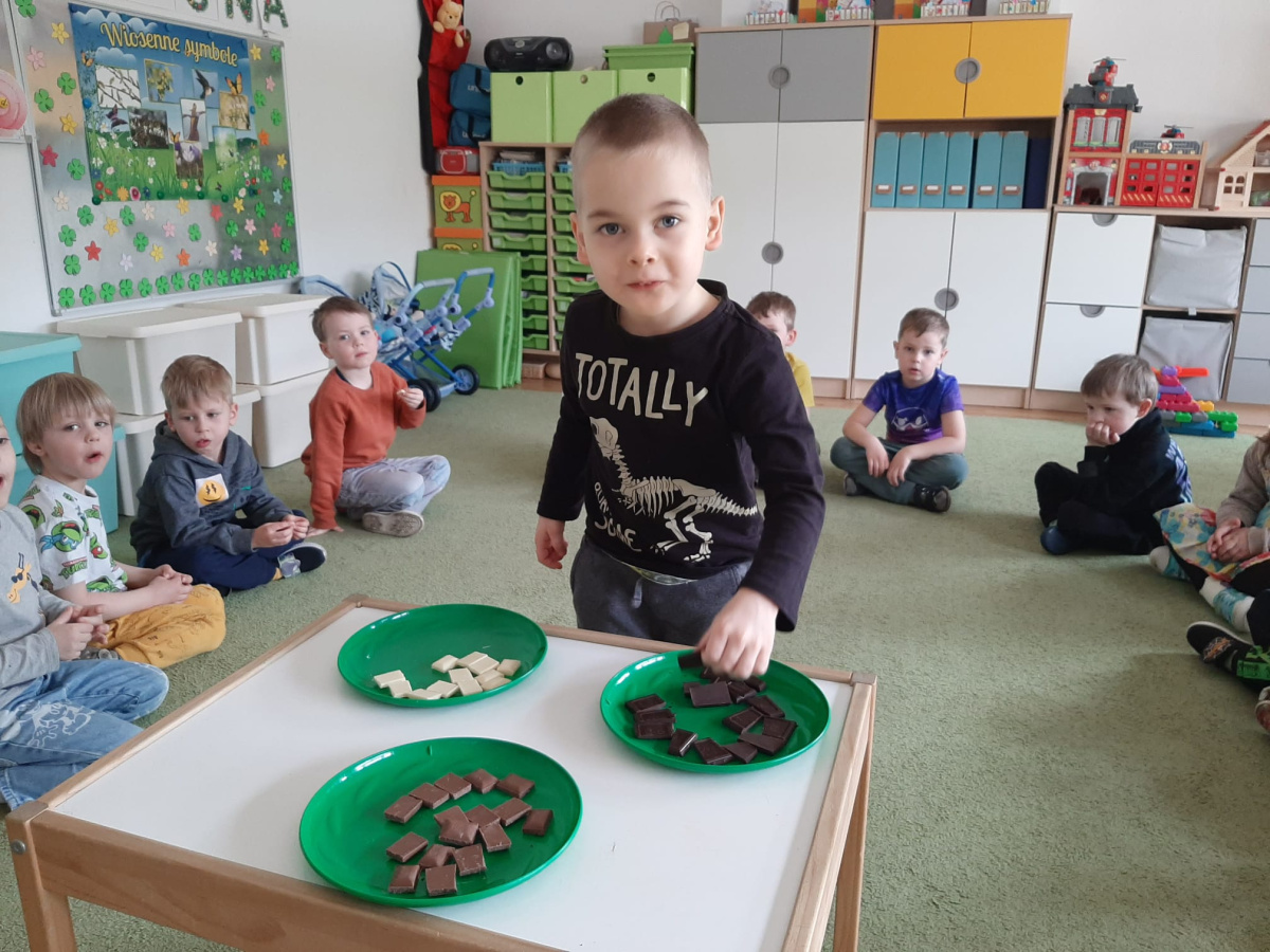 Nie zabrakło także degustacji – przedszkolaki próbowały różnych rodzajów czekolady i poznawały ich smaki.