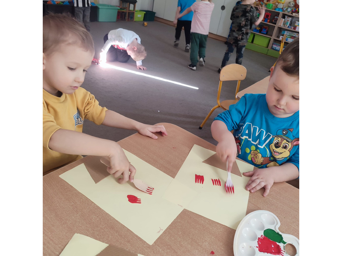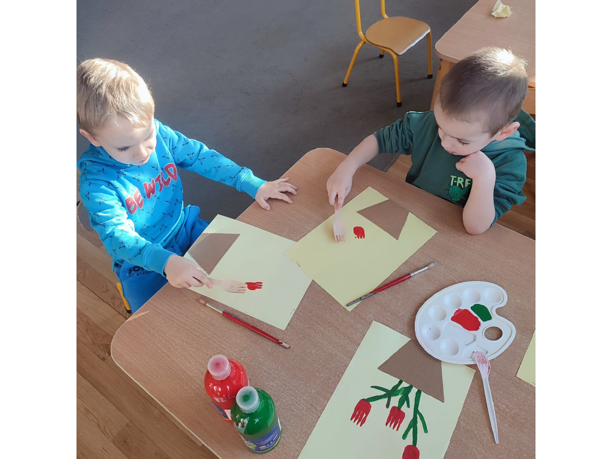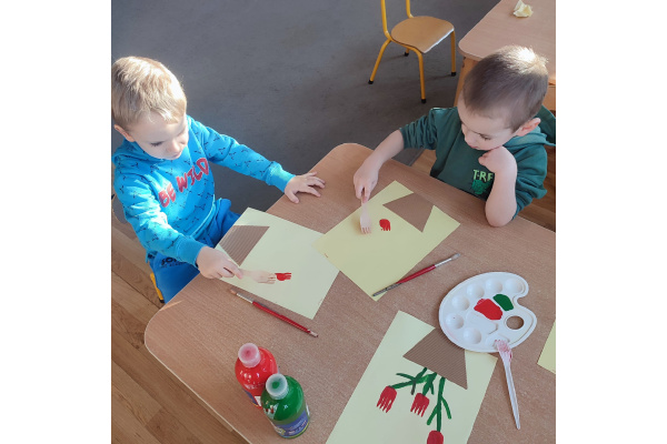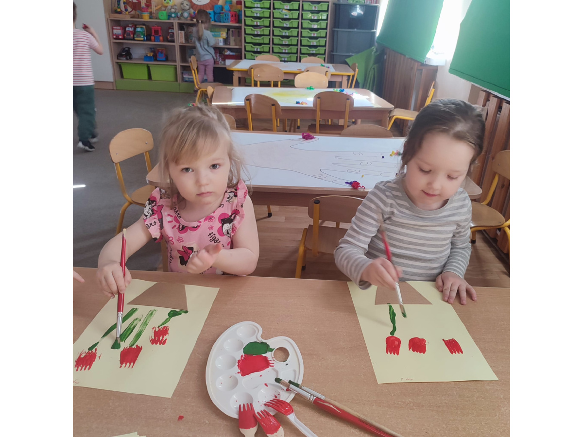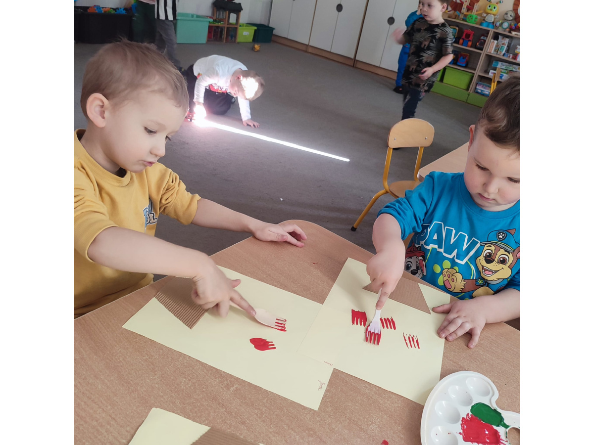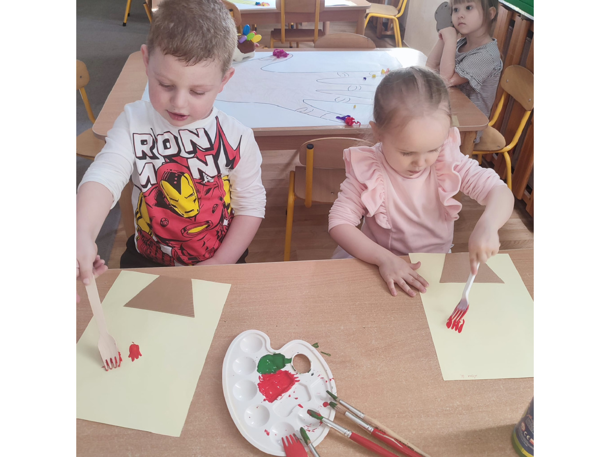 Podczas kolejnej aktywności przedszkolaki tworzyły wiosenne laurki – tulipany malowane widelcem. Nietypowa technika sprawiła dzieciom dużo radości i pozwoliła na twórczą zabawę z farbami.