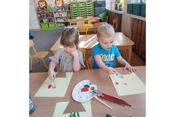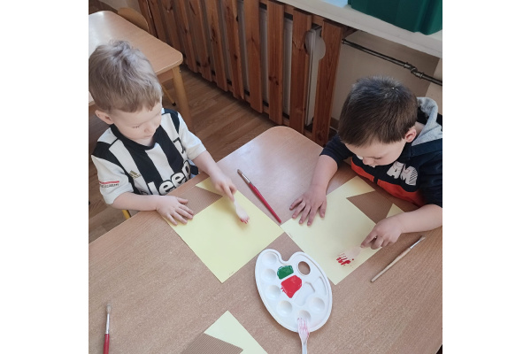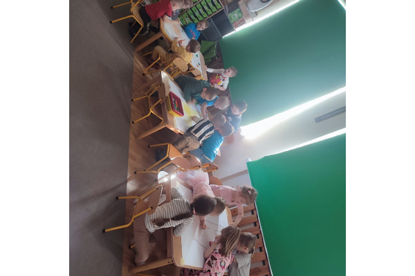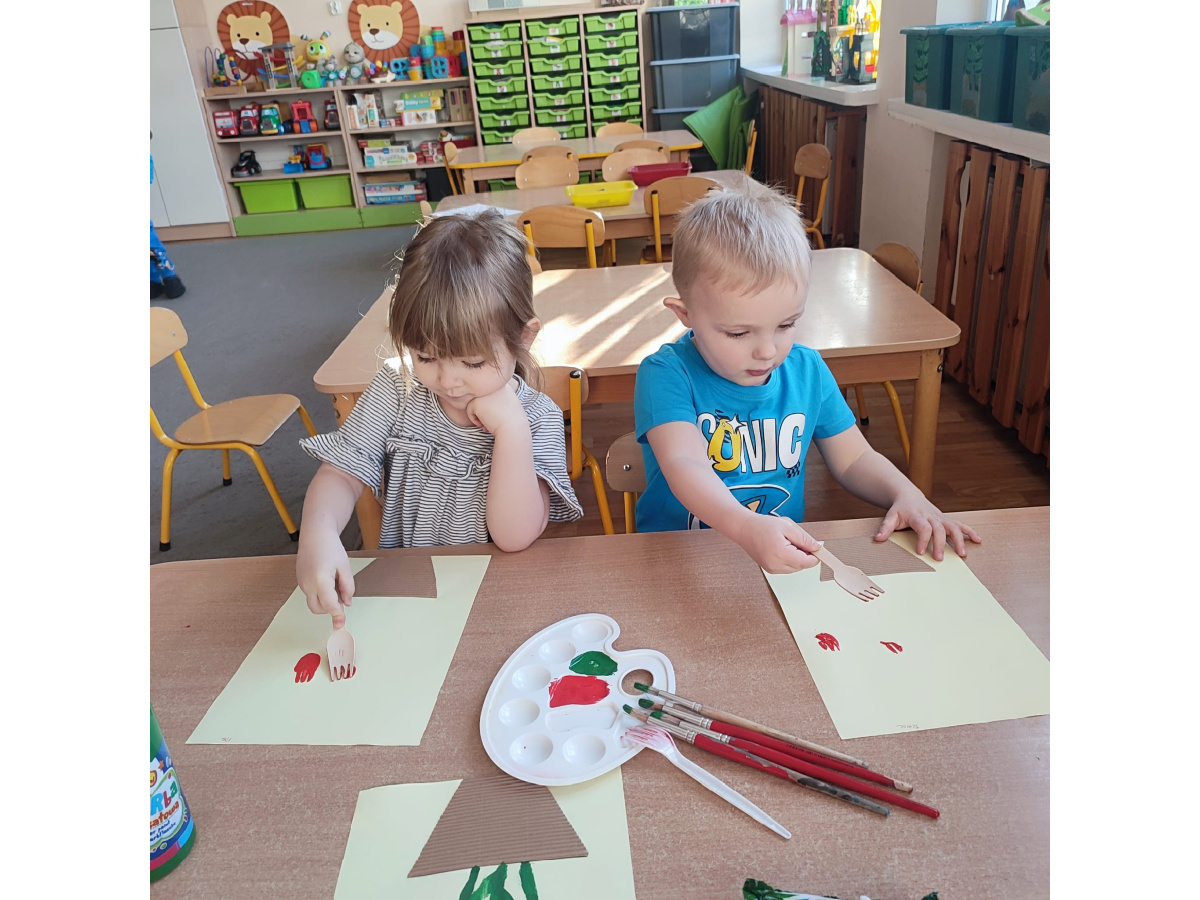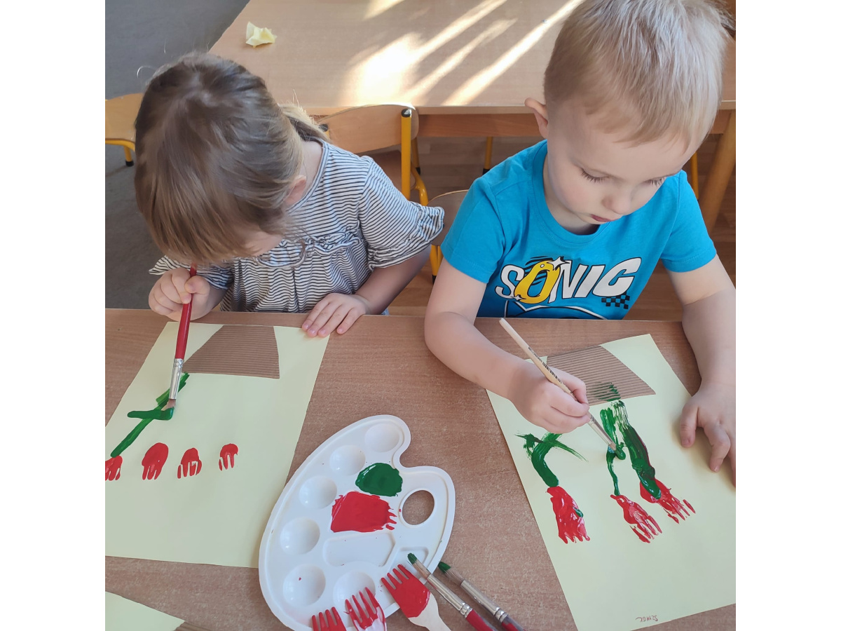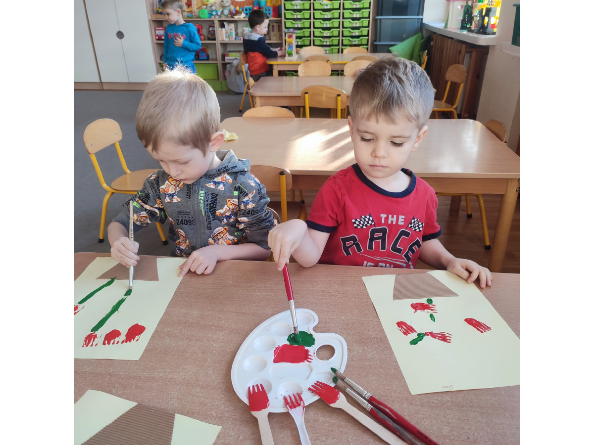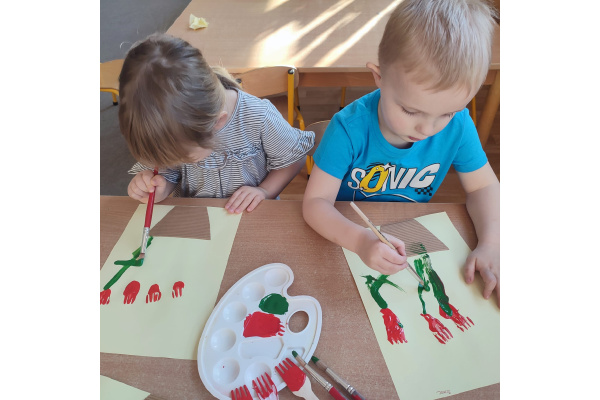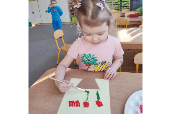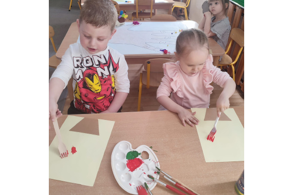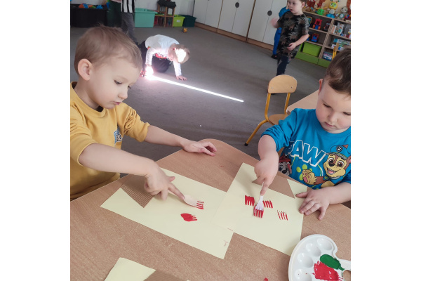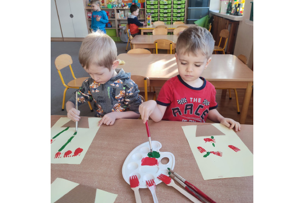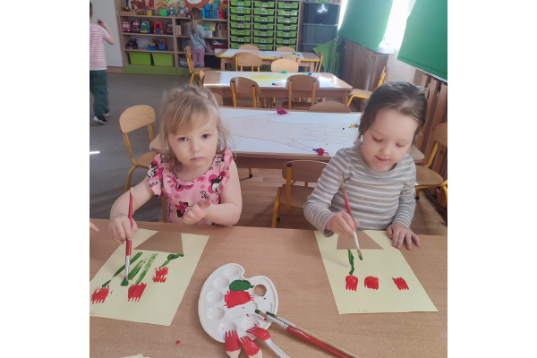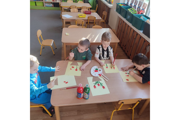 Podczas kolejnej aktywności przedszkolaki tworzyły wiosenne laurki – tulipany malowane widelcem. Nietypowa technika sprawiła dzieciom dużo radości i pozwoliła na twórczą zabawę z farbami.
