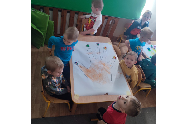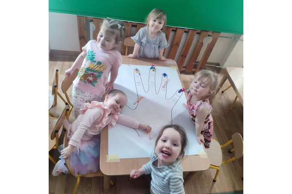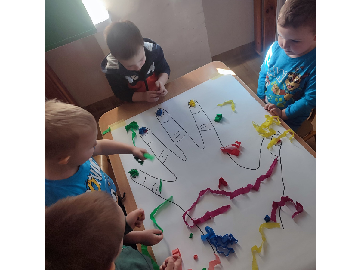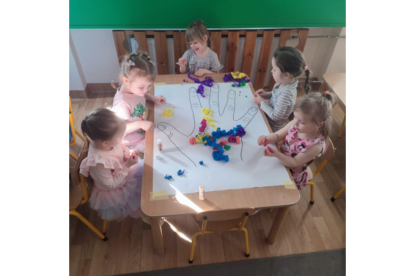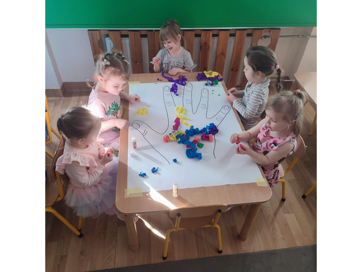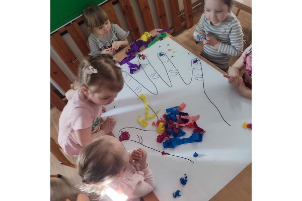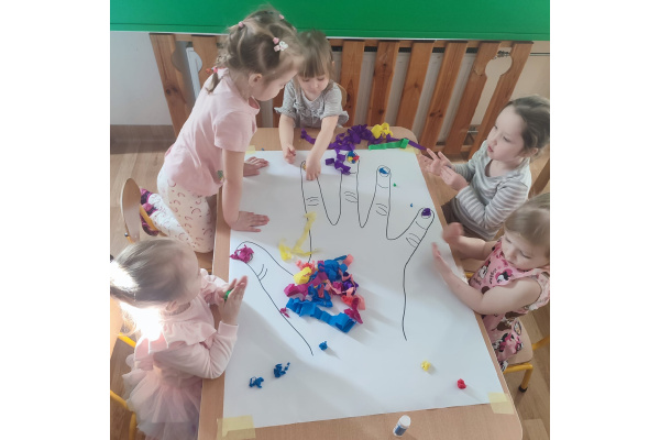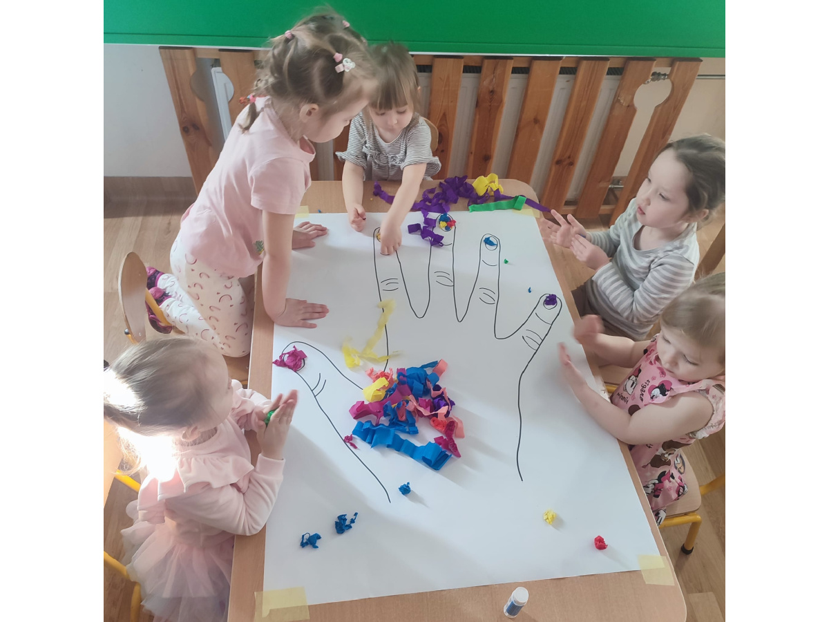 Z okazji Dnia Kobiet nasze 3-latki uczestniczyły w radosnych zajęciach plastycznych. Dzieci wspólnie wyklejały kolorowe paznokcie z krepy rozwijając przy tym swoją kreatywność i sprawność manualną.