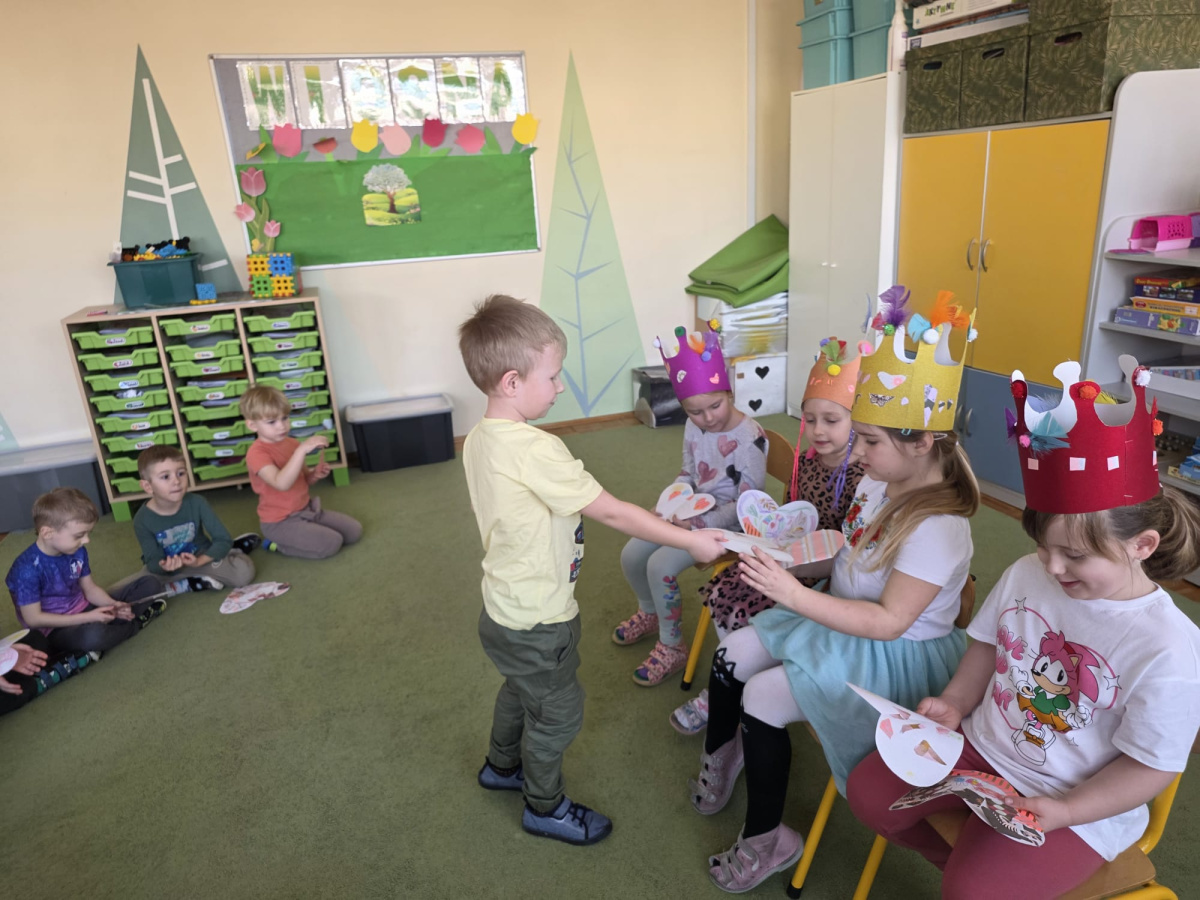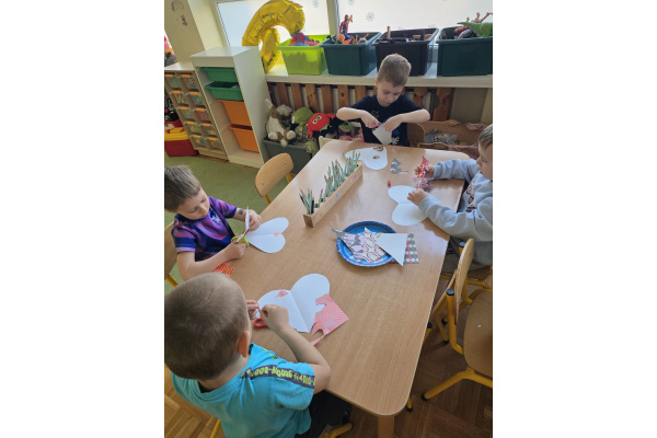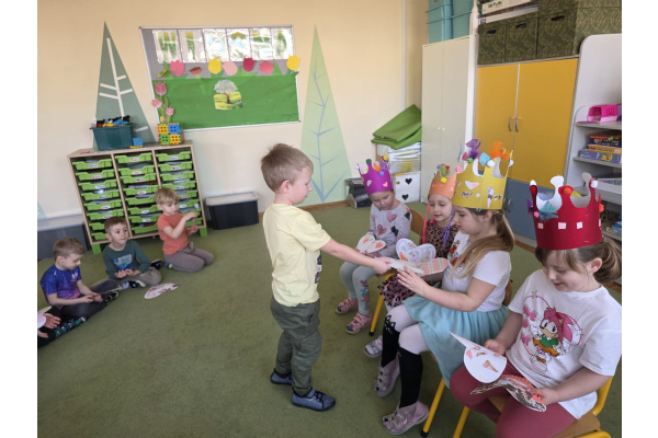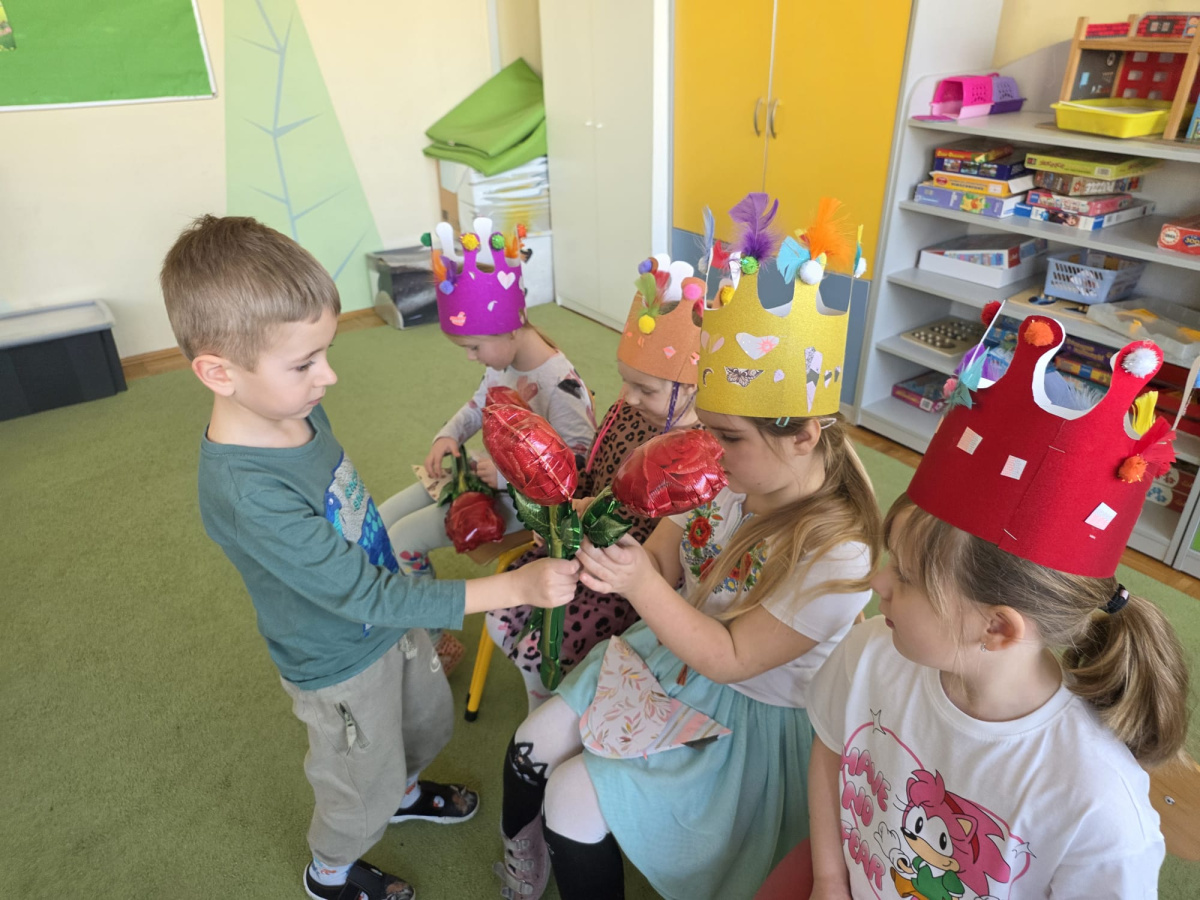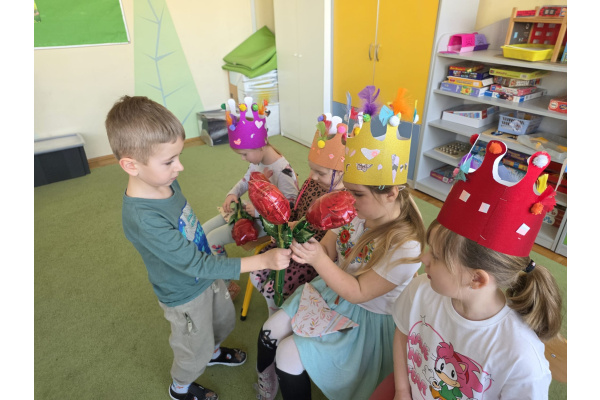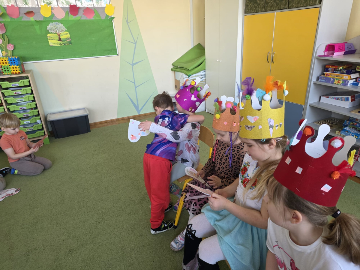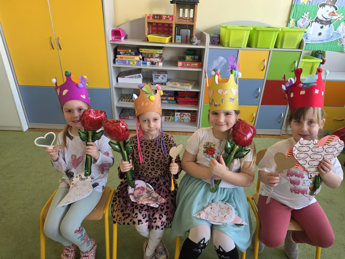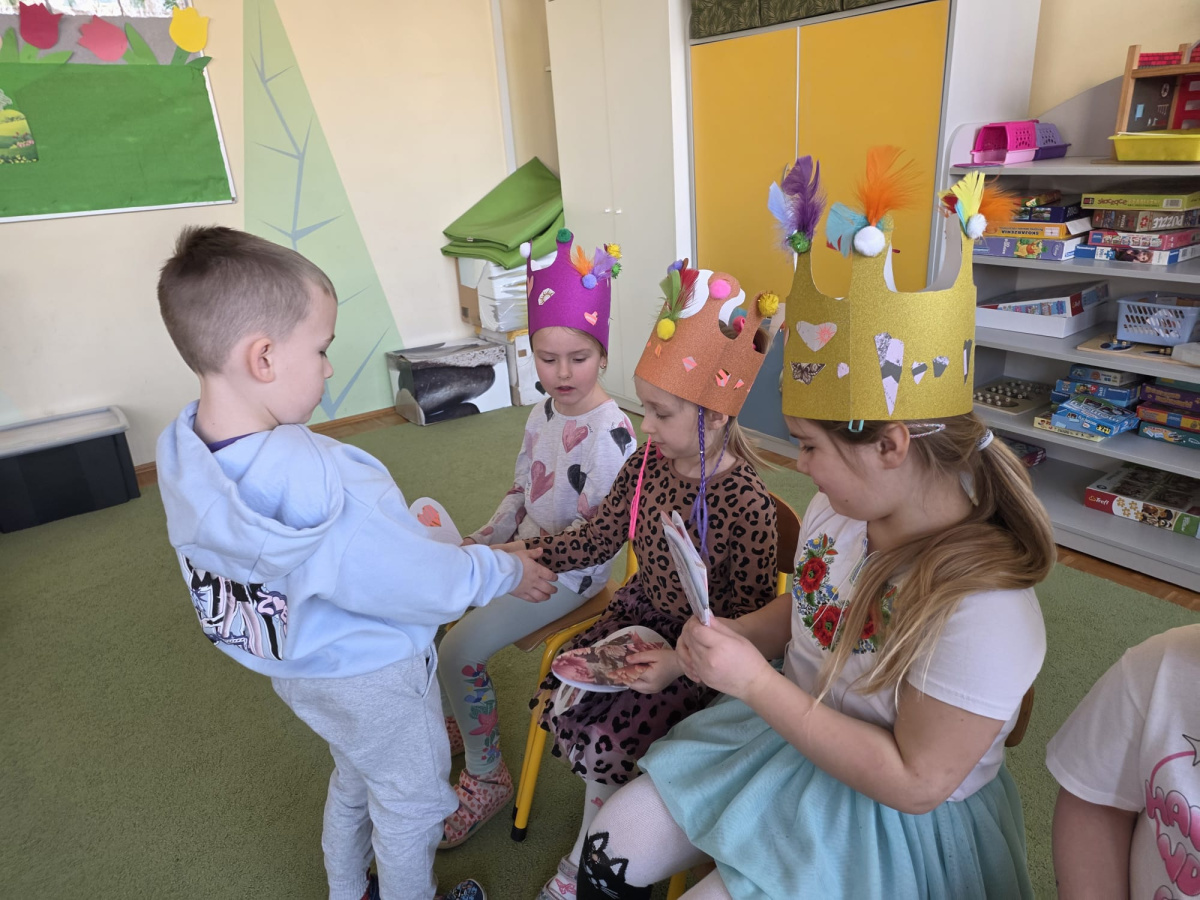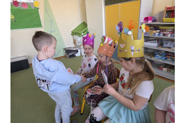 Jak na kobietki przystało,dziewczynki same zdobiły sobie piękne korony ,a chłopcy w tym czasie tworzyli przepiękne serduszkowe laurki.