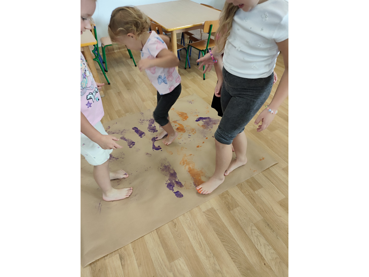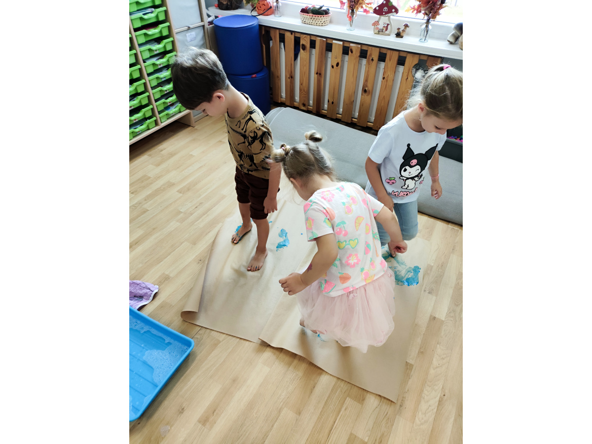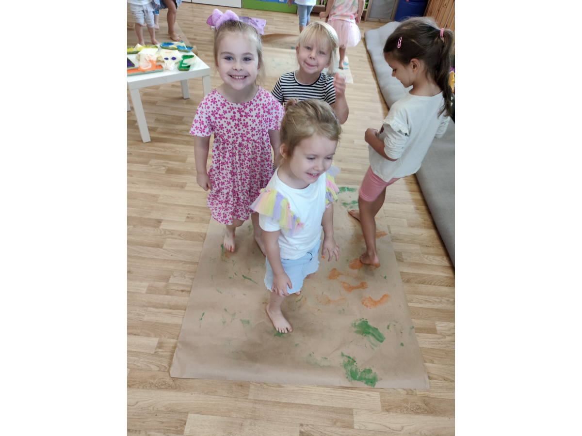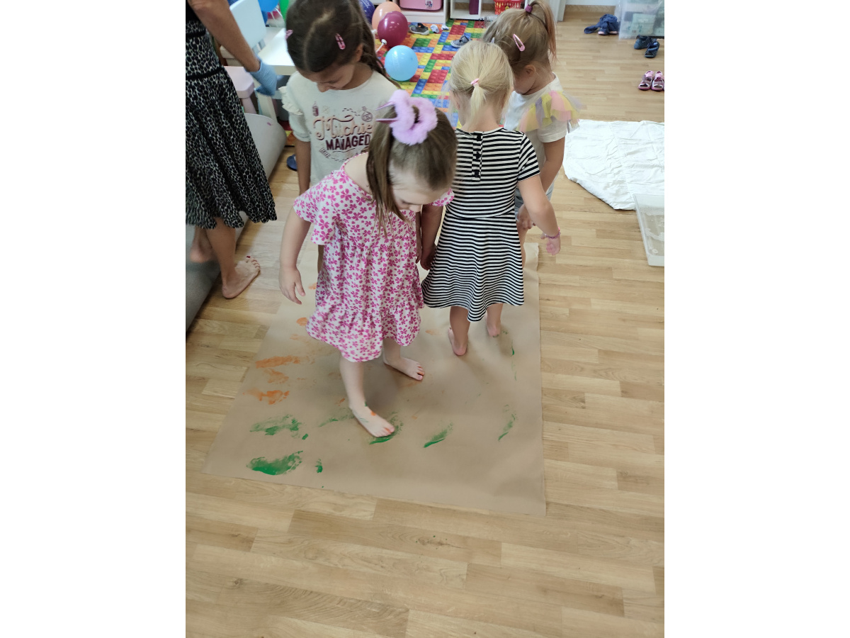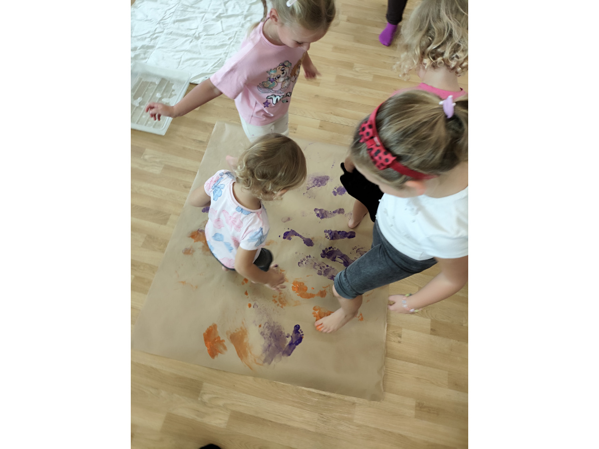 Nie zabrakło także kreatywnych aktywności – tańca na papierze! Tym razem było wyjątkowo kolorowo, bo Krasnoludki tańczyły przy muzyce, malując papier swoimi pomalowanymi farbami stopami. Radości i śmiechu było co niemiara, a powstałe dzieła zachwyciły wszystkich.