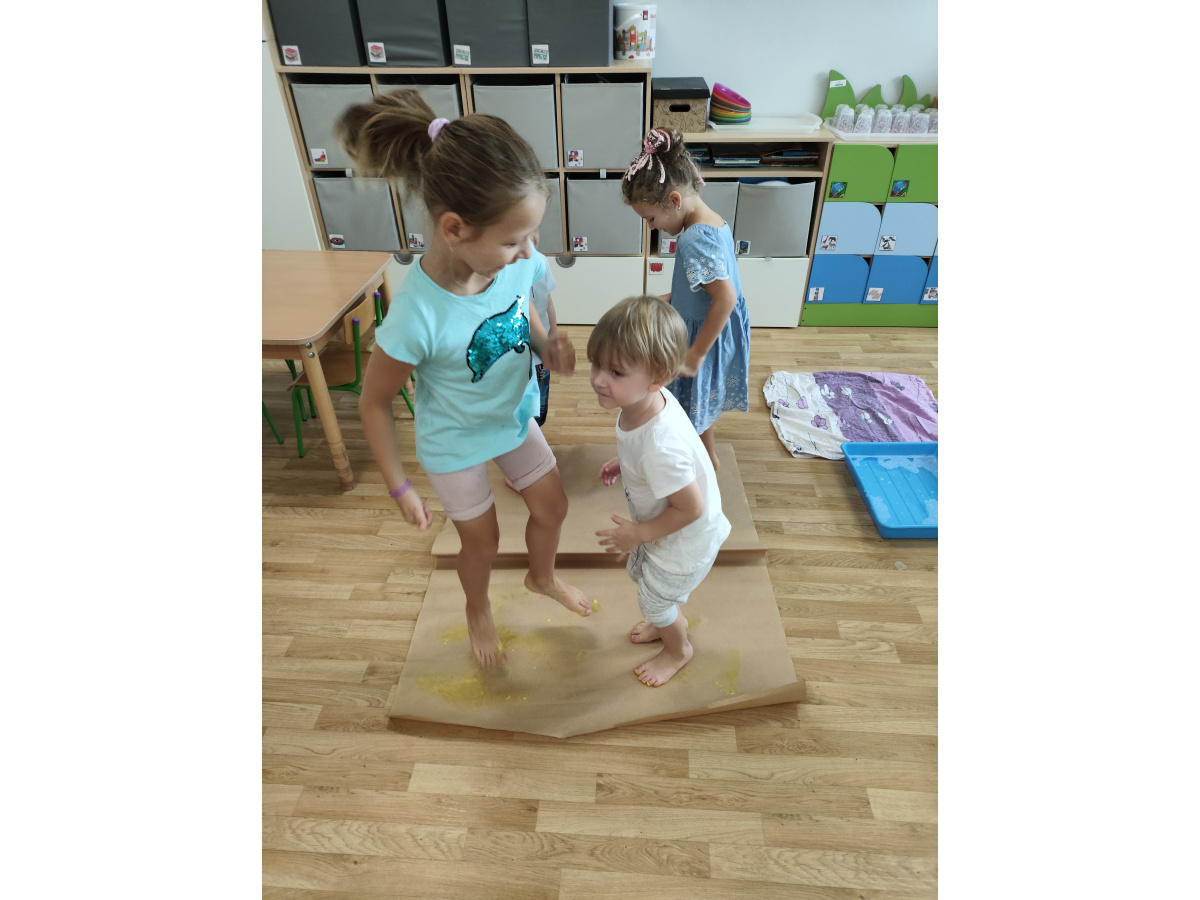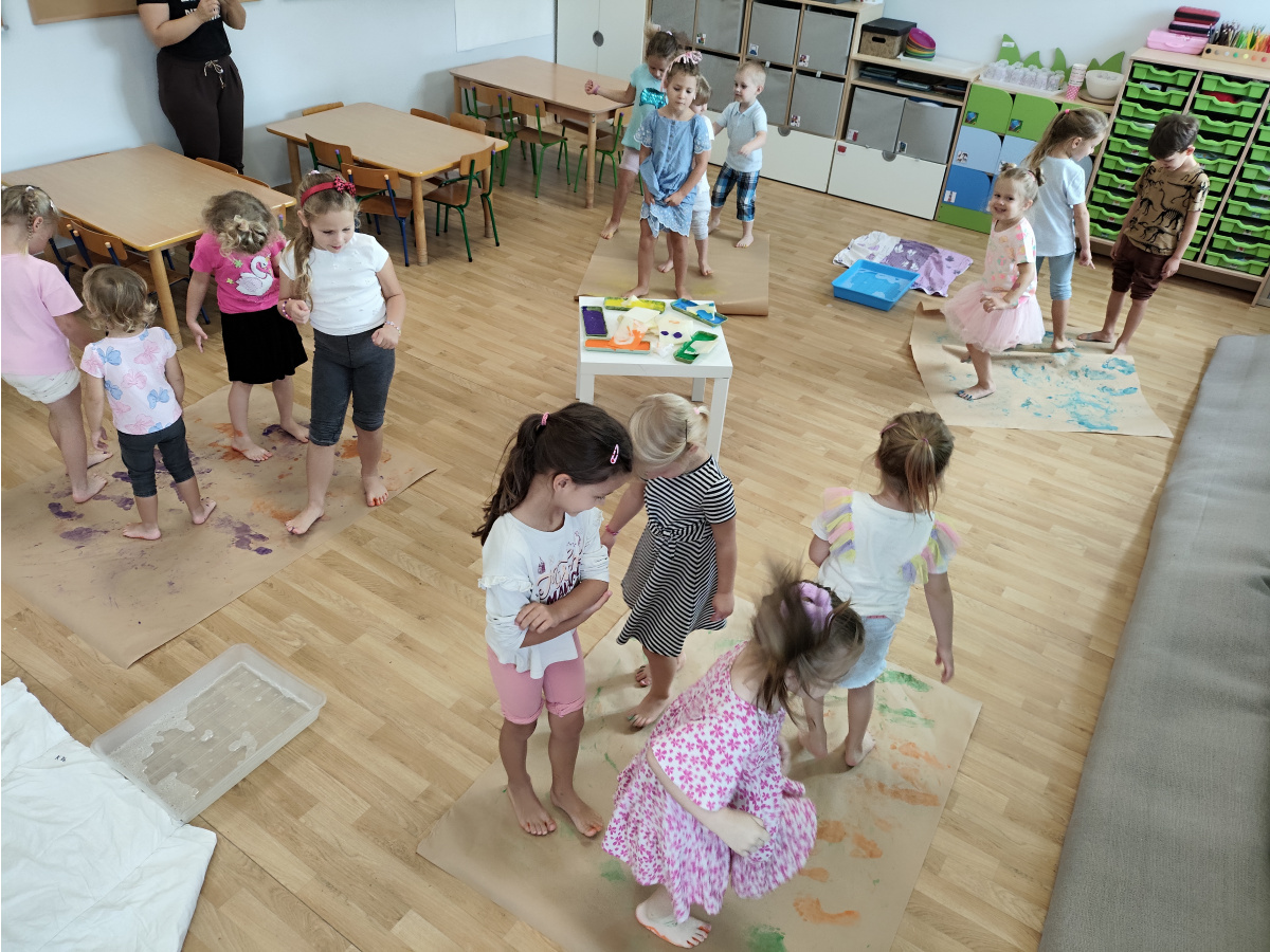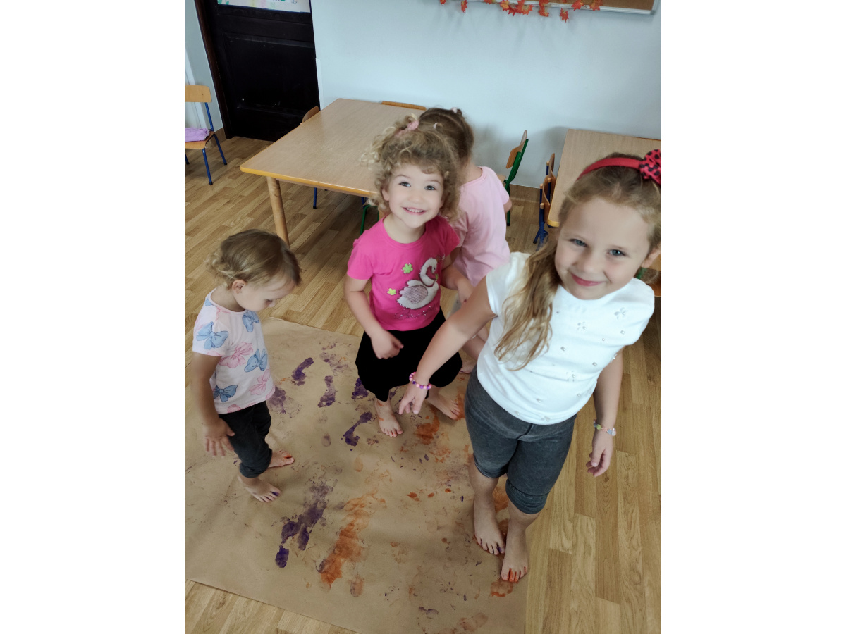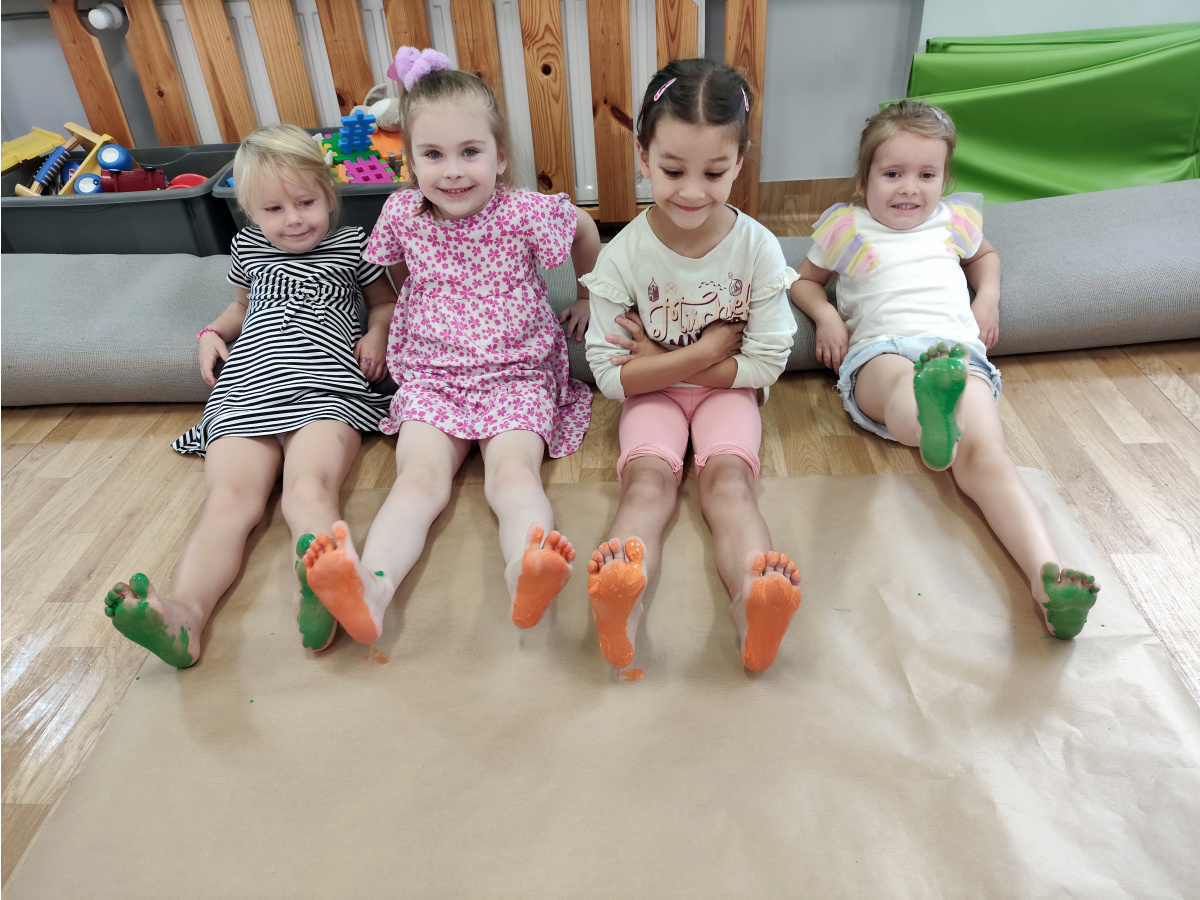 Nie zabrakło także kreatywnych aktywności – tańca na papierze! Tym razem było wyjątkowo kolorowo, bo Krasnoludki tańczyły przy muzyce, malując papier swoimi pomalowanymi farbami stopami. Radości i śmiechu było co niemiara, a powstałe dzieła zachwyciły wszystkich.