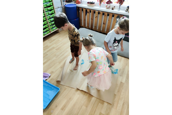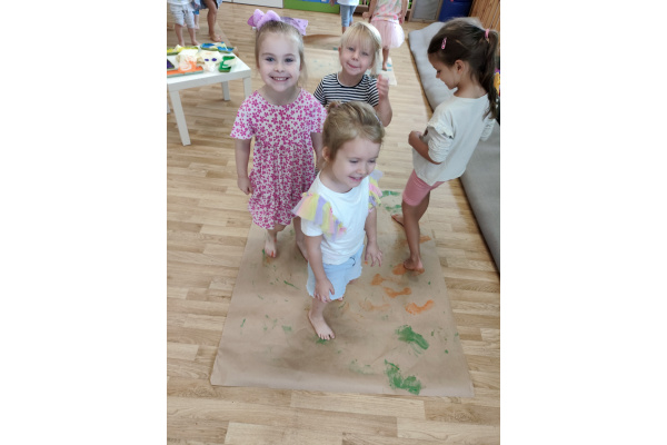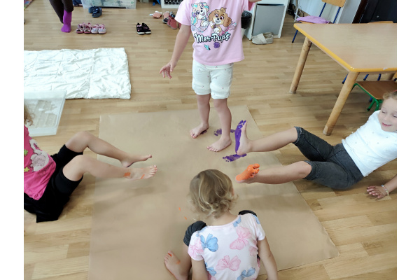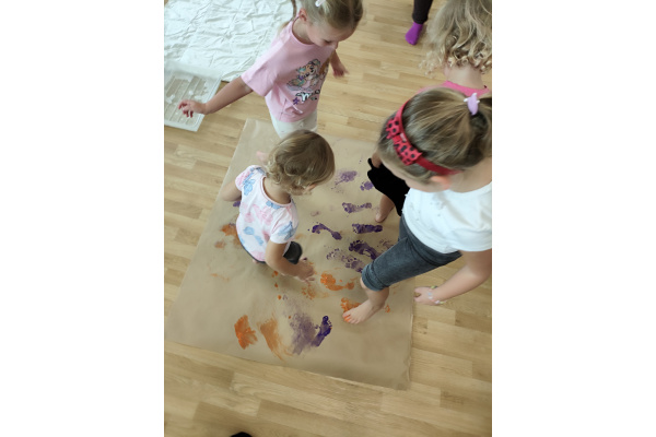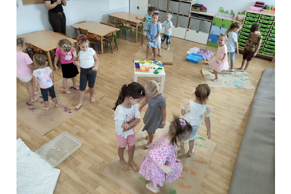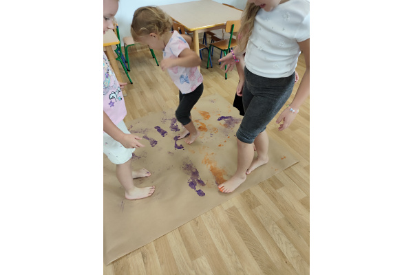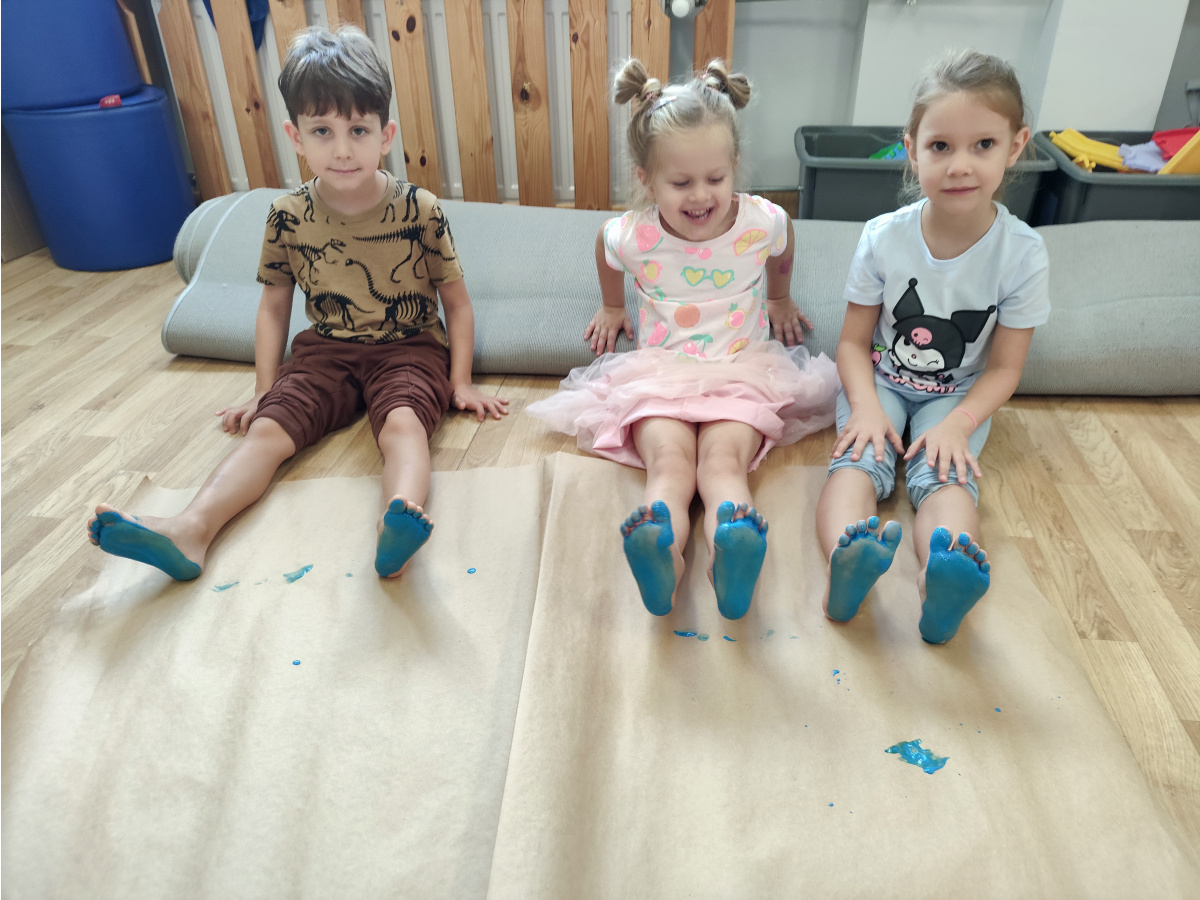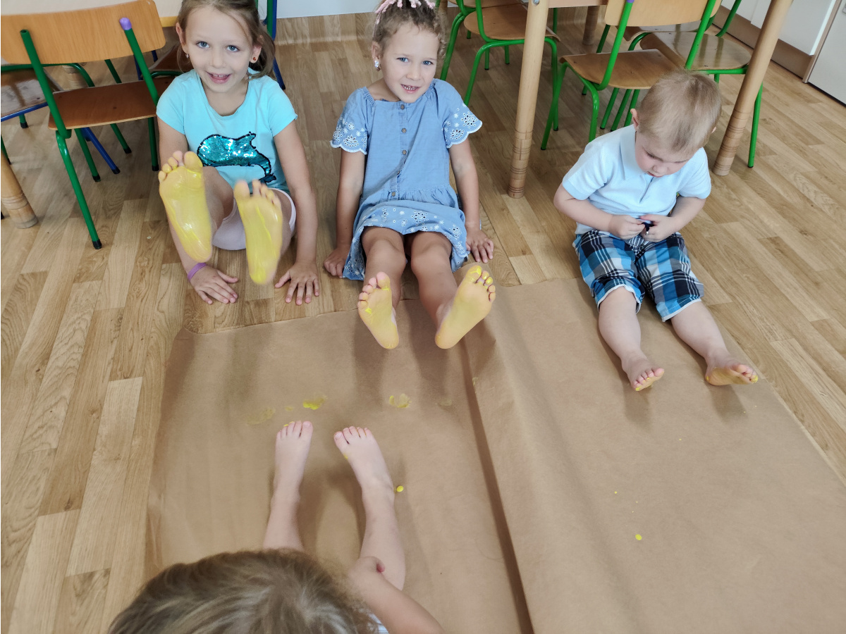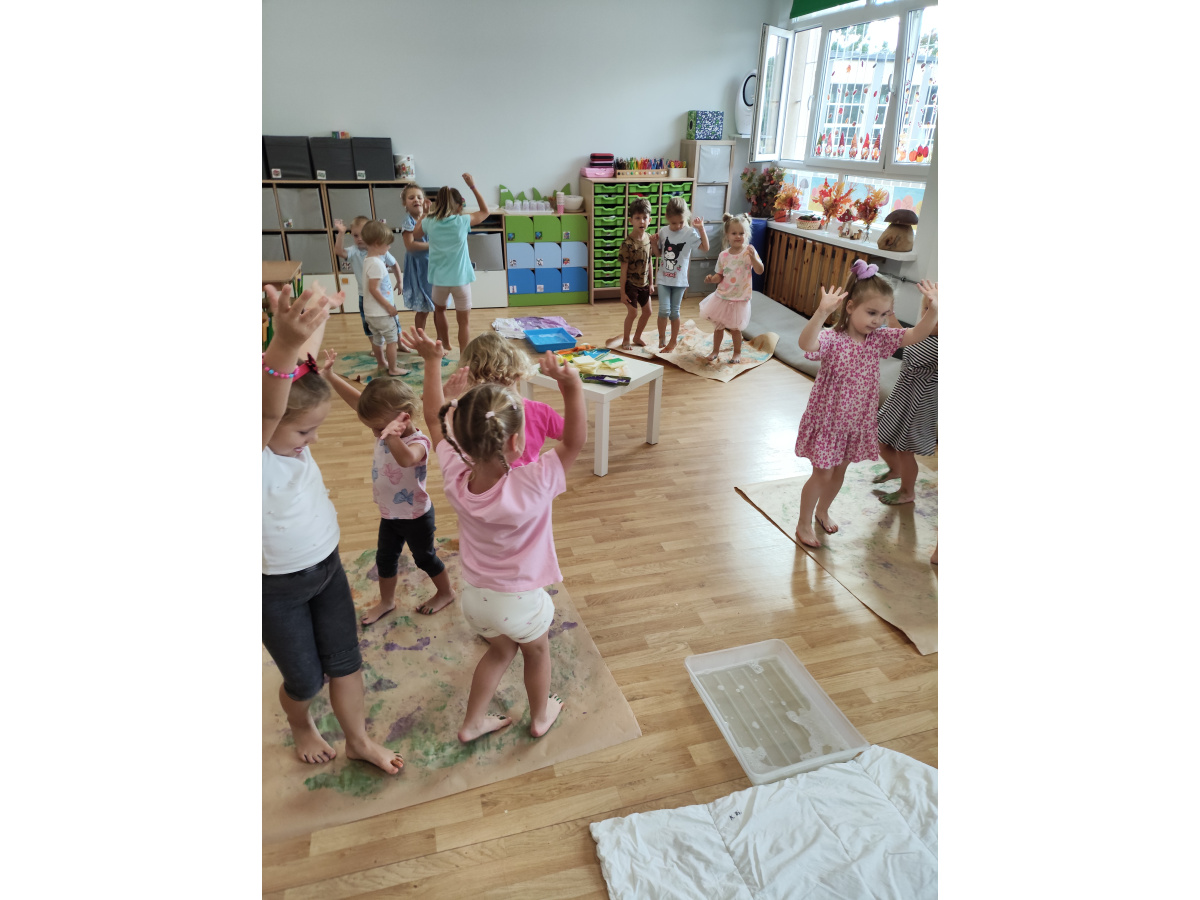 Nie zabrakło także kreatywnych aktywności – tańca na papierze! Tym razem było wyjątkowo kolorowo, bo Krasnoludki tańczyły przy muzyce, malując papier swoimi pomalowanymi farbami stopami. Radości i śmiechu było co niemiara, a powstałe dzieła zachwyciły wszystkich.