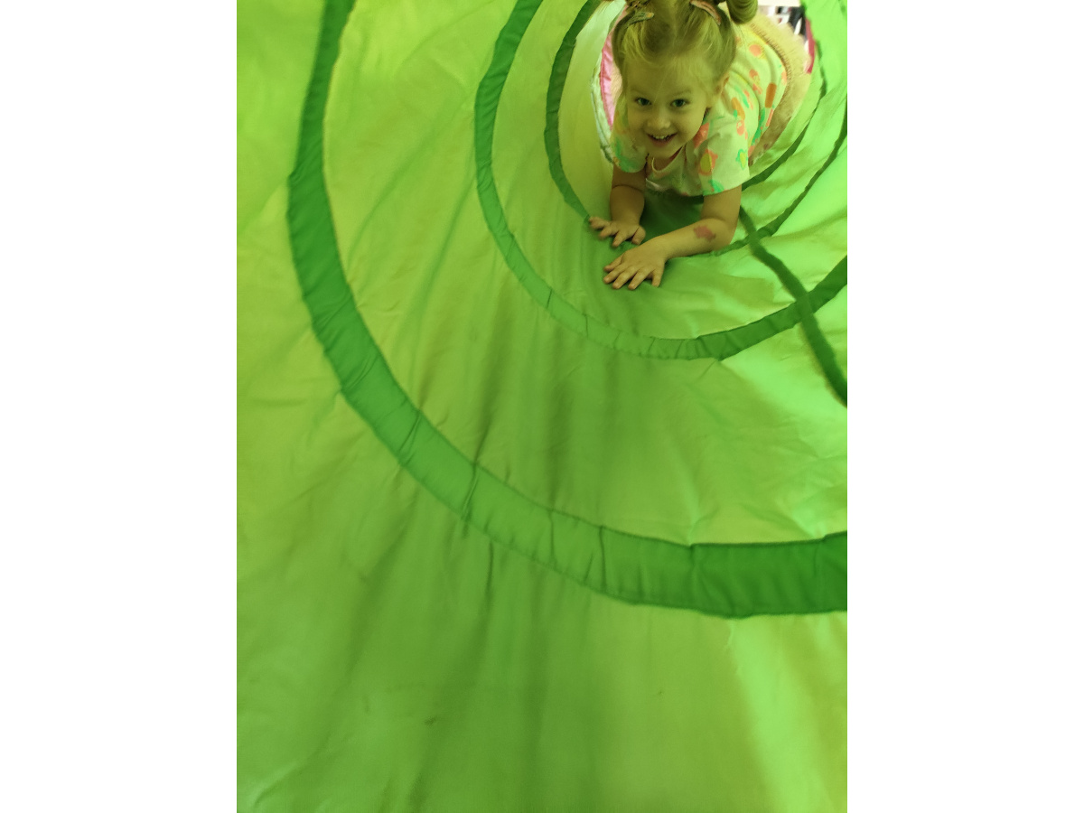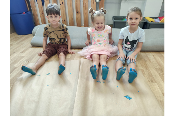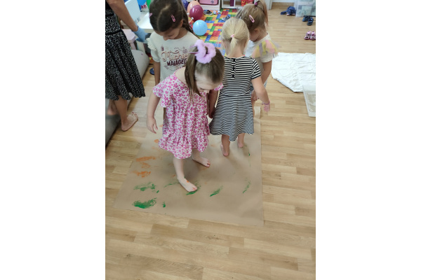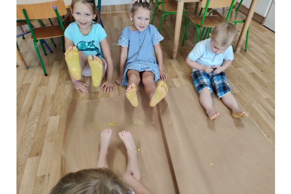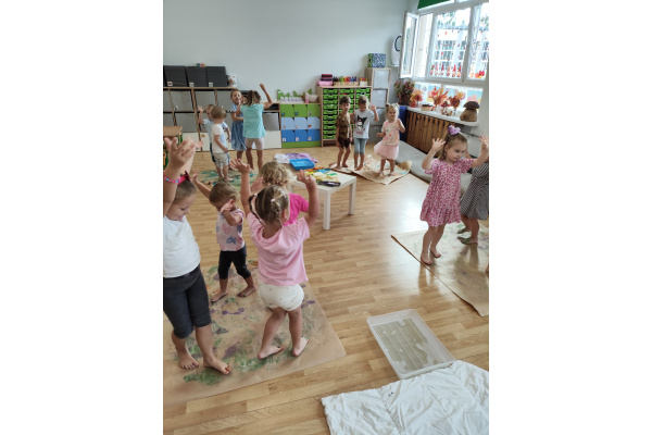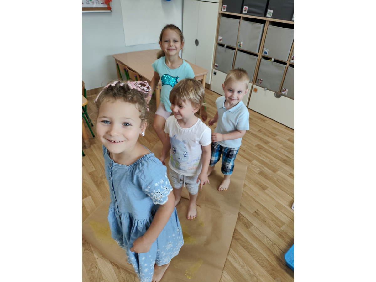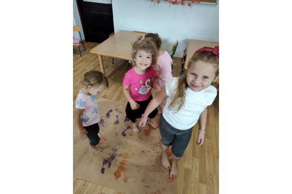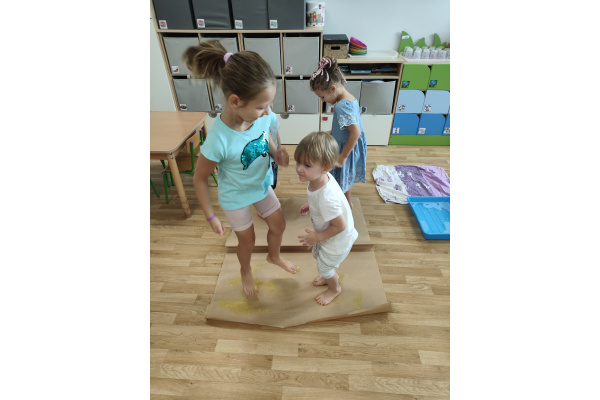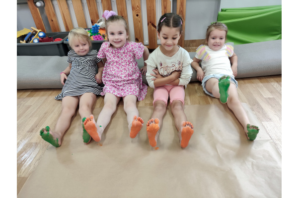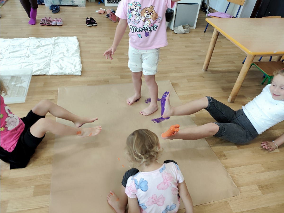 Nie zabrakło także kreatywnych aktywności – tańca na papierze! Tym razem było wyjątkowo kolorowo, bo Krasnoludki tańczyły przy muzyce, malując papier swoimi pomalowanymi farbami stopami. Radości i śmiechu było co niemiara, a powstałe dzieła zachwyciły wszystkich.