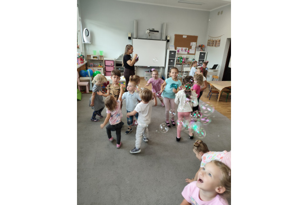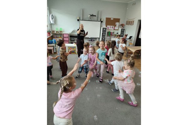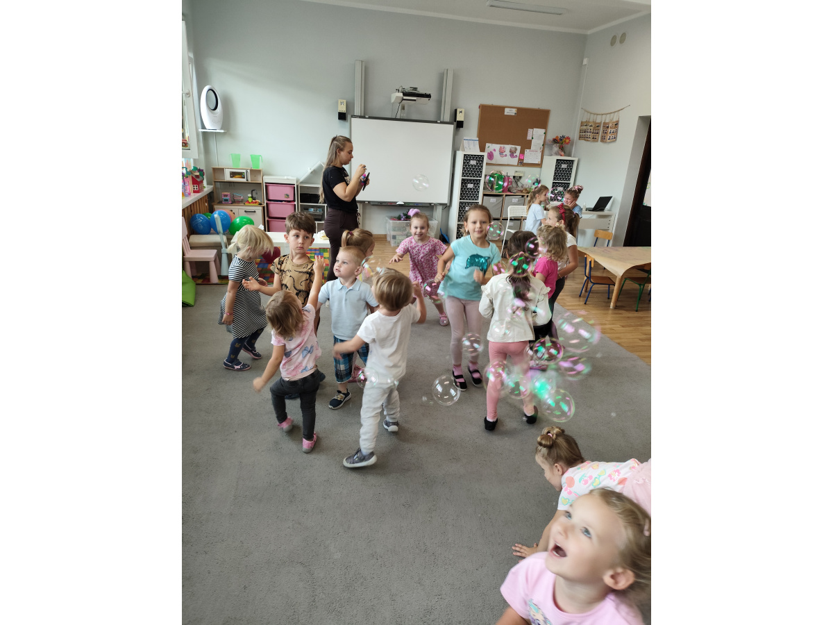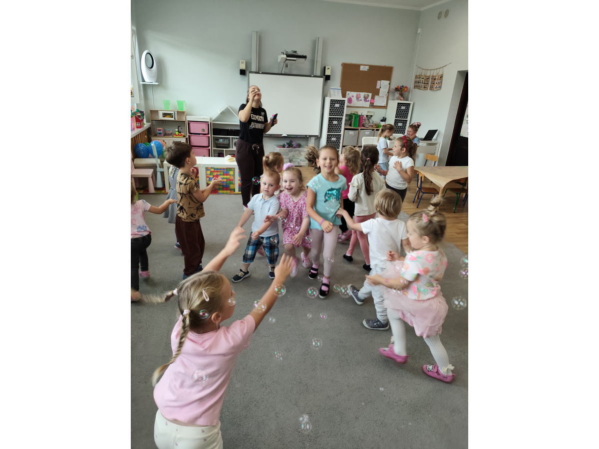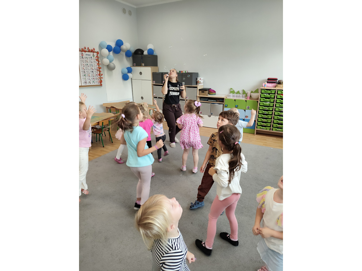 W trakcie dnia odbyła się także mini sesja zdjęciowa, dzięki której każdy przedszkolak będzie miał piękną pamiątkę z tego wyjątkowego dnia. Dodatkową atrakcją były bańki mydlane, które unosiły się po całej sali, wywołując zachwyt i radosne okrzyki dzieci.