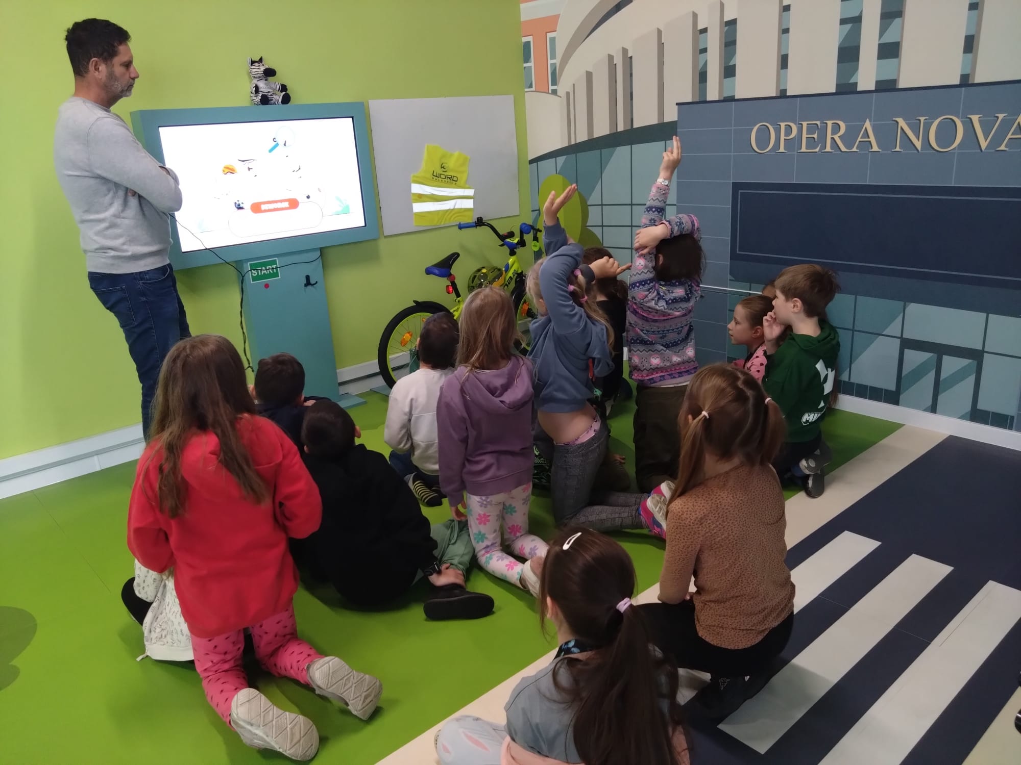 Podczas zajęć dzieci uczyły się bezpiecznego poruszania się na pasach – dowiedziały się, dlaczego należy zawsze upewnić się, że kierowca ich widzi, jak właściwie korzystać z sygnalizacji świetlnej i dlaczego warto stosować elementy odblaskowe.