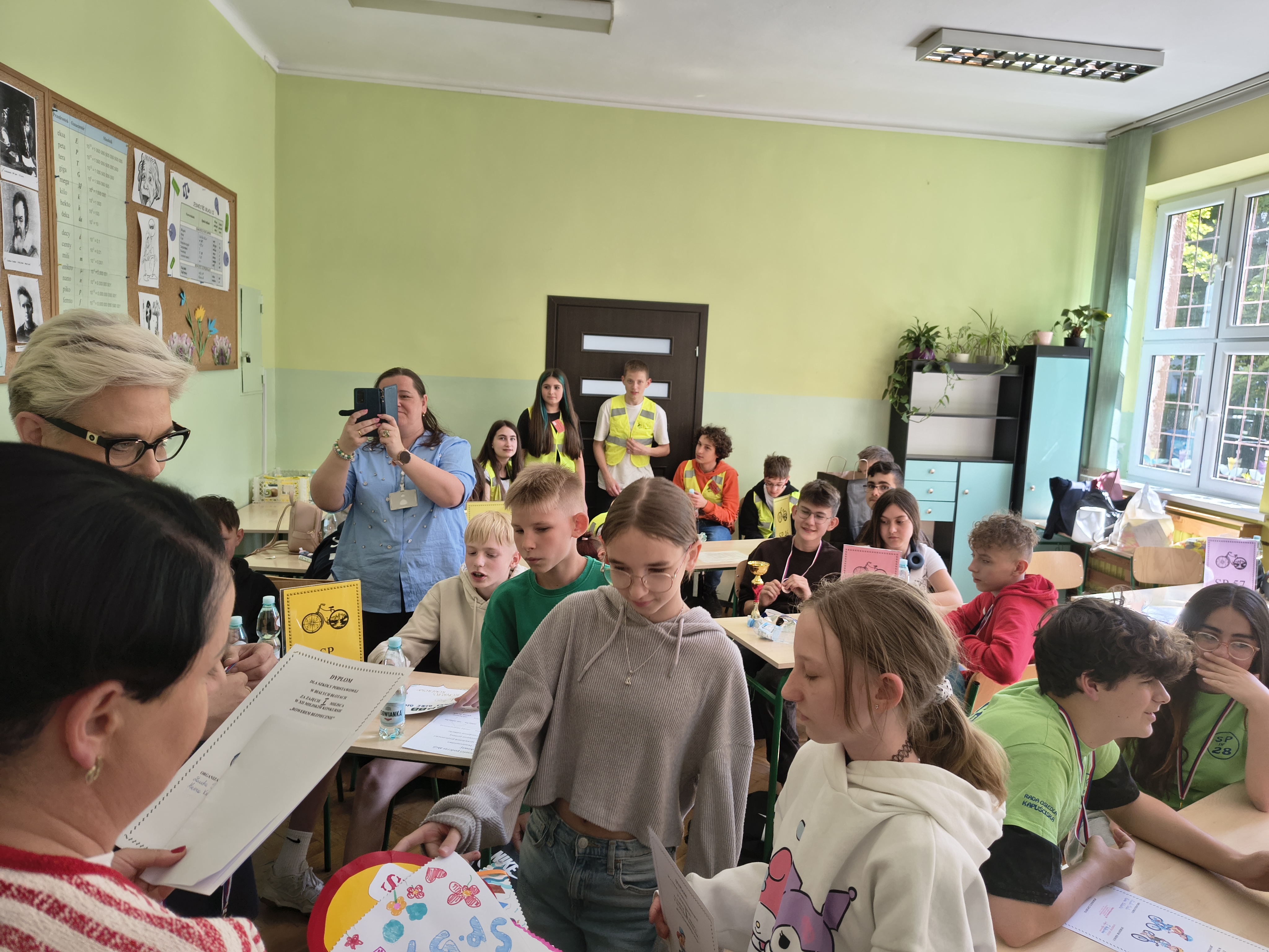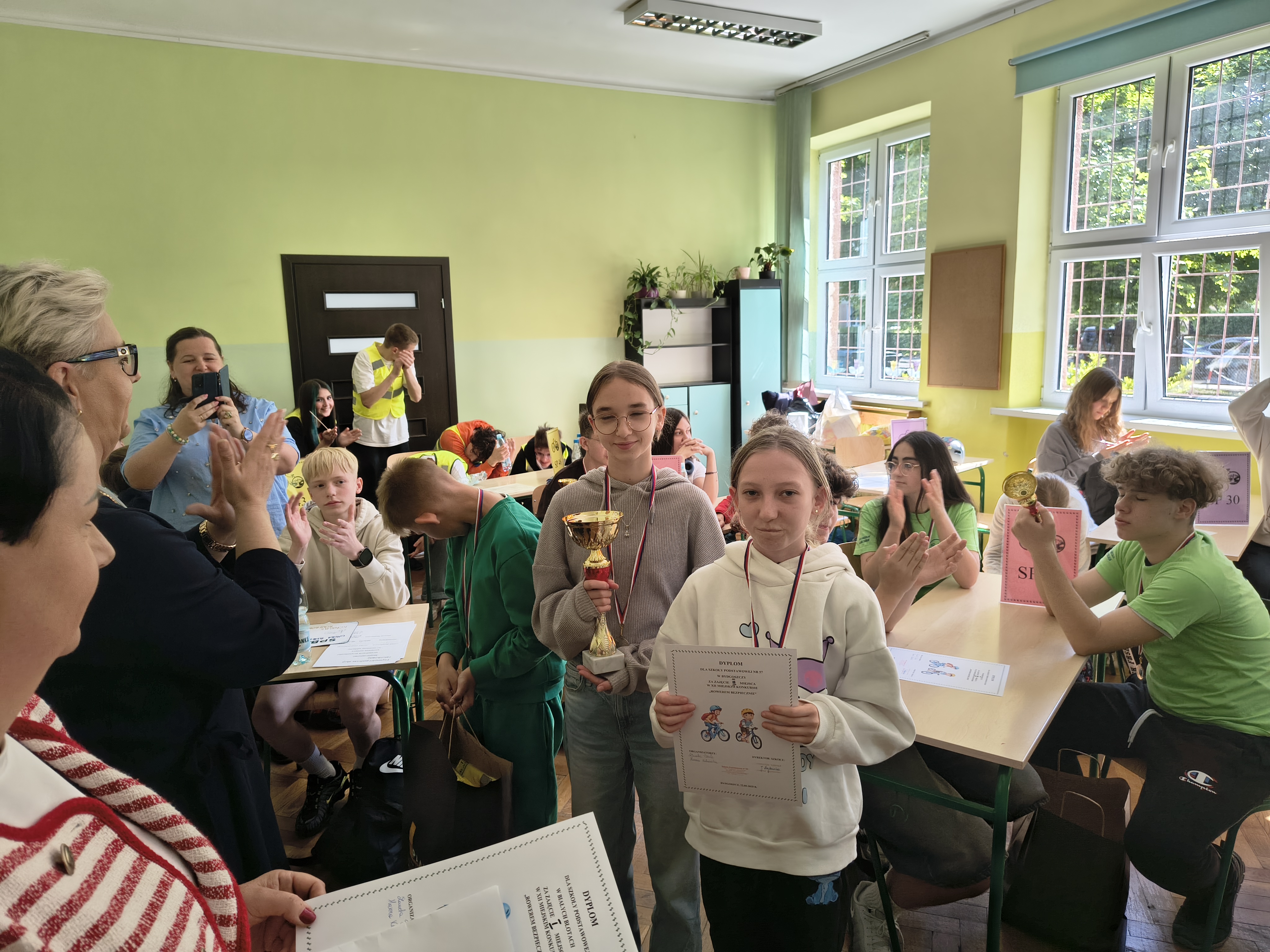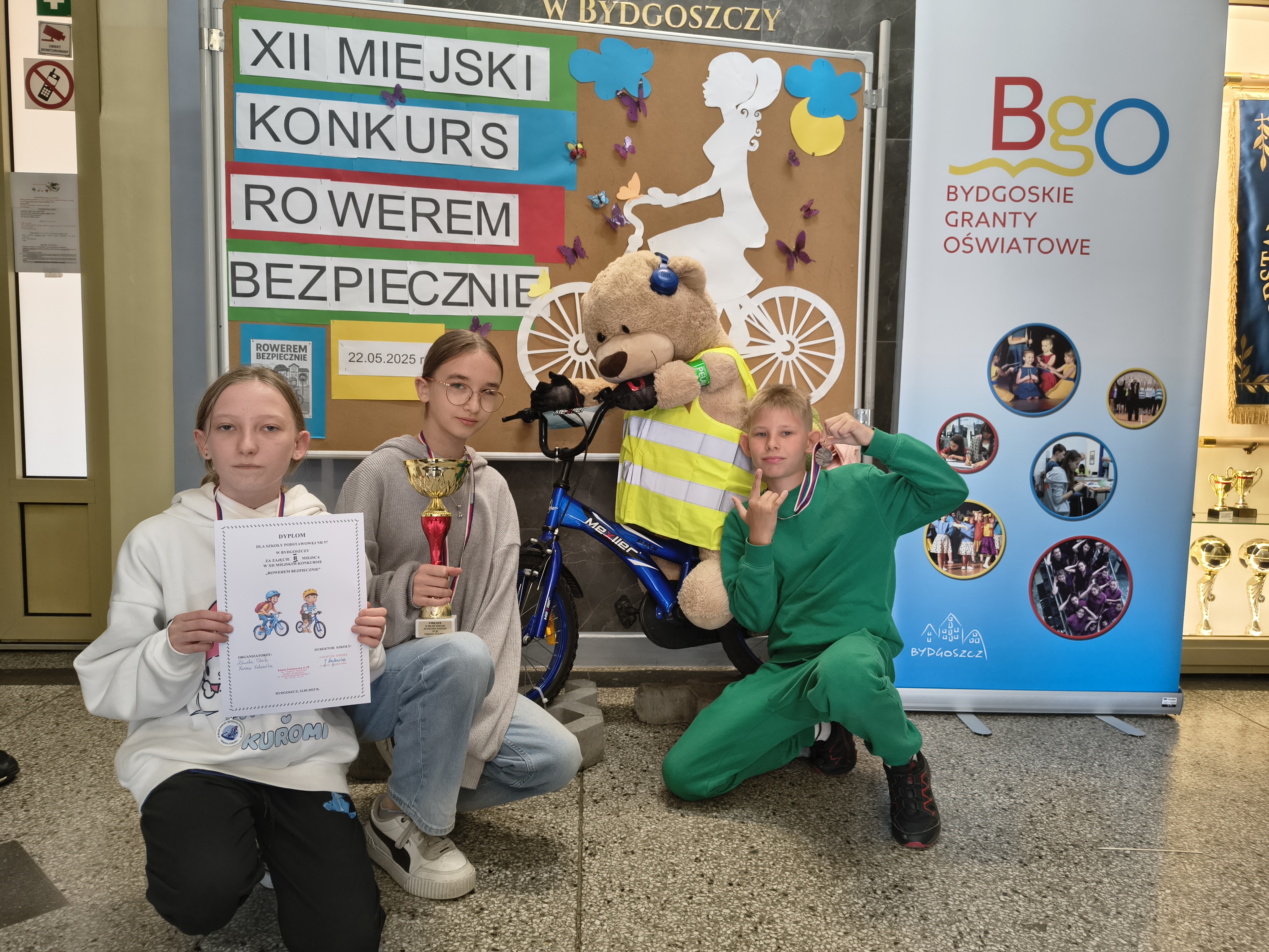 W dniu 22 maja 2025 roku w Szkole Podstawowej nr 28 odbył się finał Miejskiego Konkursu Komunikacyjnego "Rowerem bezpiecznie". Do zmagań przystąpiły drużyny z bydgoskich szkół. Spośród siedmiu reprezentacji nasza drużyna w składzie: Julia Sobecka, Kinga Kujawa, Kacprer Biełous, zdobyła II miejsce. Uczniowie zaprezentowali umiejętność poruszania się na hulajnodze i rowerze zgodnie z przepisami ruchu drogowego, naprawy roweru, jazdy na czas oraz udzielania pierwszej pomocy przedmedycznej. Jury składało się z nauczycieli - opiekunów drużyn, przedstawiciela KMP oraz WORD w Bydgoszczy.