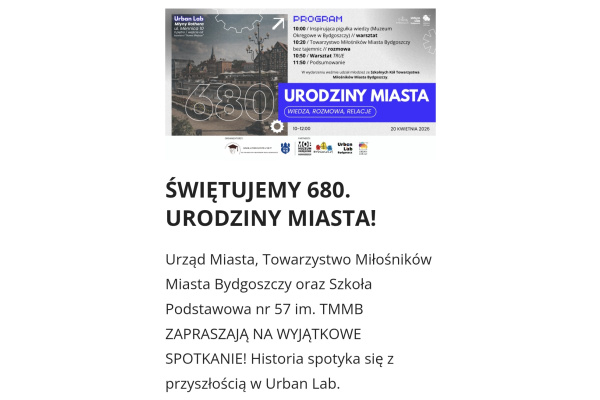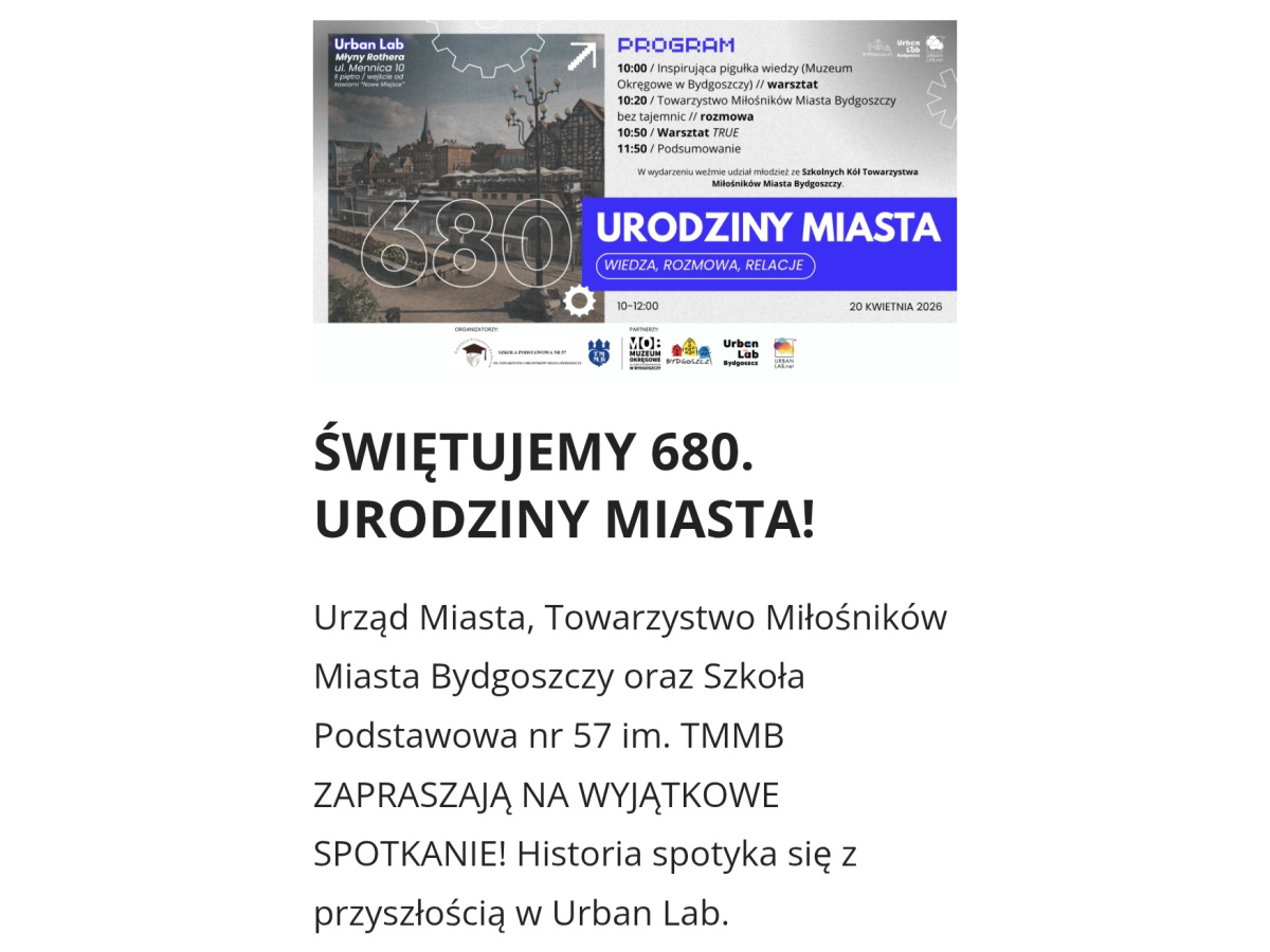 20 kwietnia 2026 z inicjatywy naszej szkoły w związku z obchodami 680 rocznicy URODZIN MIASTA ,we współpracy z Urzędem Miasta i TMMB odbyło się wyjątkowe spotkanie dla wyróżnionych członków Szkolnych Kół TMMB w Urban Lab .