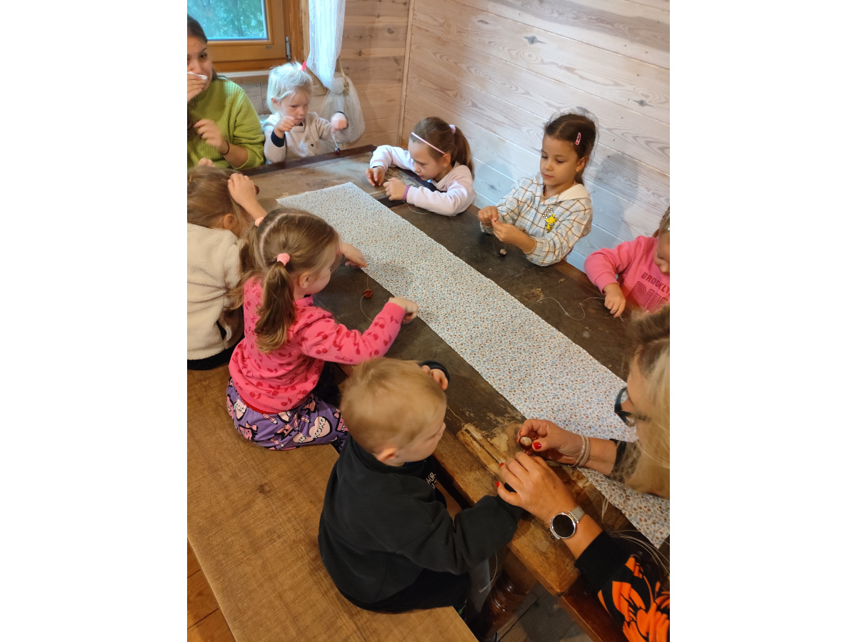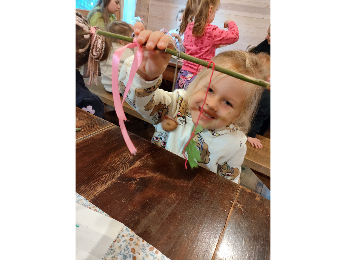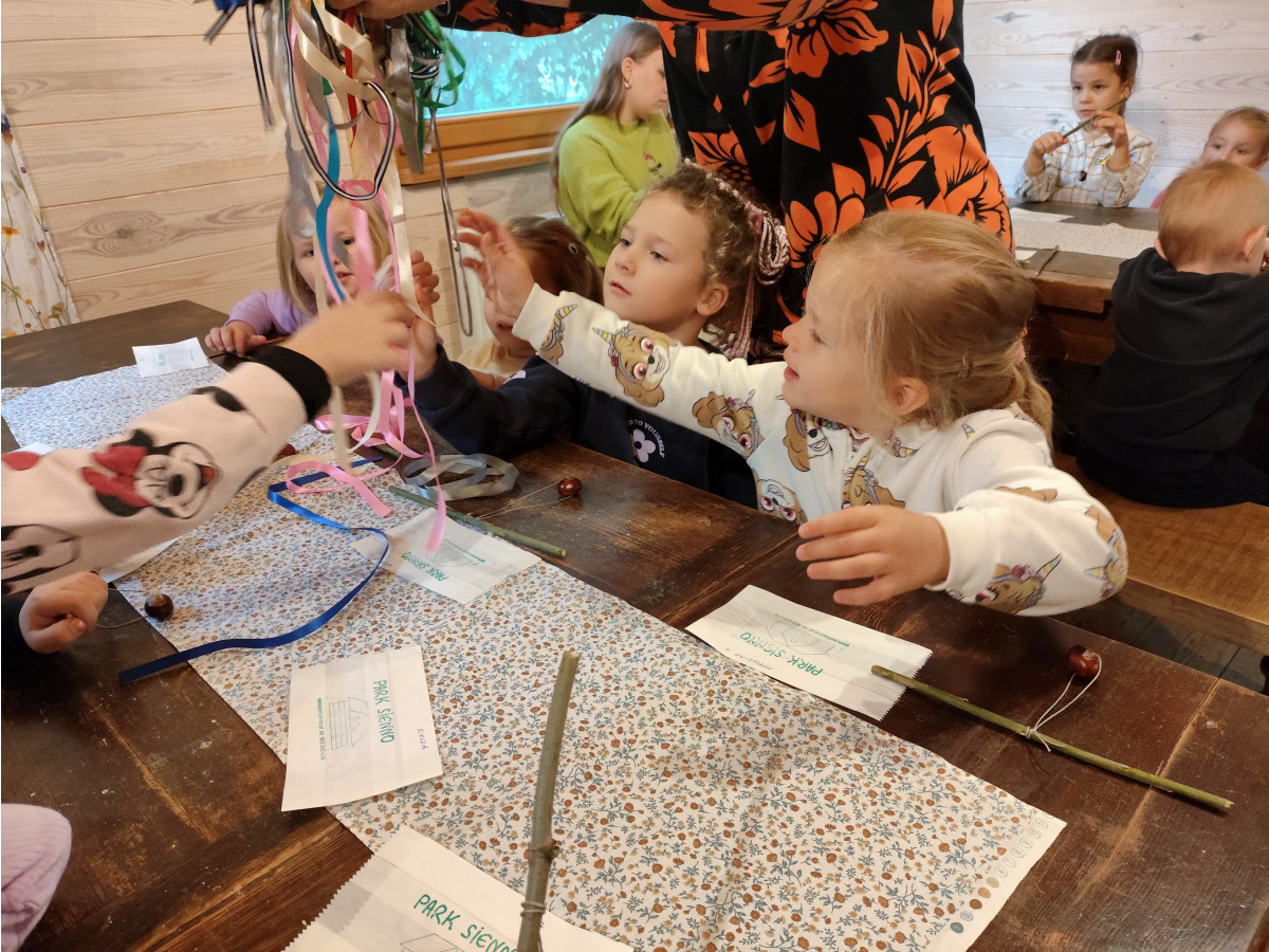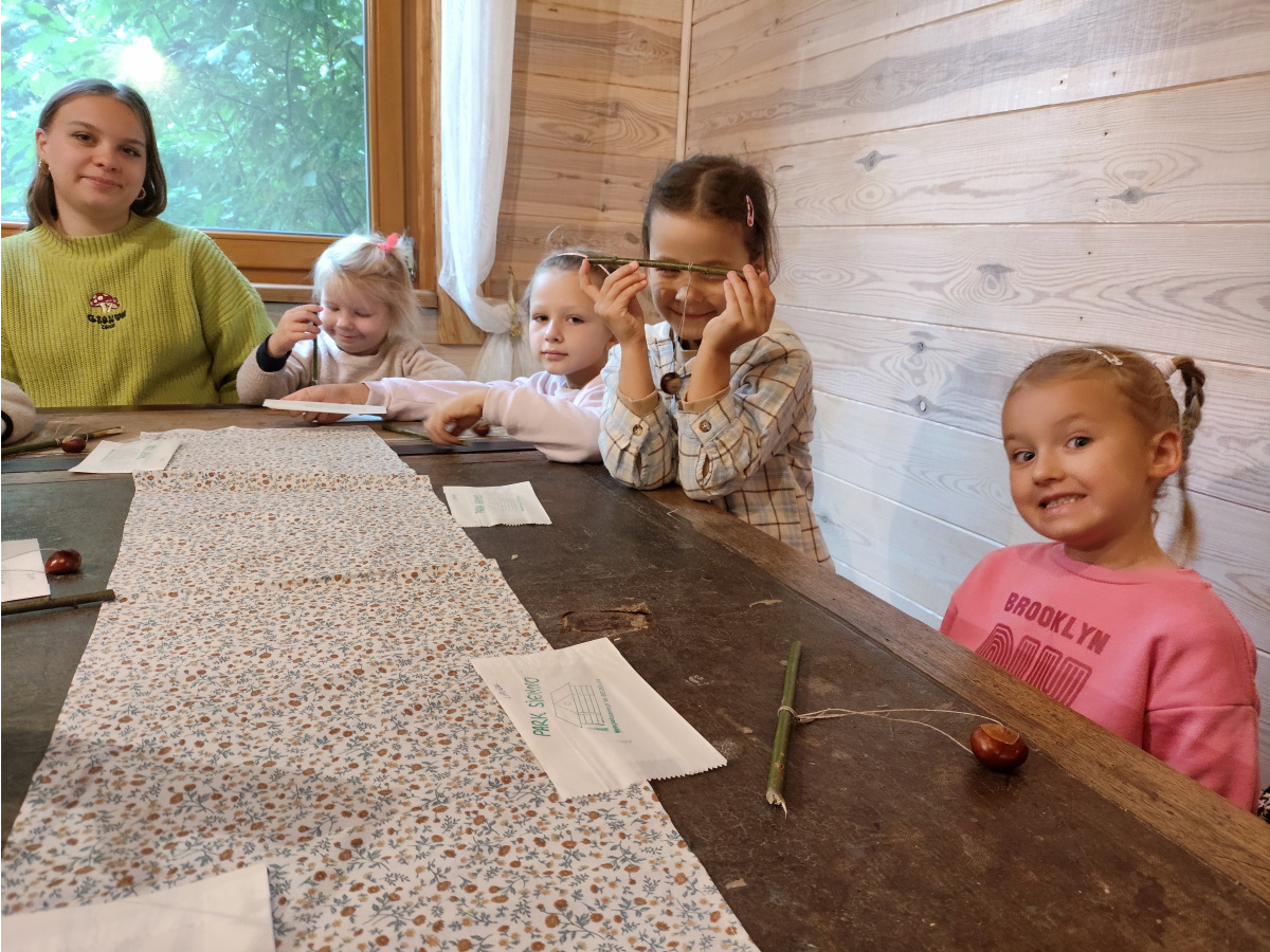 Kolejnym punktem programu była praca plastyczna — łapacze snów wykonane z darów jesieni. Liście, szyszki, kasztany i patyczki zamieniły się w piękne, kolorowe ozdoby, które dzieci zabrały ze sobą jako pamiątkę z wycieczki.