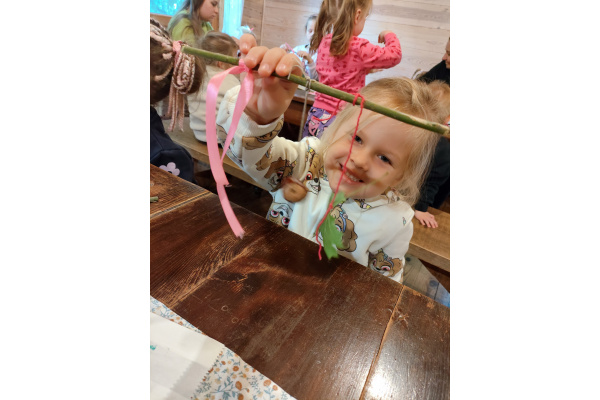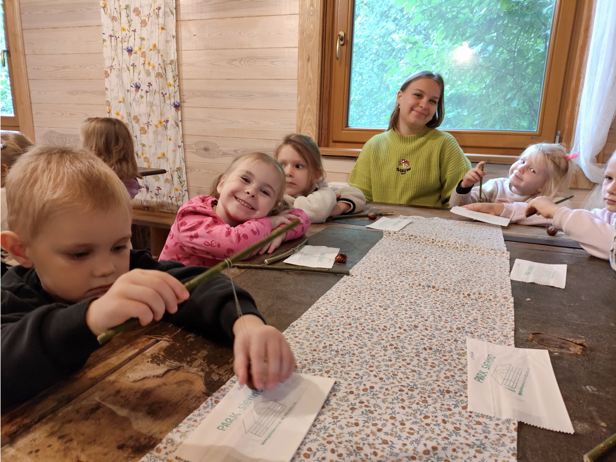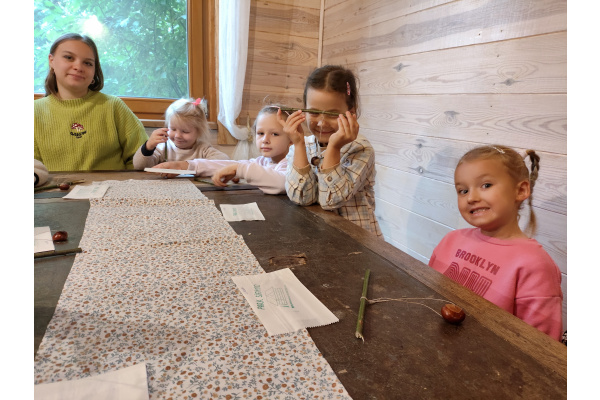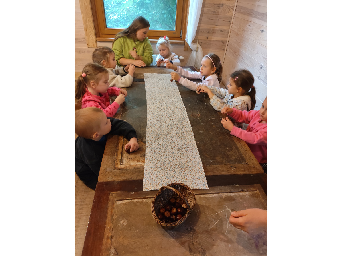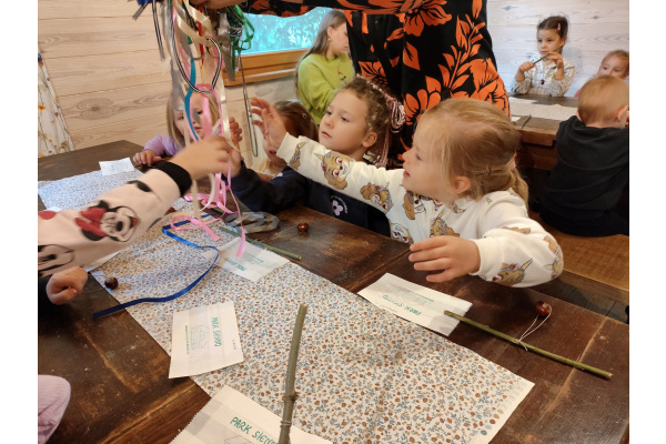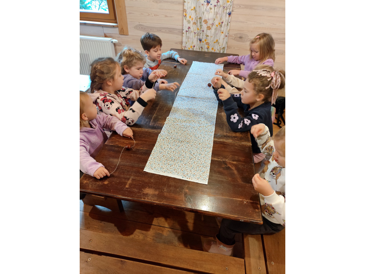 Kolejnym punktem programu była praca plastyczna — łapacze snów wykonane z darów jesieni. Liście, szyszki, kasztany i patyczki zamieniły się w piękne, kolorowe ozdoby, które dzieci zabrały ze sobą jako pamiątkę z wycieczki.