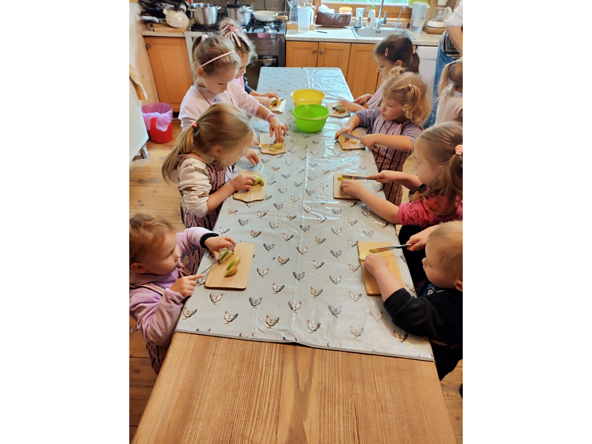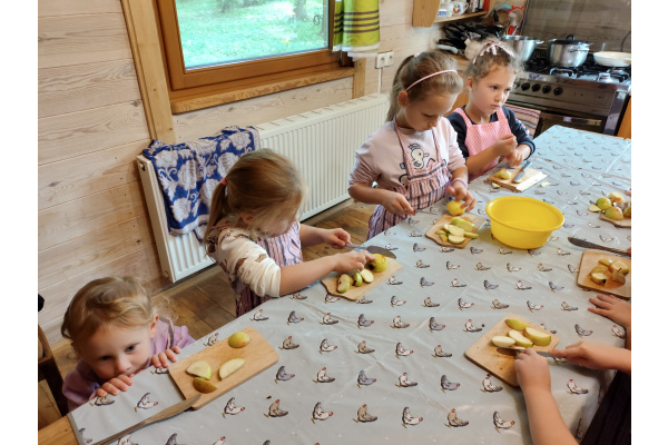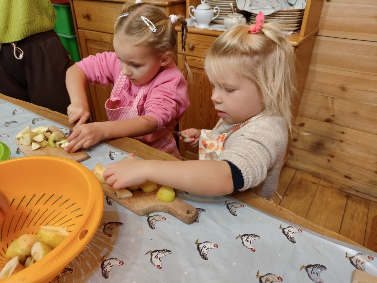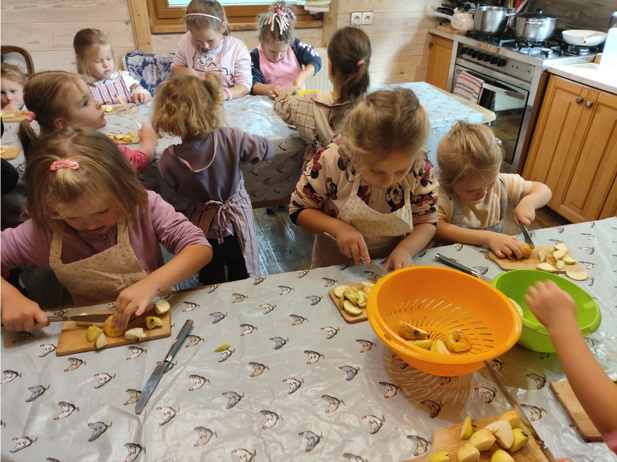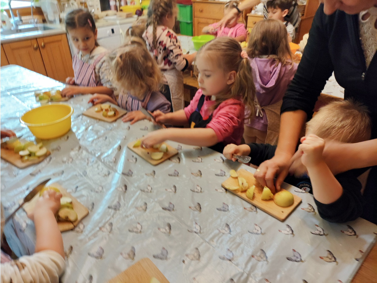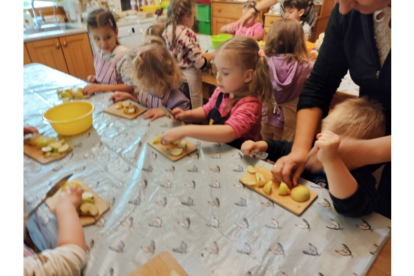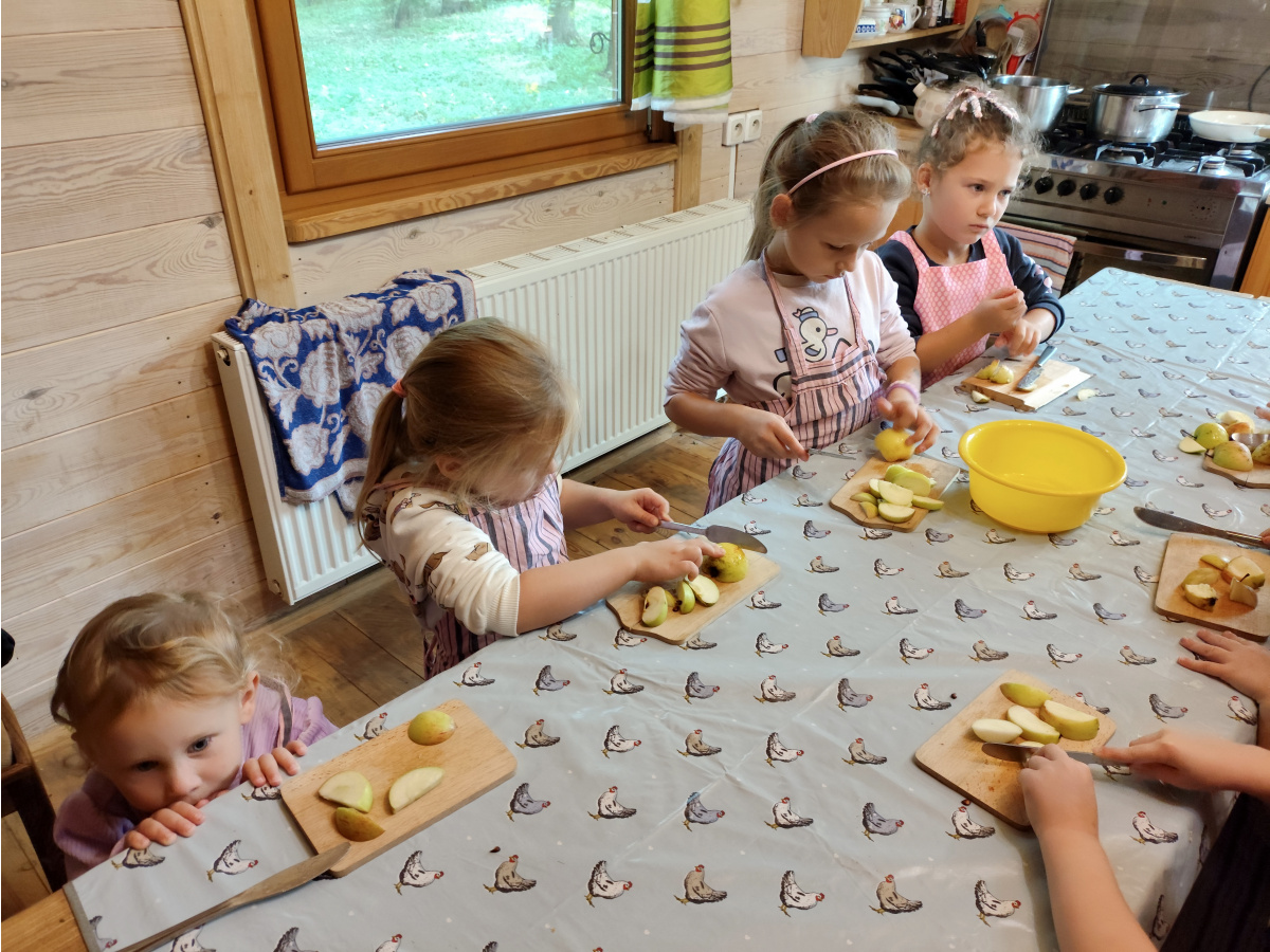 Na miejscu pani Sylwia i pani Krystyna opowiedziały dzieciom o jesiennych przetworach — jak powstają dżemy, kompoty i kiszonki. Dzieci z zaciekawieniem słuchały, a potem same przystąpiły do pracy: przygotowały jabłka na kompot, który później wspólnie wypiły ze smakiem!