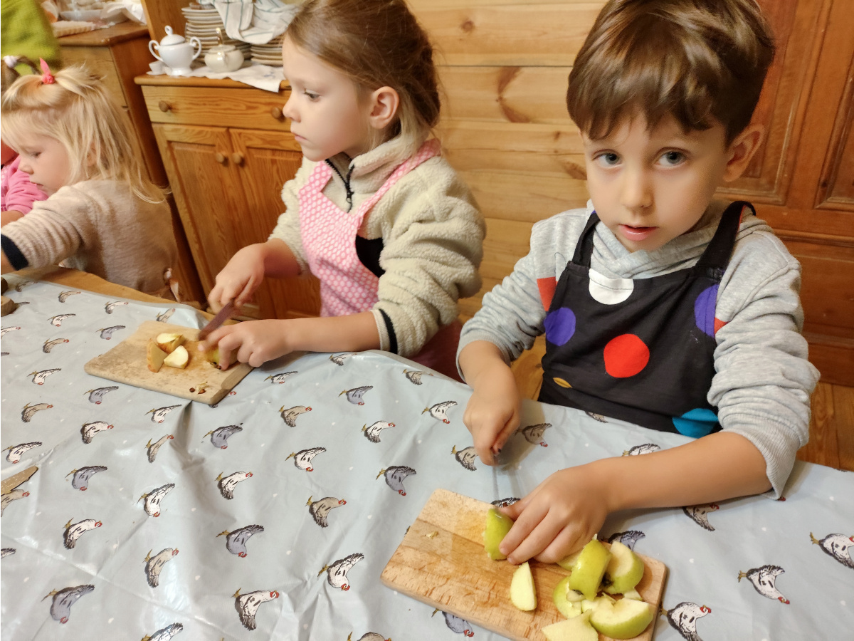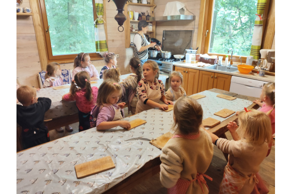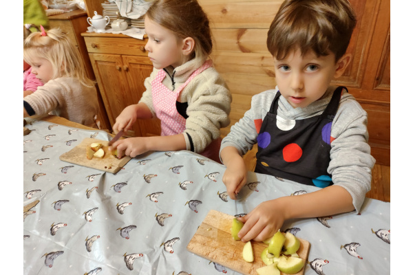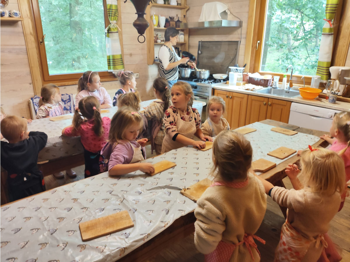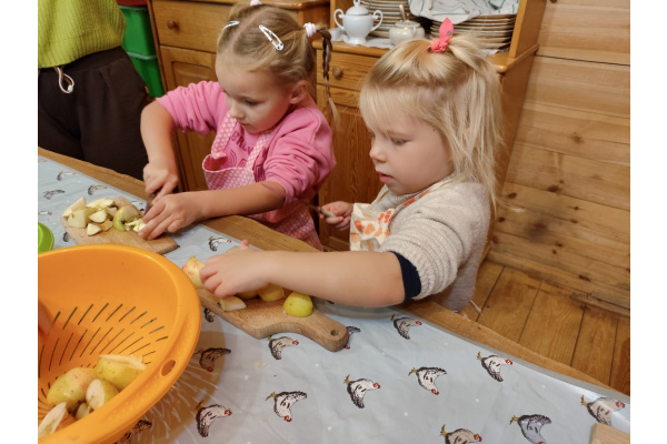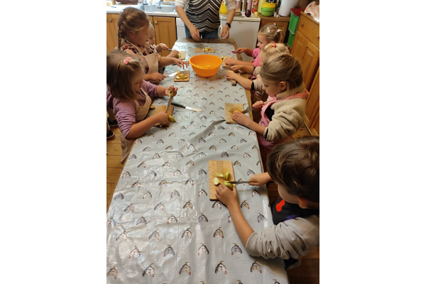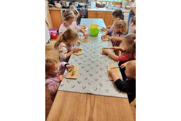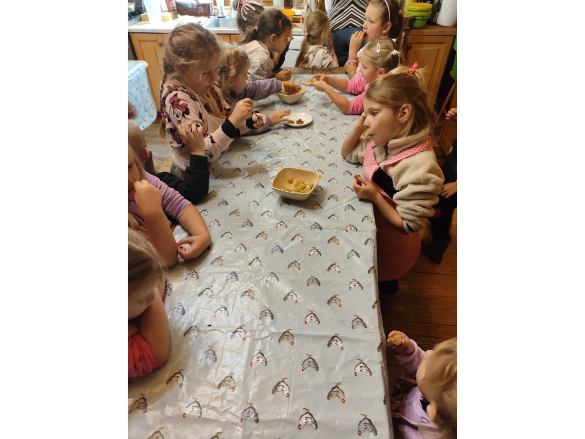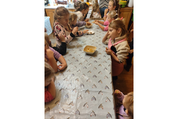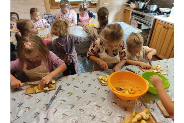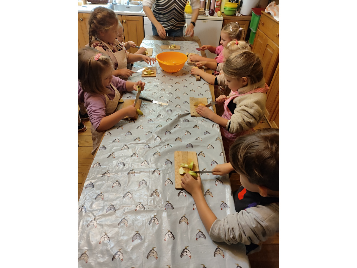 Na miejscu pani Sylwia i pani Krystyna opowiedziały dzieciom o jesiennych przetworach — jak powstają dżemy, kompoty i kiszonki. Dzieci z zaciekawieniem słuchały, a potem same przystąpiły do pracy: przygotowały jabłka na kompot, który później wspólnie wypiły ze smakiem!