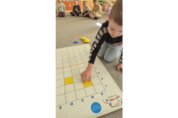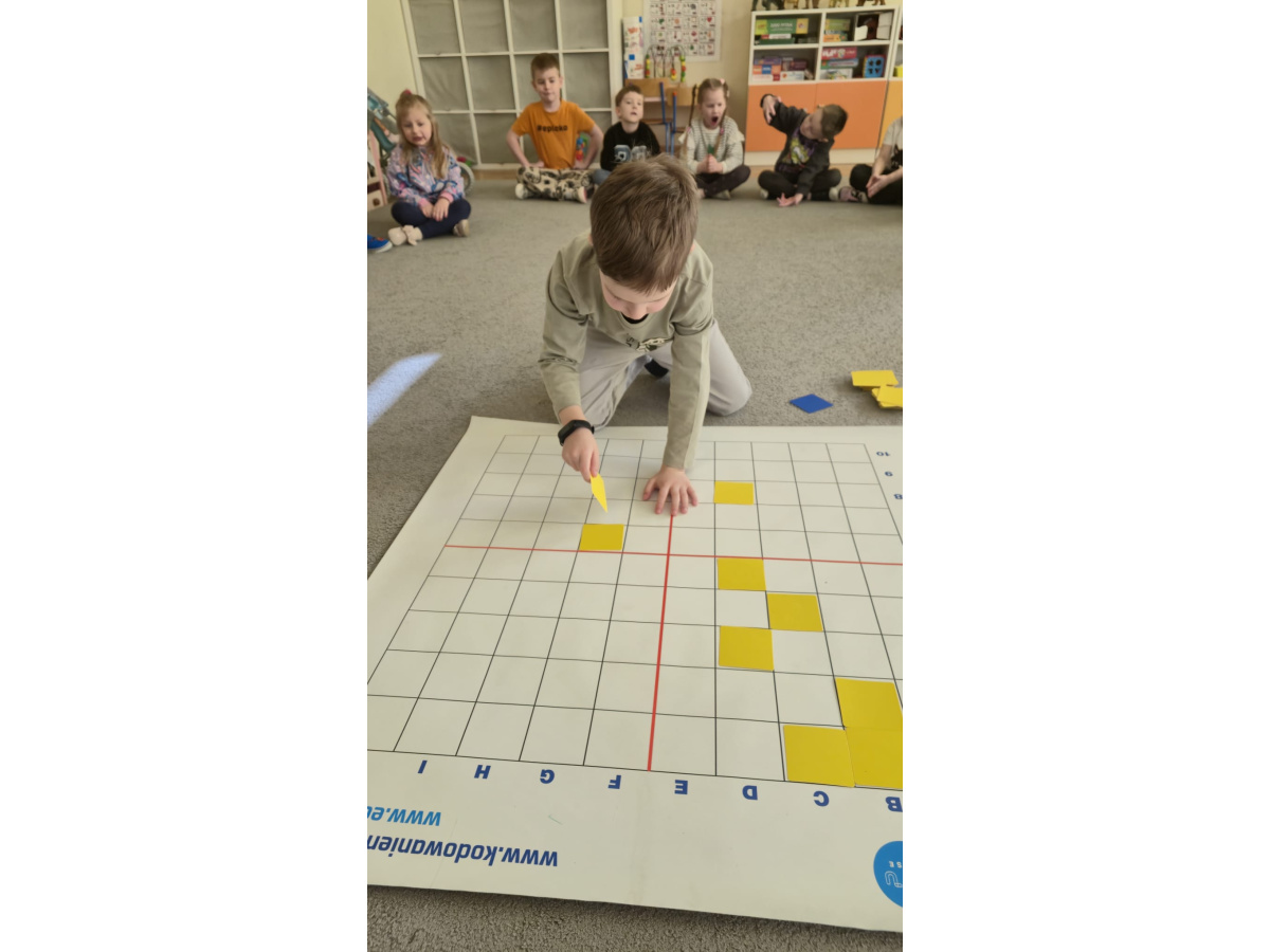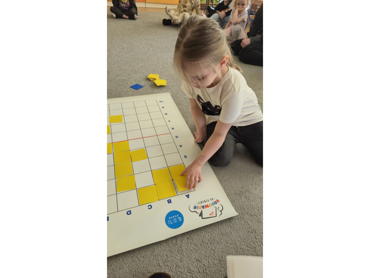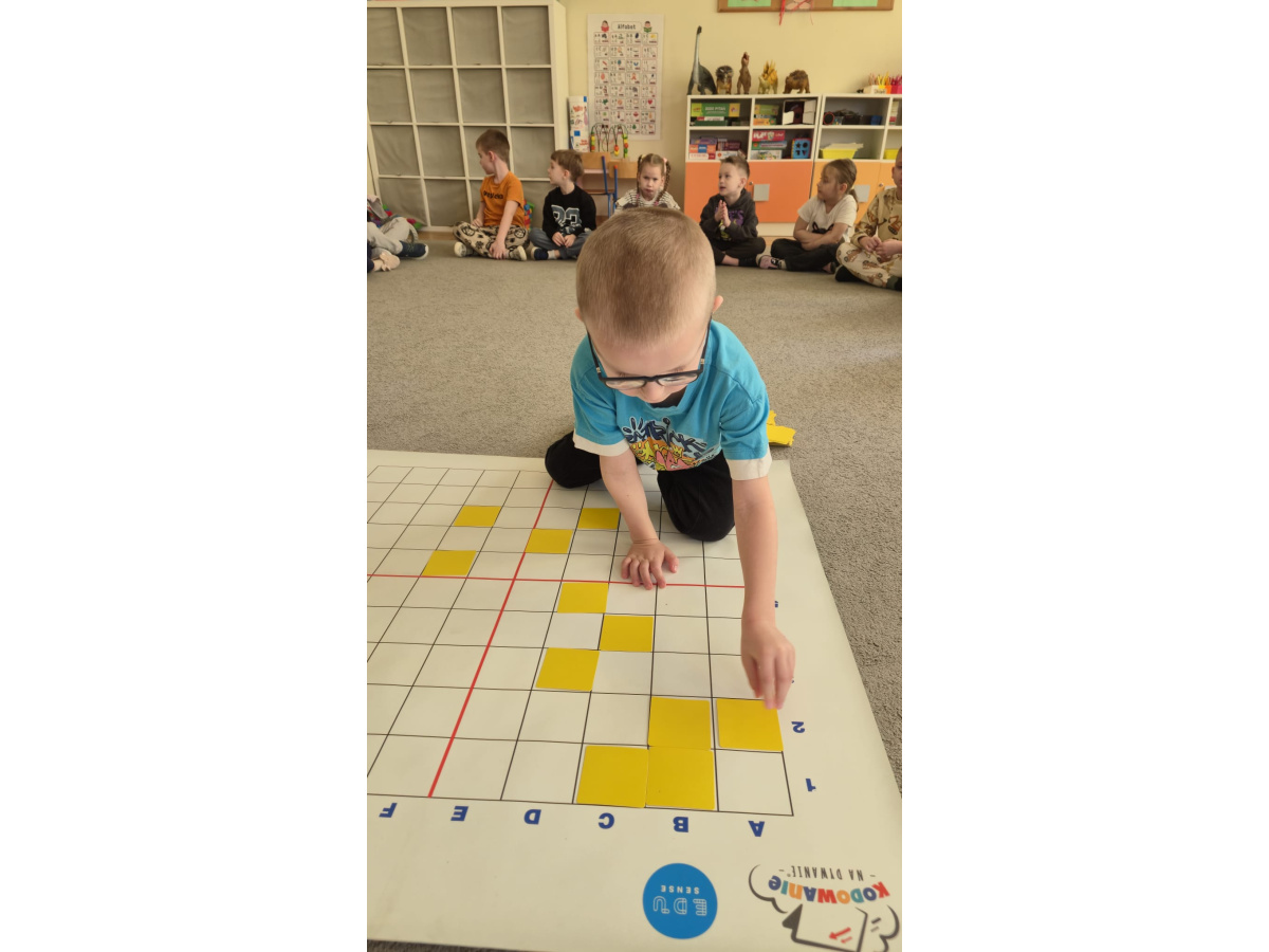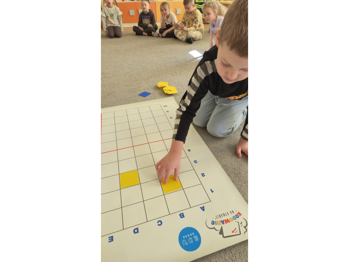 Na dywanie – kodujemy, Z uśmiechami programujemy! Bo nauka przez zabawę To przedszkolna jest podstawa!