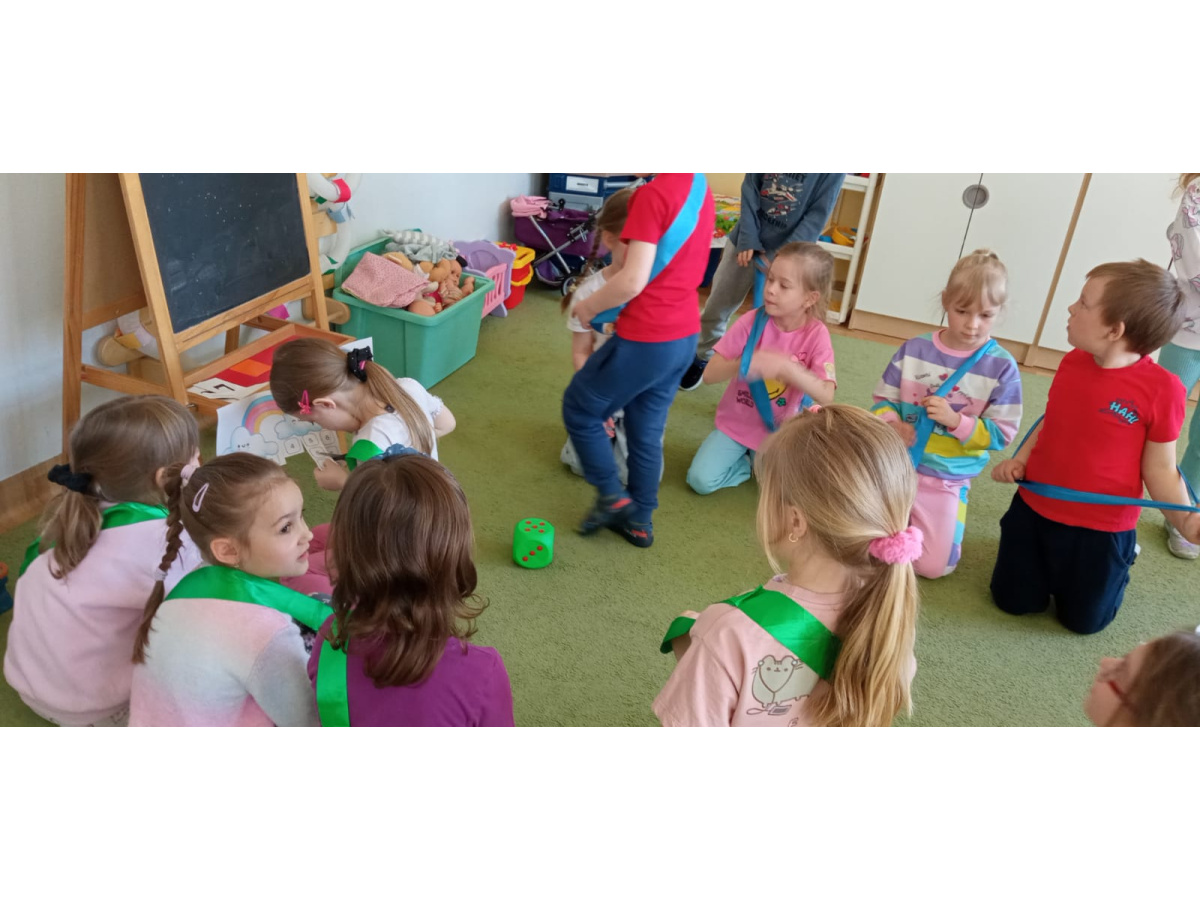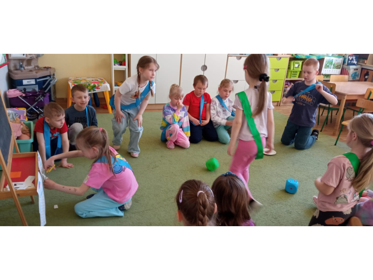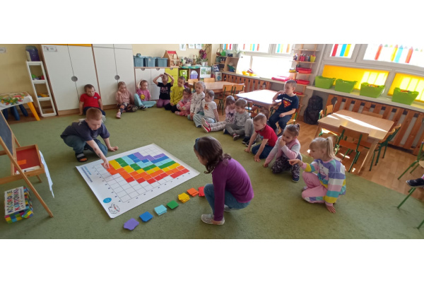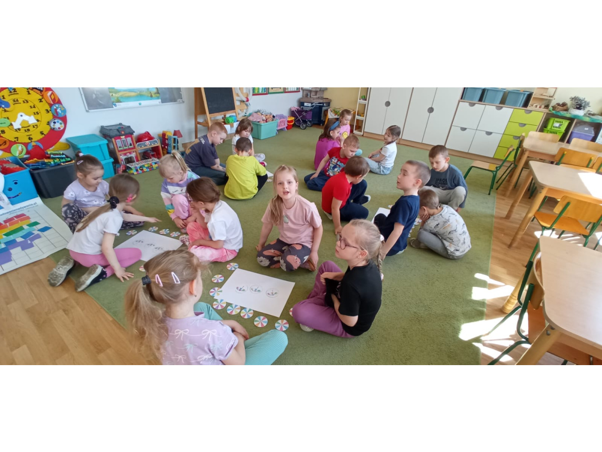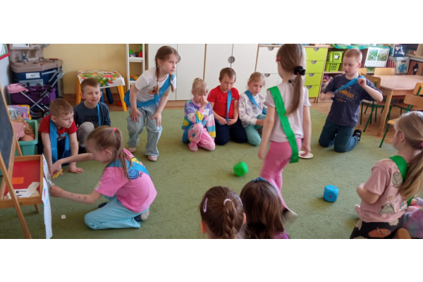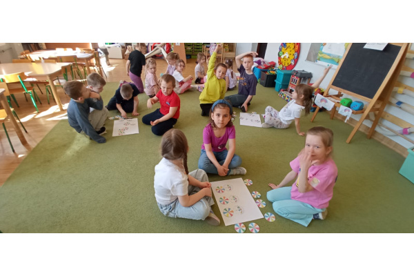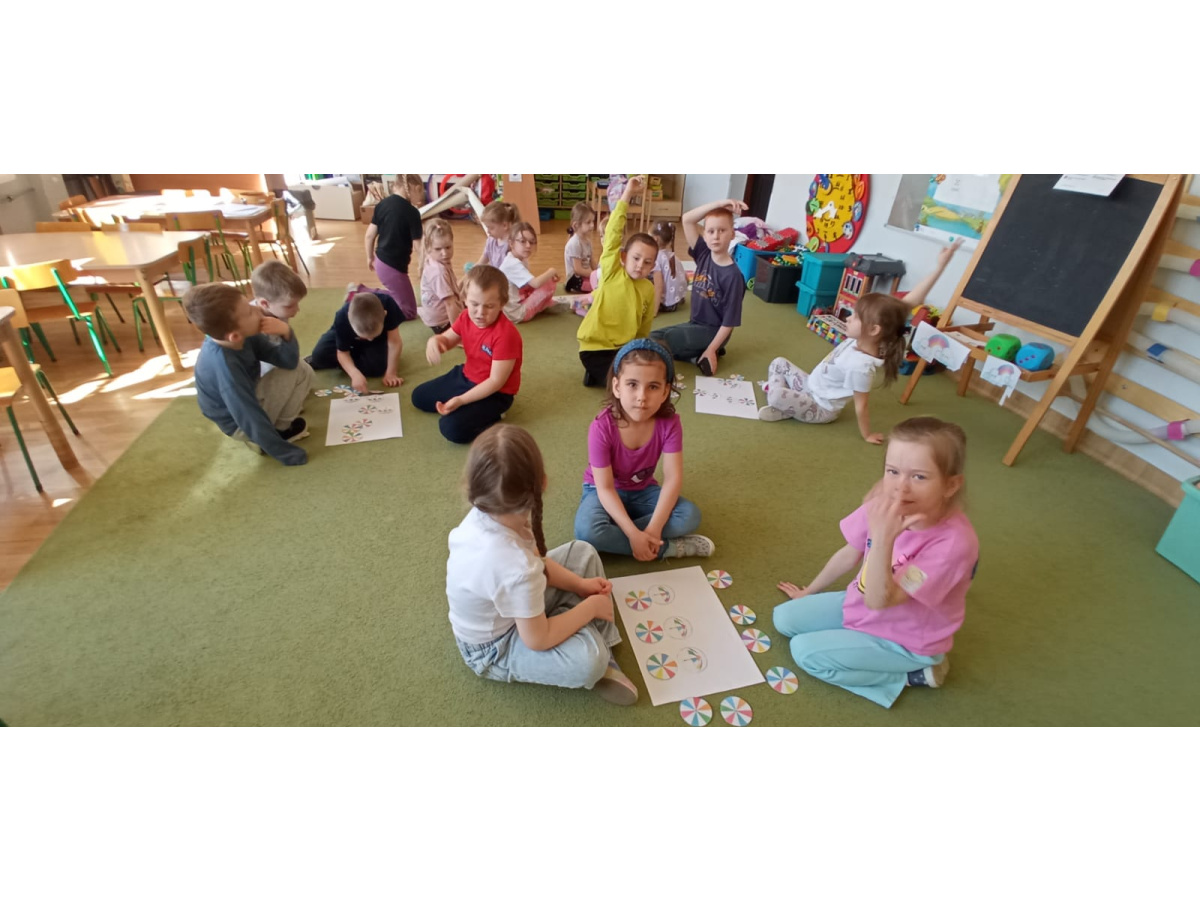 Dzieci ułożyły tęczę według kodu, Identyfikowały liczbę oczek na kostce z cyfrą w zabawie zespołowej z elementem rywalizacji. Układały parasole według kodu kolorystycznego w małych zespołach.
