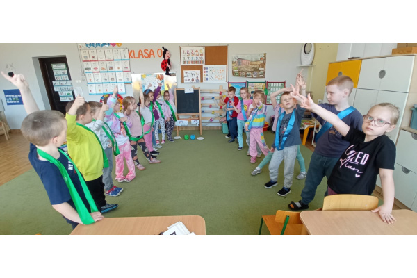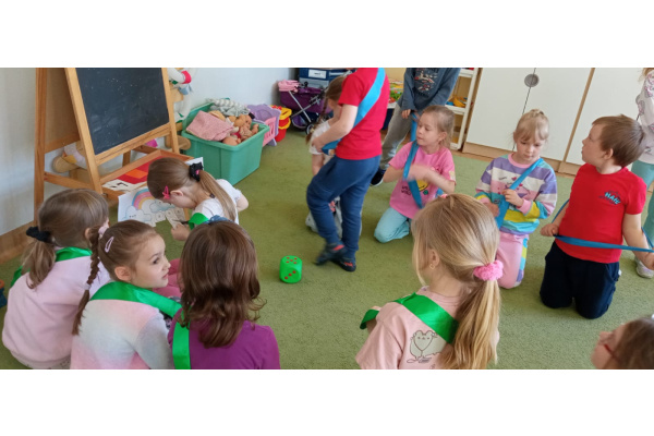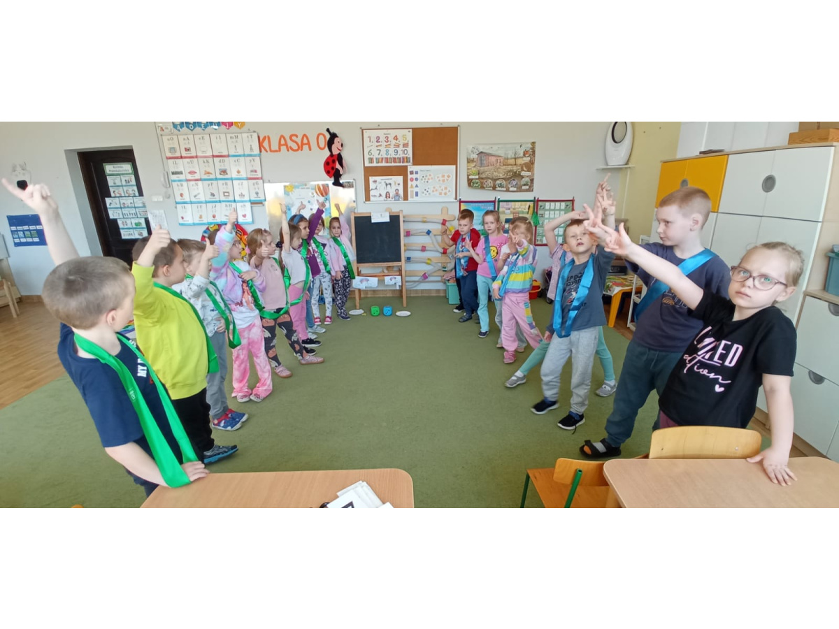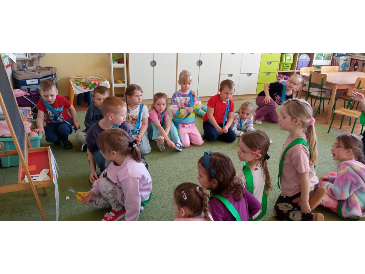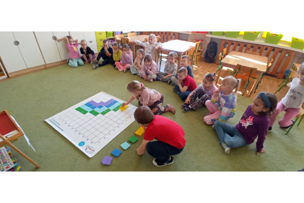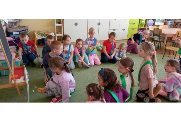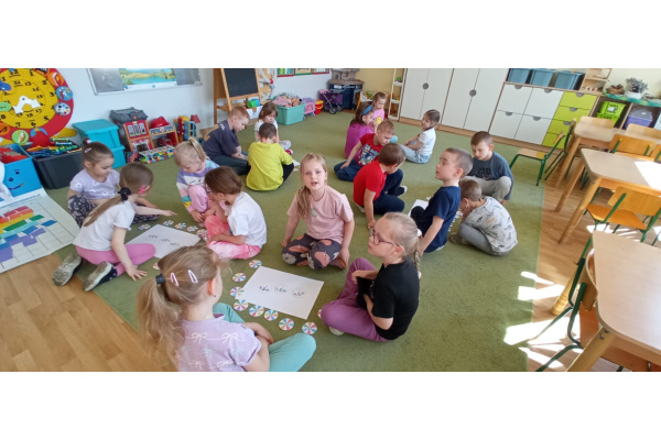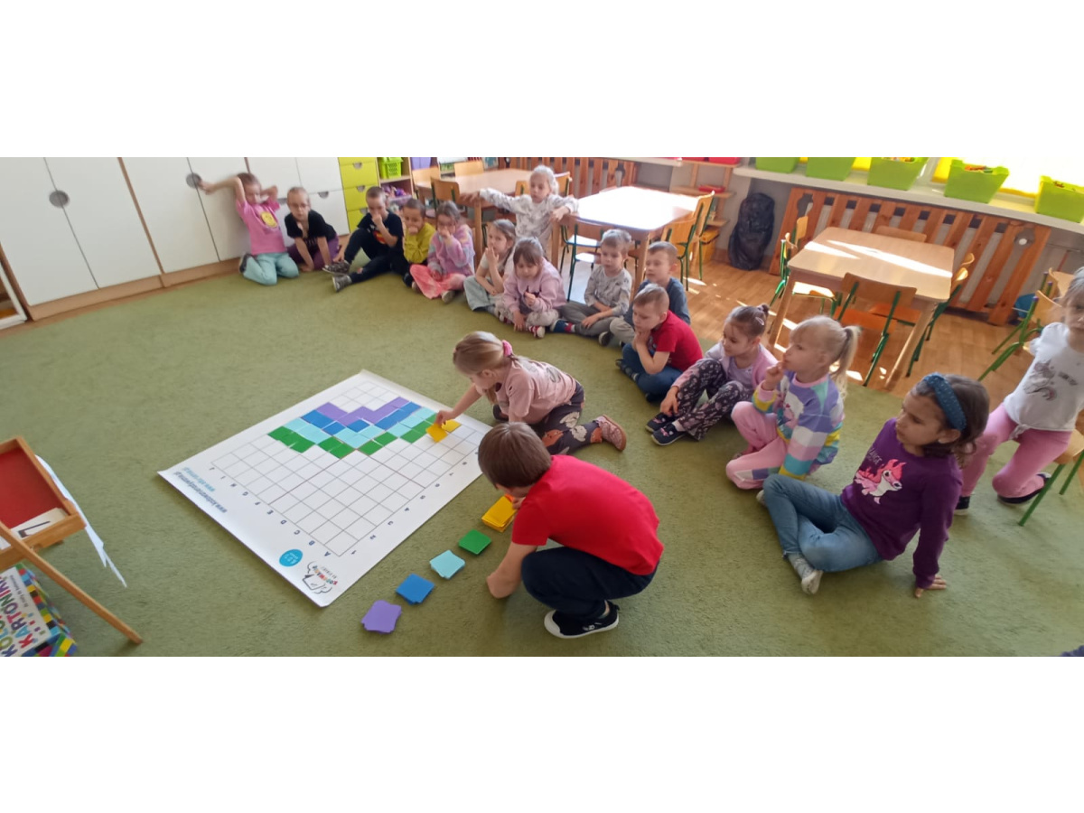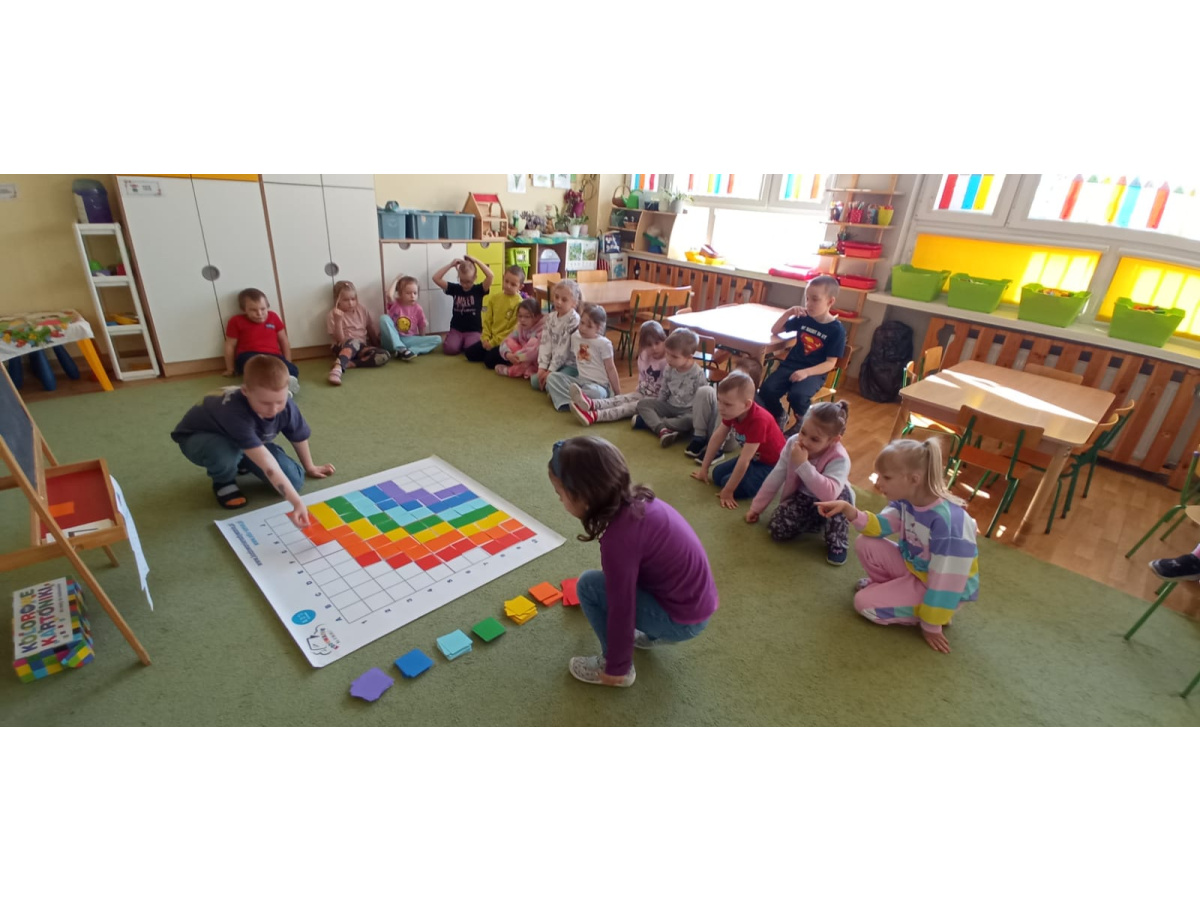 Dzieci ułożyły tęczę według kodu, Identyfikowały liczbę oczek na kostce z cyfrą w zabawie zespołowej z elementem rywalizacji. Układały parasole według kodu kolorystycznego w małych zespołach.