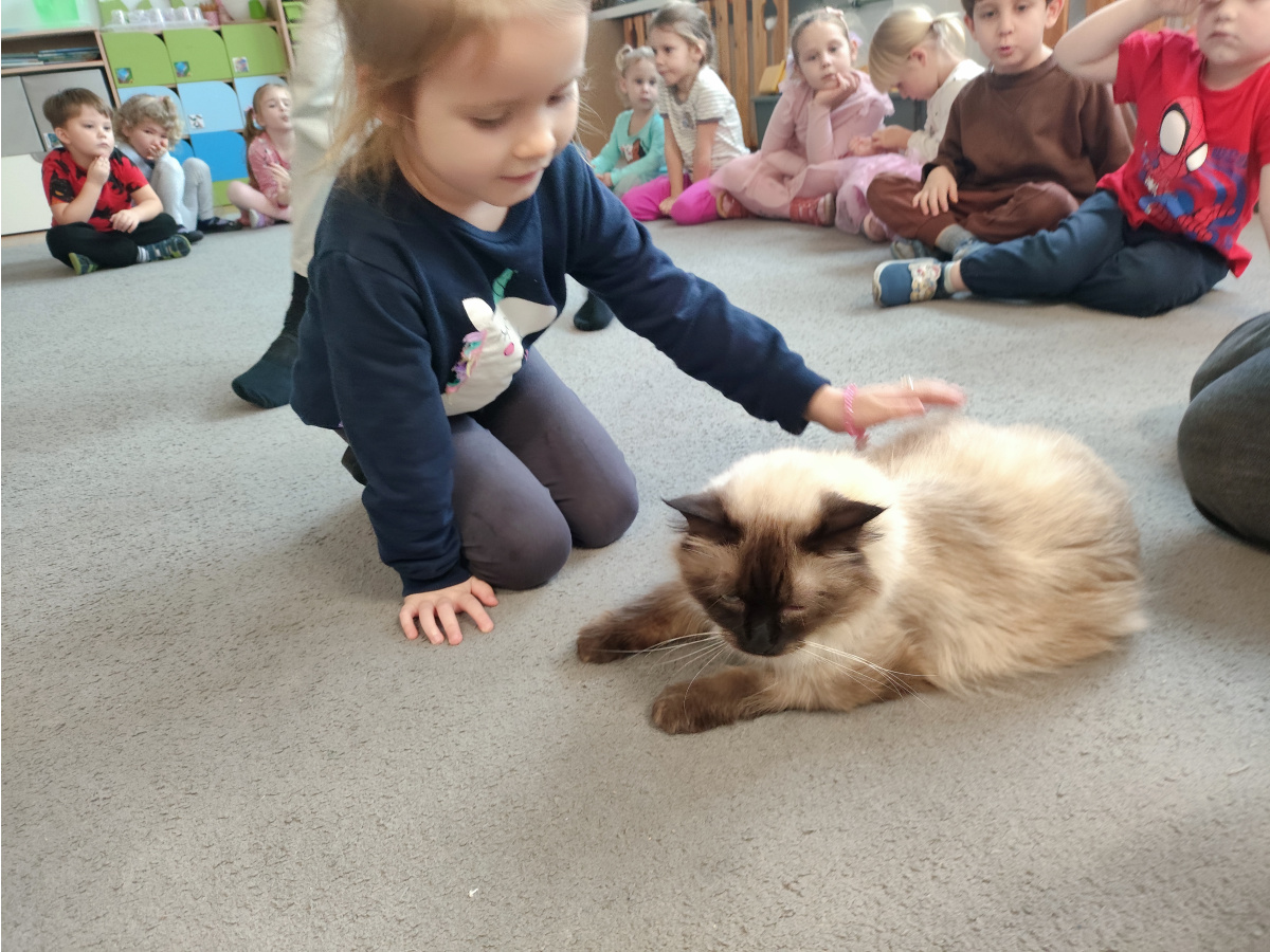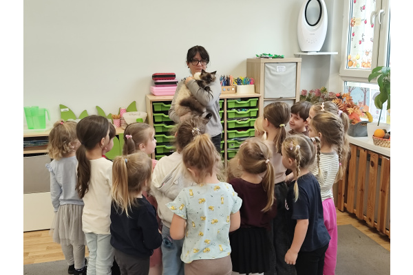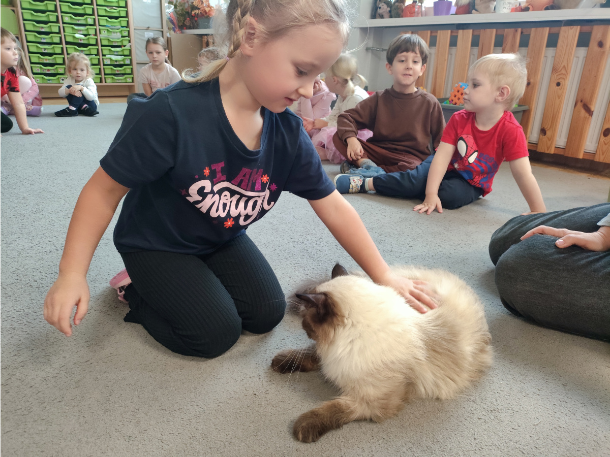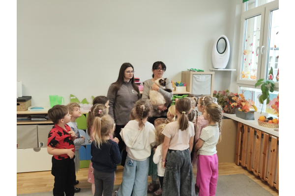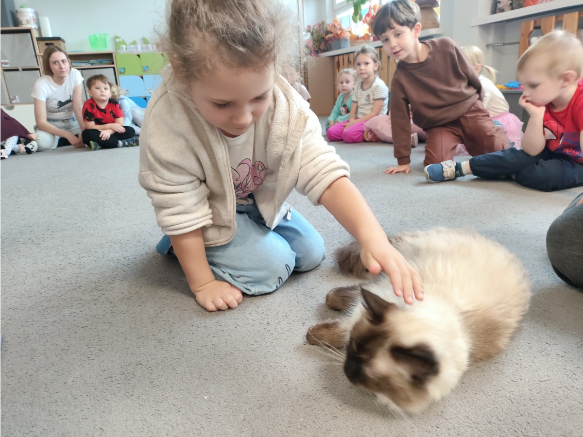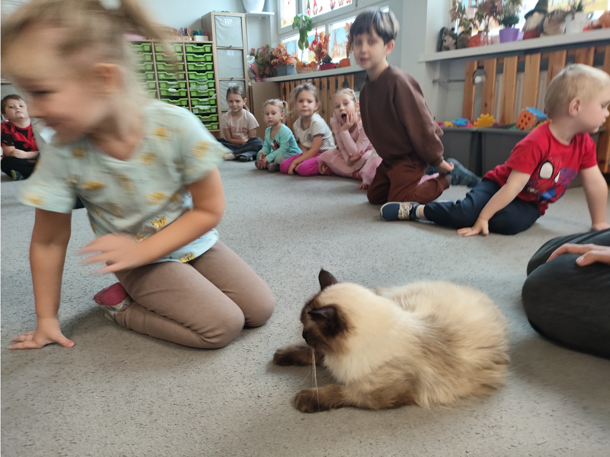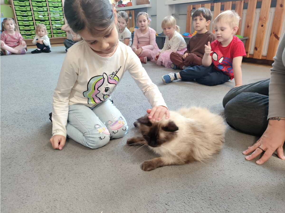 Podczas spotkania dzieci dowiedziały się, jak właściwie troszczyć się o domowe koty. Rozmawialiśmy o tym, co powinno znaleźć się w kocim domu, aby nasz pupil czuł się bezpiecznie i szczęśliwie. Największą atrakcją była jednak możliwość osobistego poznania Miszy – niezwykle towarzyskiego kociaka, który szybko zdobył serca wszystkich przedszkolaków (i niejednej pani nauczycielki!).