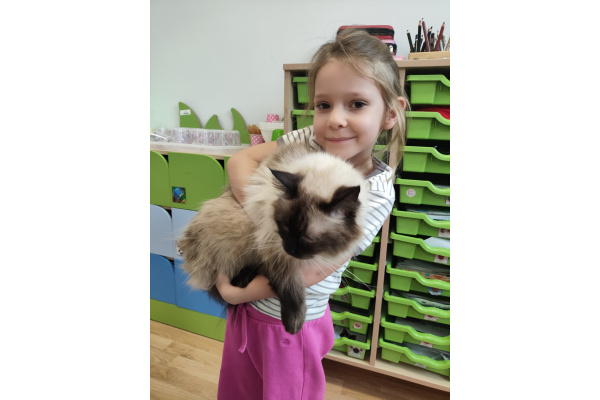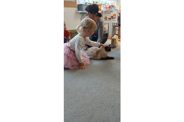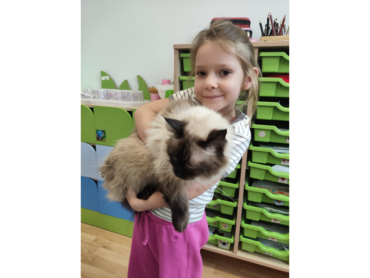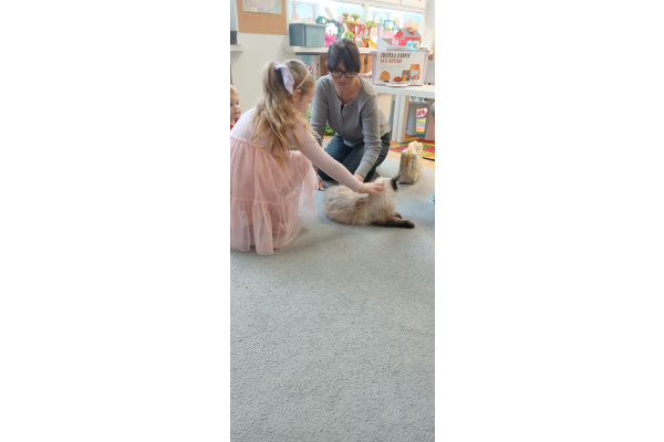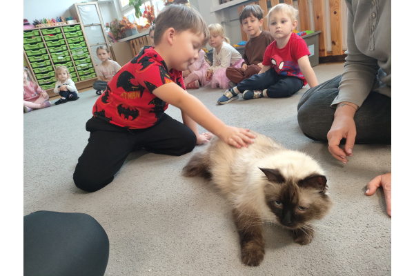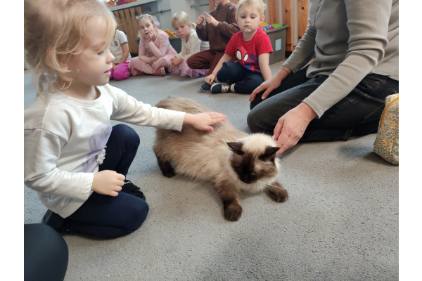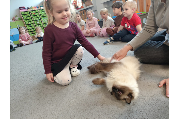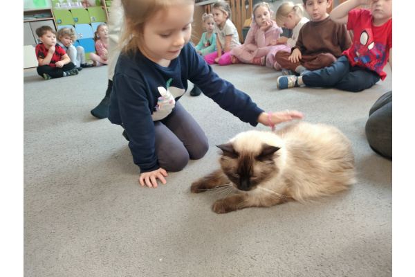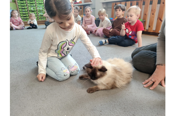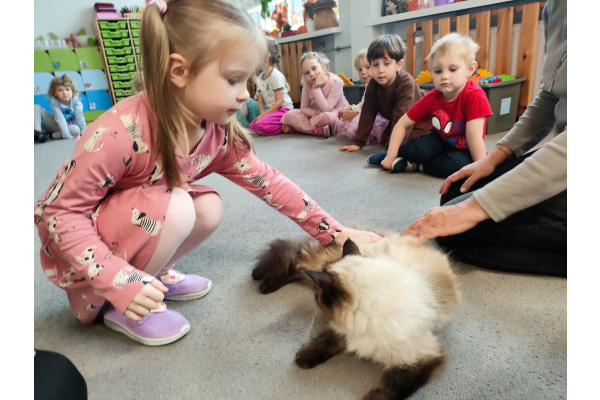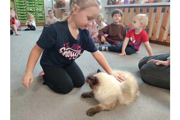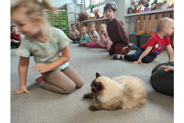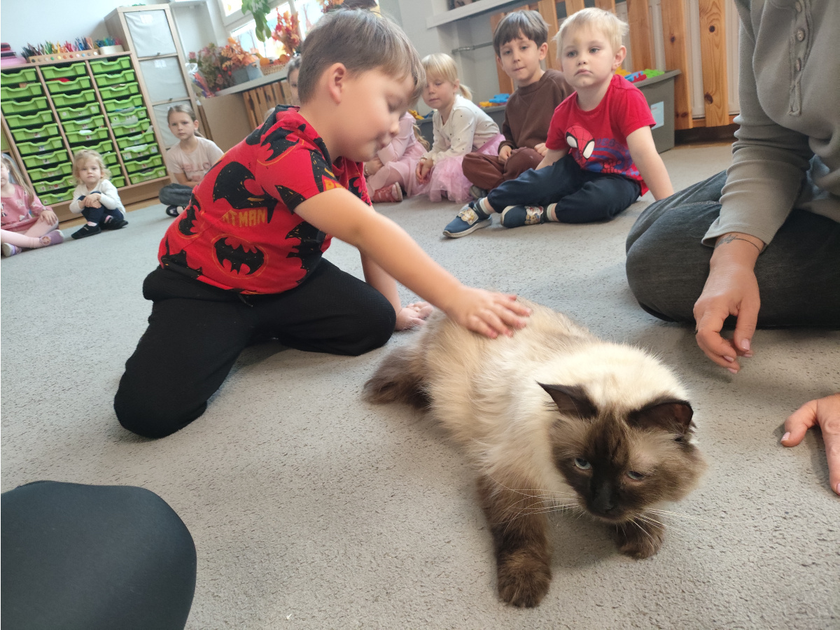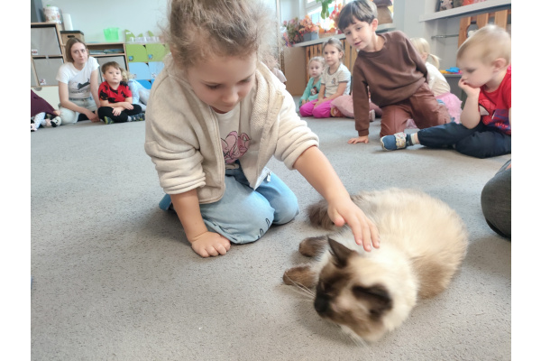 Podczas spotkania dzieci dowiedziały się, jak właściwie troszczyć się o domowe koty. Rozmawialiśmy o tym, co powinno znaleźć się w kocim domu, aby nasz pupil czuł się bezpiecznie i szczęśliwie. Największą atrakcją była jednak możliwość osobistego poznania Miszy – niezwykle towarzyskiego kociaka, który szybko zdobył serca wszystkich przedszkolaków (i niejednej pani nauczycielki!).