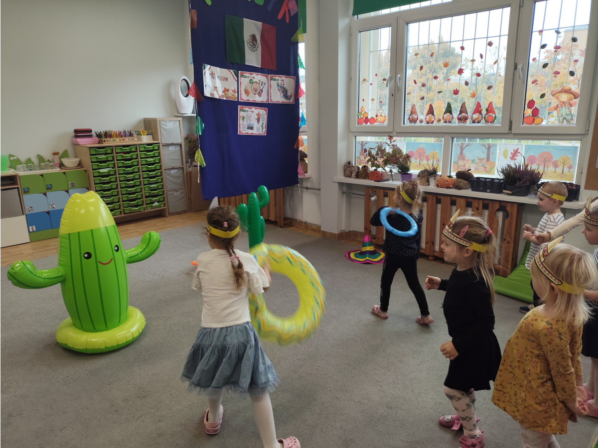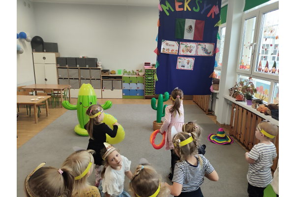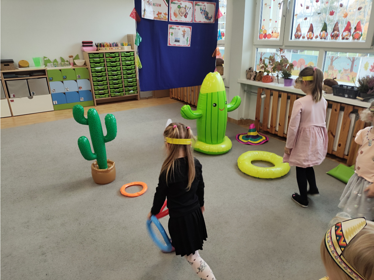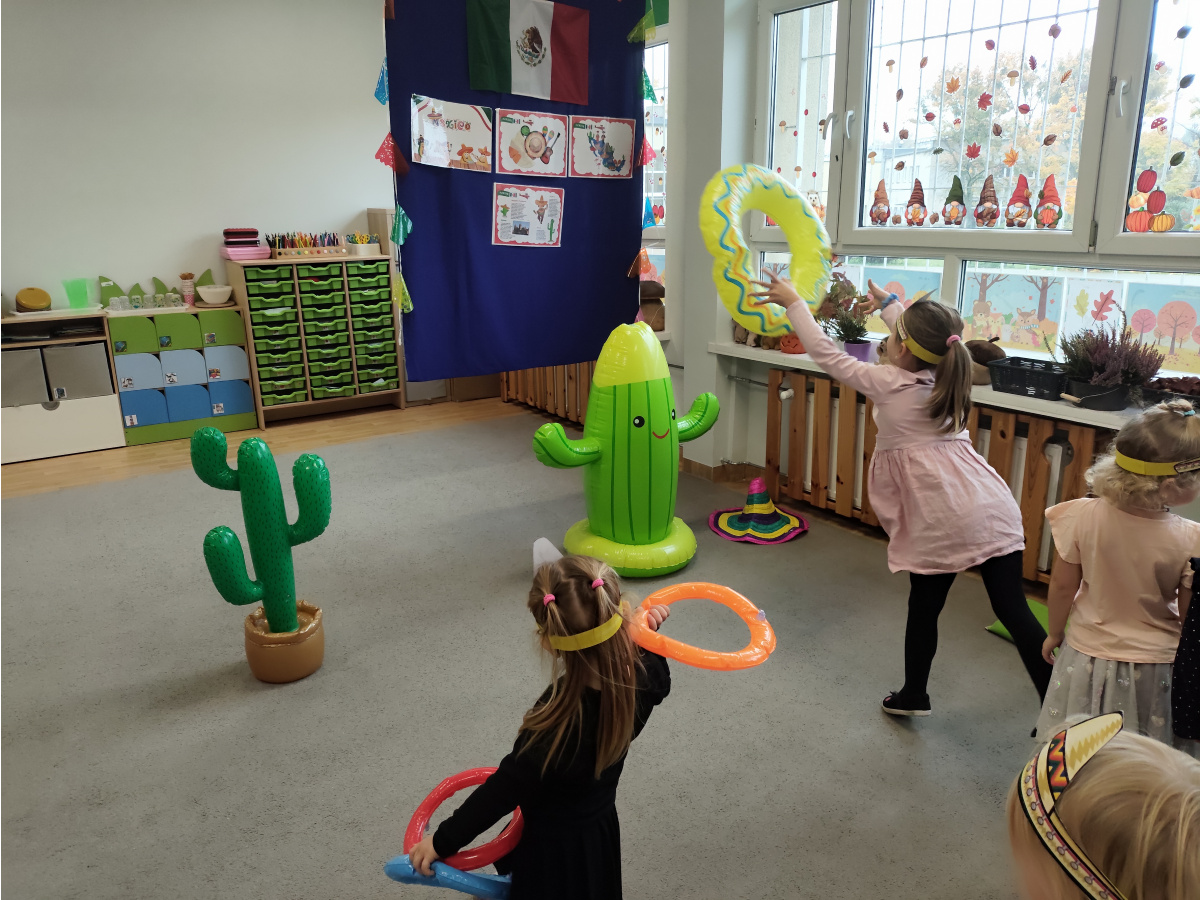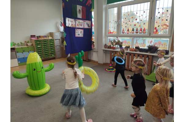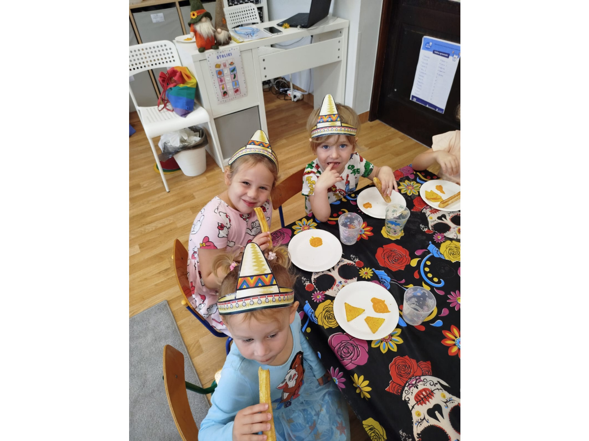 Krasnoludki bawiły się w rzuty do kaktusa, grały w tradycyjne meksykańskie gry oraz układały tematyczne puzzle, rozwijając przy tym spostrzegawczość i zdolności manualne. Tego dnia poznały także najbardziej popoluarne meksykańskie dania, a w przedszkolu miały okazję posmakować nachosów z sosem serowym oraz słodkiego przysmaku jakim są churossy.