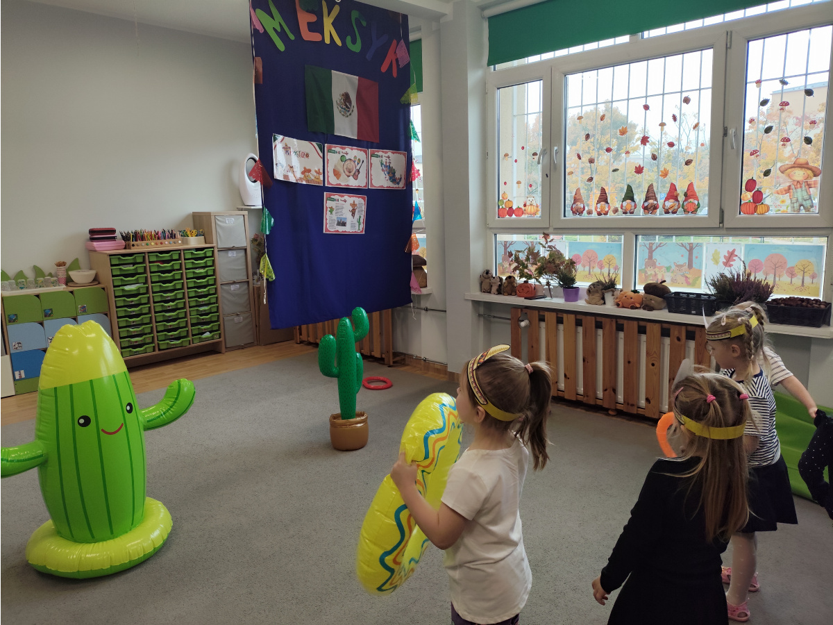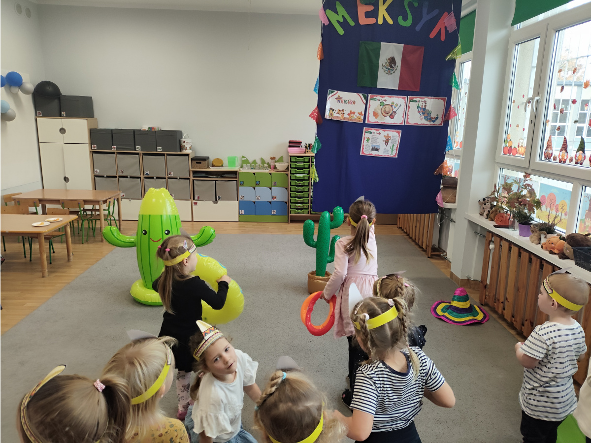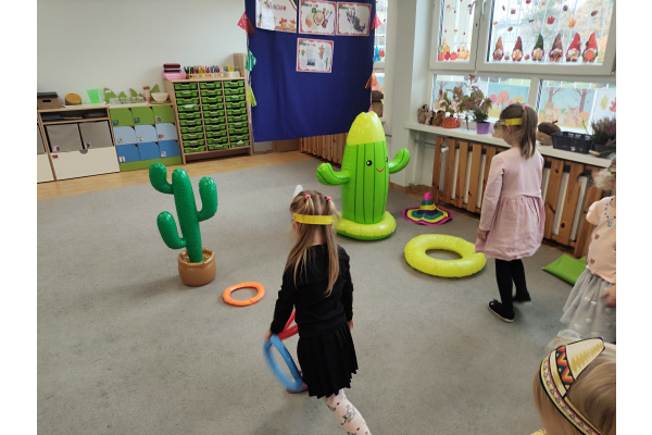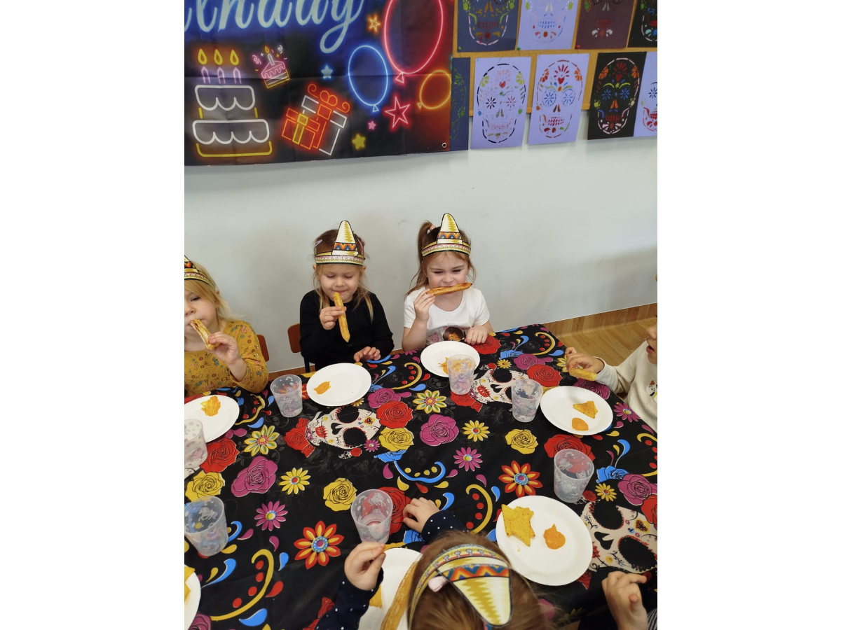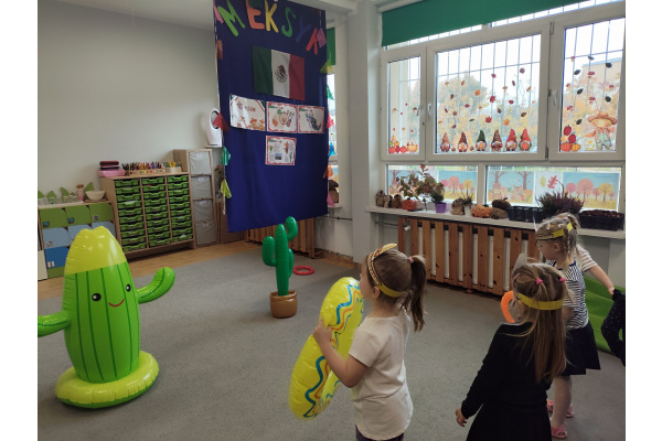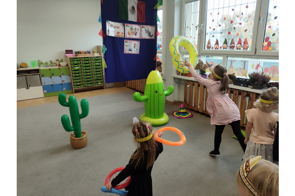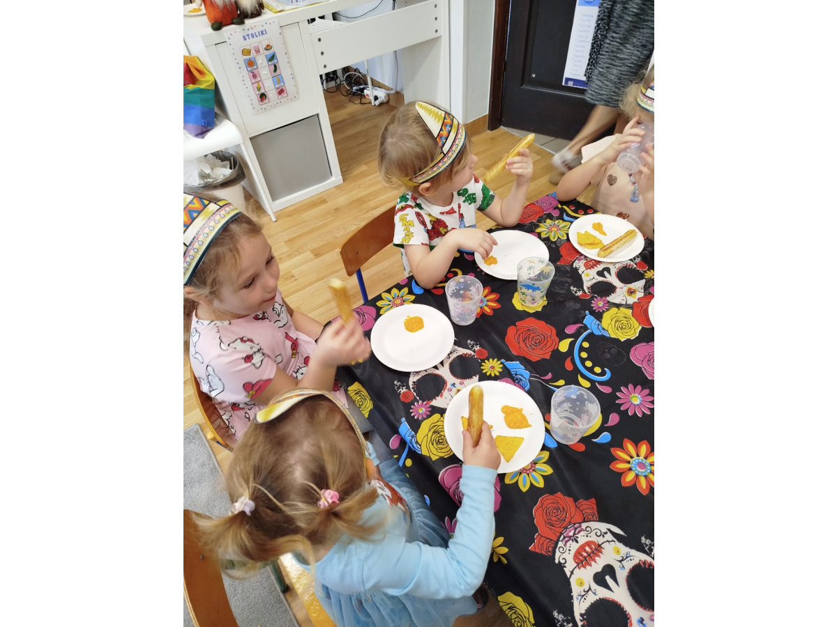 Krasnoludki bawiły się w rzuty do kaktusa, grały w tradycyjne meksykańskie gry oraz układały tematyczne puzzle, rozwijając przy tym spostrzegawczość i zdolności manualne. Tego dnia poznały także najbardziej popoluarne meksykańskie dania, a w przedszkolu miały okazję posmakować nachosów z sosem serowym oraz słodkiego przysmaku jakim są churossy.