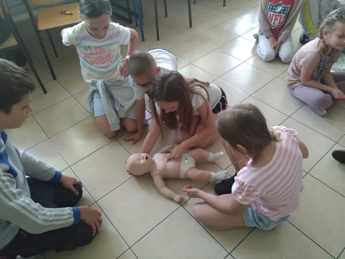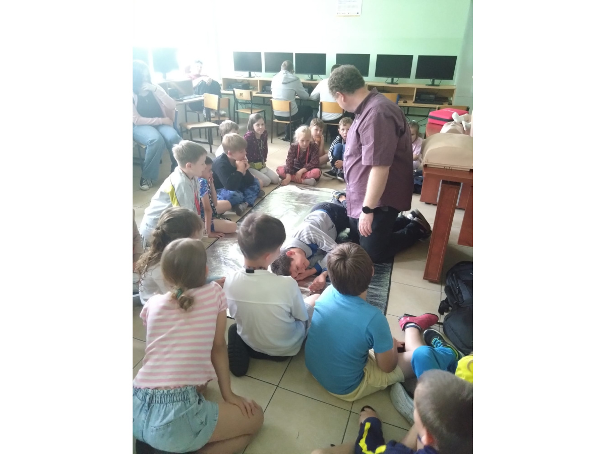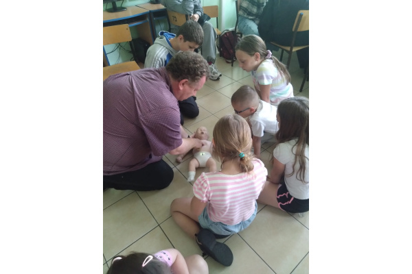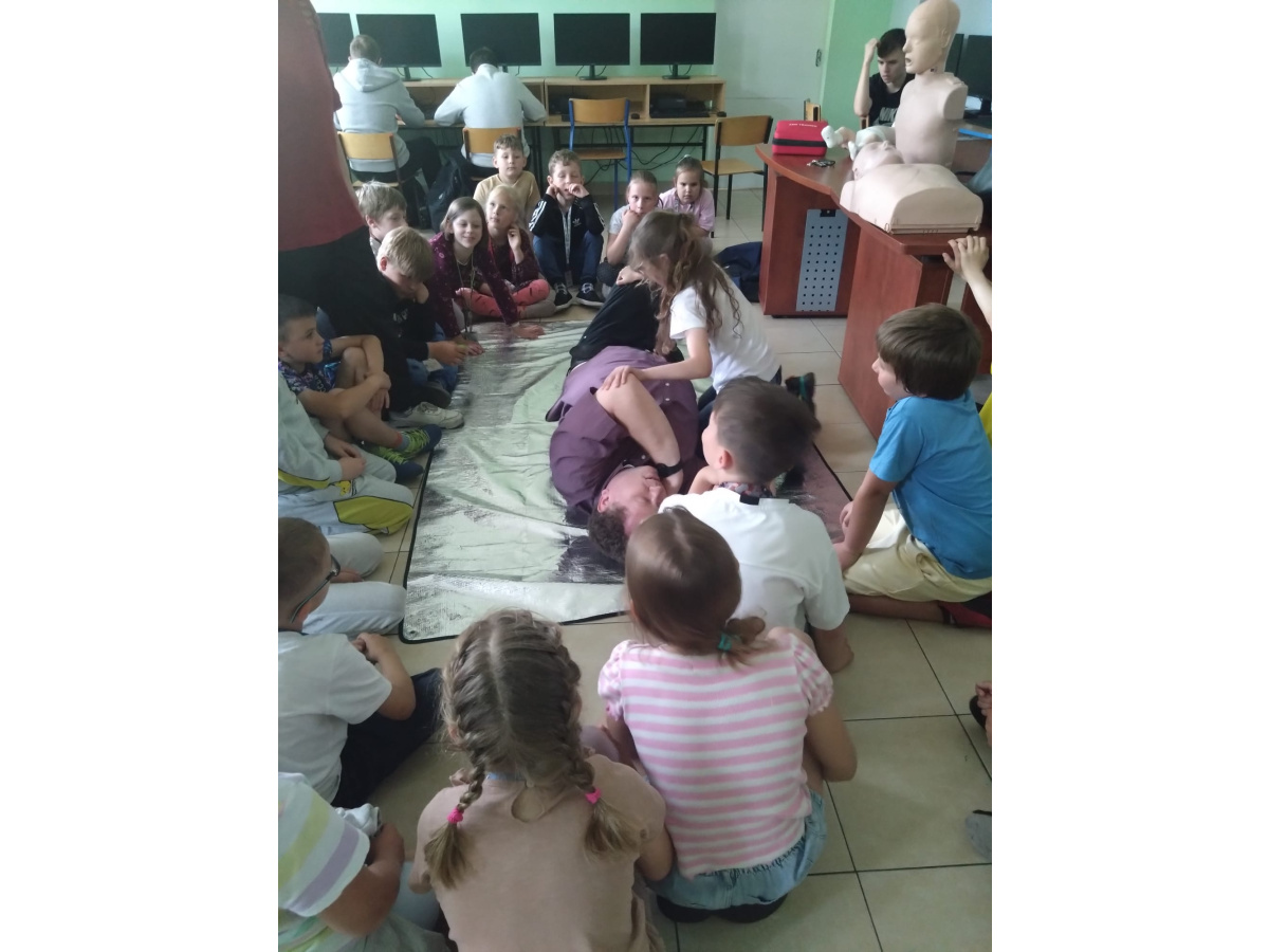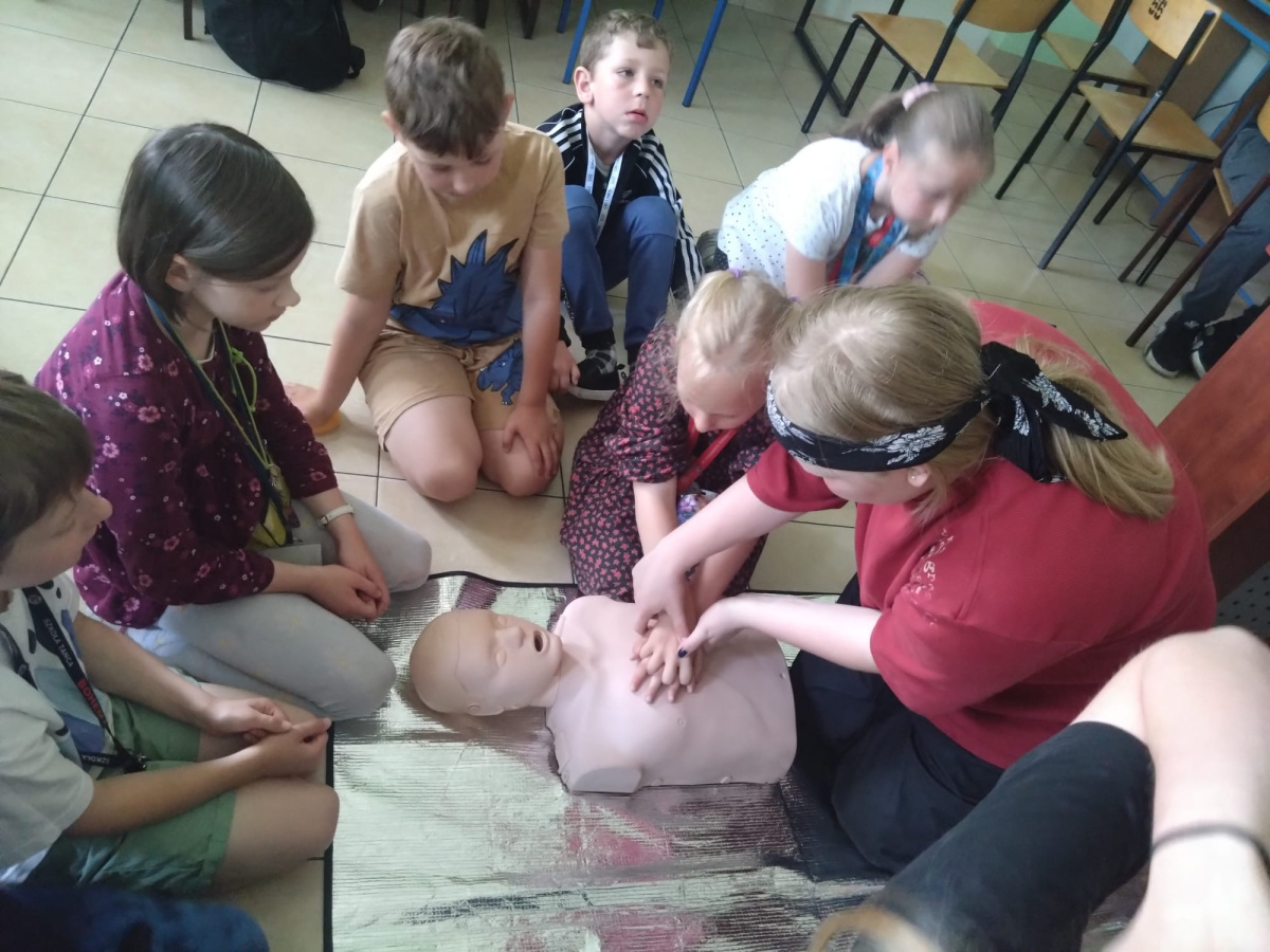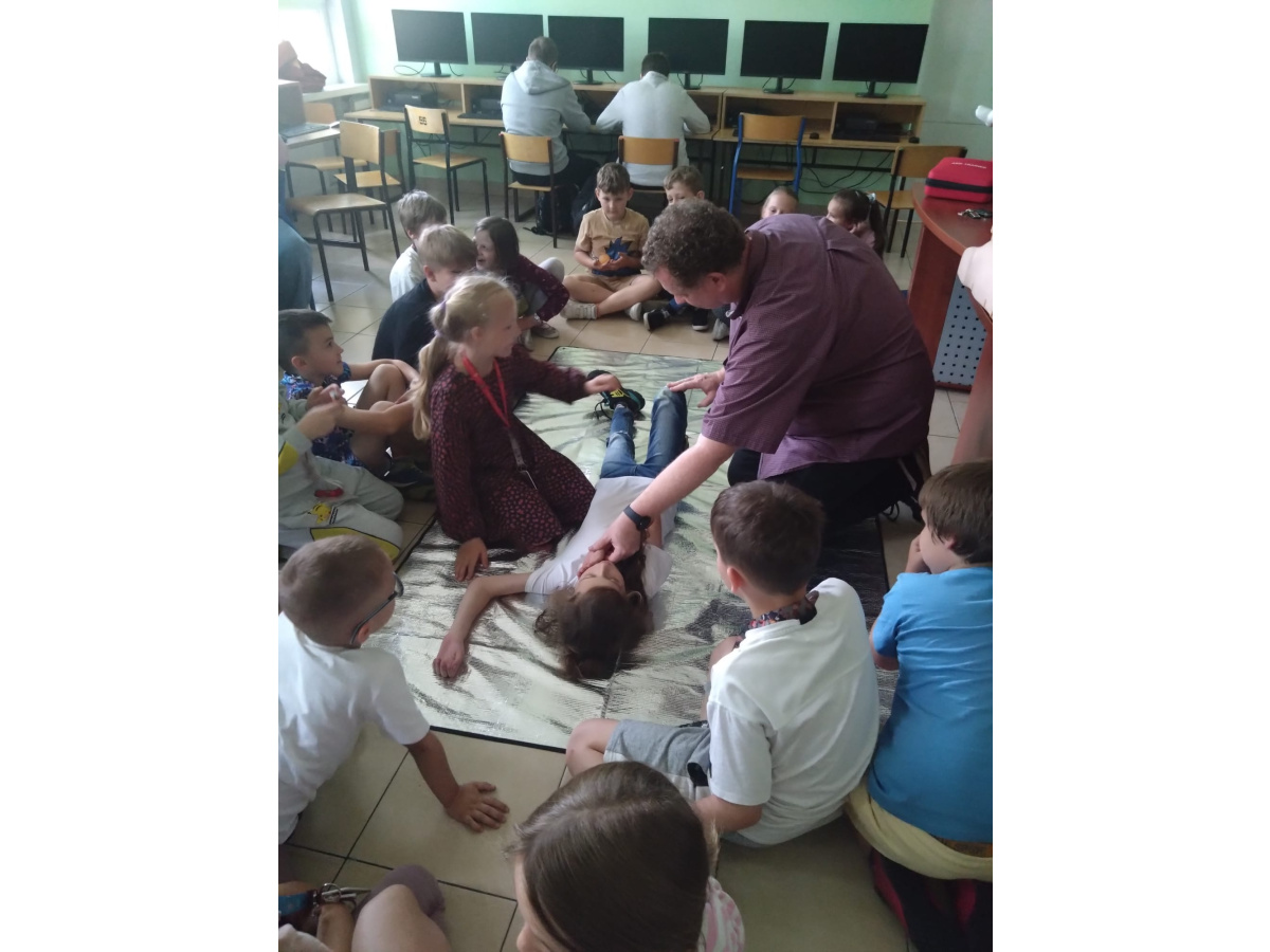 W dniu 17 czerwca 2025 roku w klasie 1a odbyła się wyjątkowa lekcja dotycząca pierwszej pomocy. Zajęcia prowadził Pan Łukasz, który jest doświadczonym instruktorem w tej dziedzinie. W roli pomocników wystąpili uczniowie klasy 8, którzy z zaangażowaniem wspierali młodszych kolegów i koleżanki.