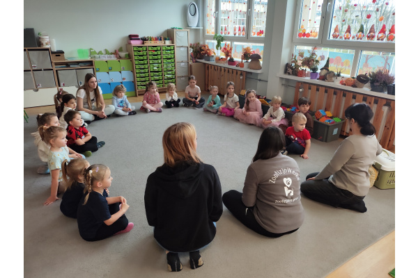 Grupę Krasnoludków odwiedzili wyjątkowi goście: Pani Weronika Suwińska – fizjoterapeutka zwierząt, Pani Ewa Pecyna – technik weterynarii oraz właścicielka Domu Tymczasowego dla Zwierząt „Dom Pełen Futra”, a wraz z nimi nie kto inny, jak kot Misza – prawdziwy ekspert od mruczenia i rozdawania urokliwych spojrzeń.
