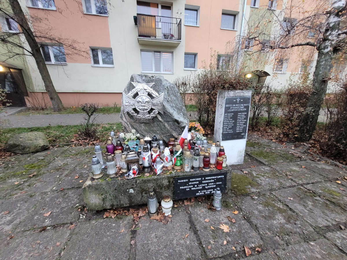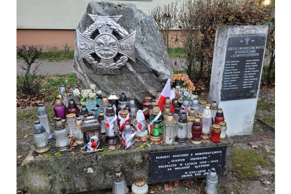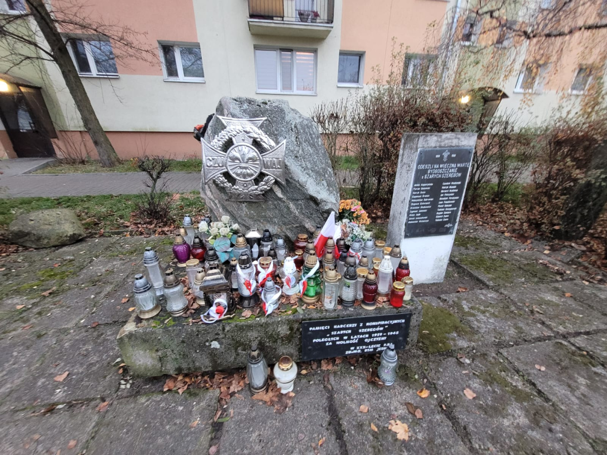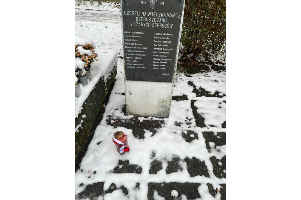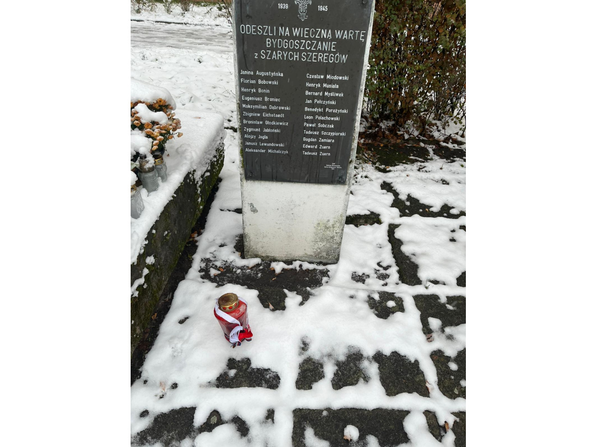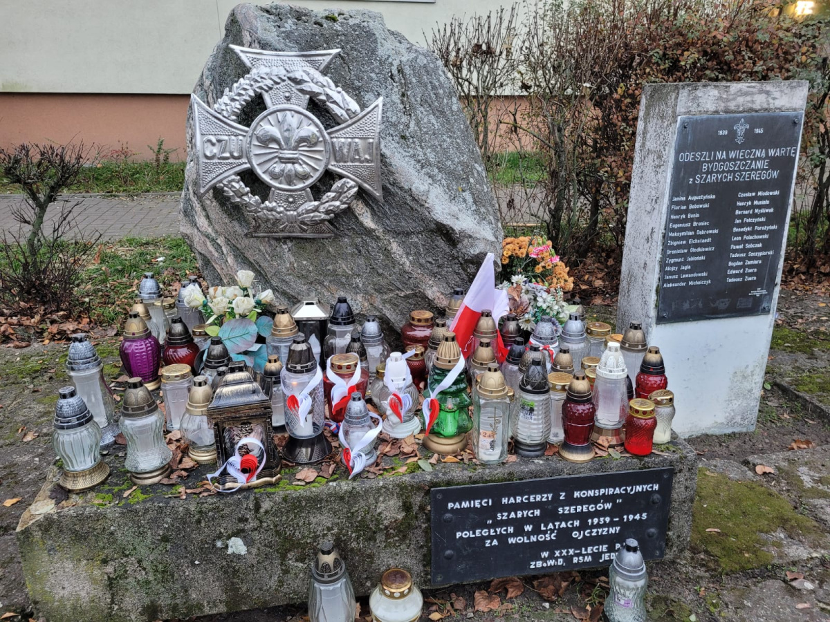 Przygotowaliśmy biało-czerwone serca z wstążek i ozdobiliśmy nimi znicze które zostały zapalone przy pomniku z harcerskim krzyżem przy ul. Szarych Szeregów dedykowanym jpamięci harcerzy-konspiratorów poległych w obronie ojczyzny oraz harcerzy-bydgoszczan – należących do Szarych Szeregów