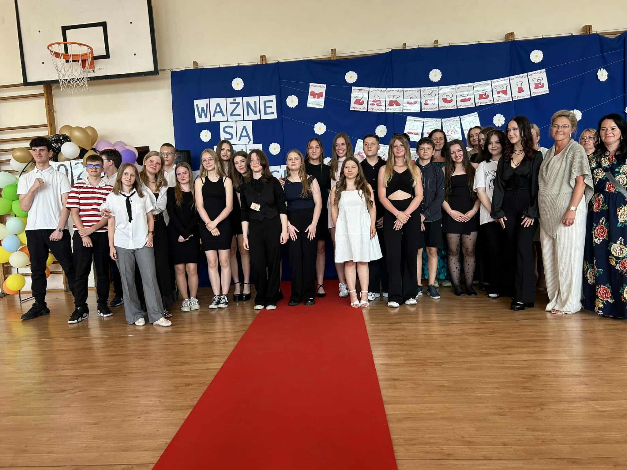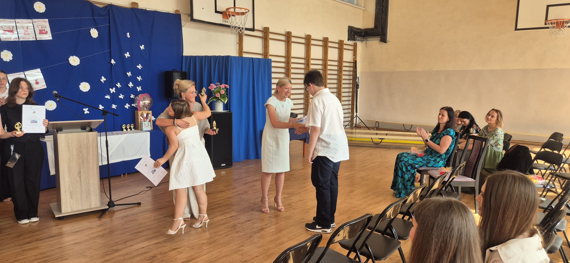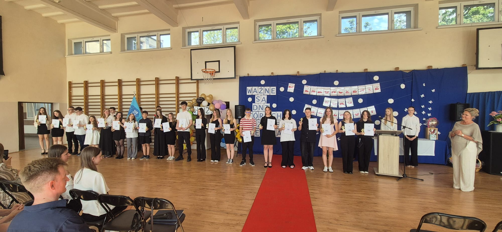 Uroczystość była także okazją do nagrodzenia uczniów, którzy zakończyli edukację z najwyższą średnią, osiągnęli sukcesy na płaszczyźnie edukacyjnej i sportowej oraz wyróżnili się w działaniach na rzecz szkoły i lokalnego środowiska. Podziękowania odebrali wspierający ich rodzice. Słowa wdzięczności kierowane były też dla nauczycieli i pracowników szkoły. Symbolicznym momentem było przekazanie przez ósmoklasistów ich młodszym kolegom sztandaru szkoły. W "Alei Gwiazd" żegnali najstarszych kolegów uczniowie z klasy 7b.