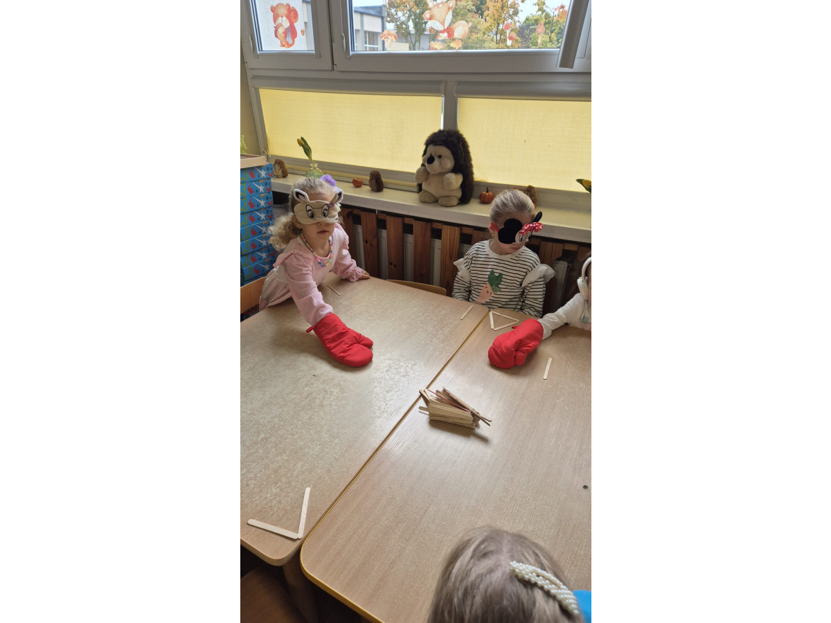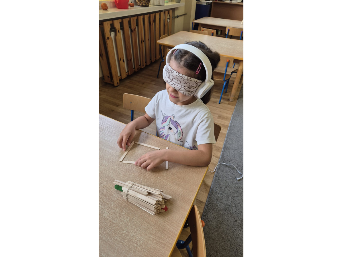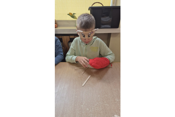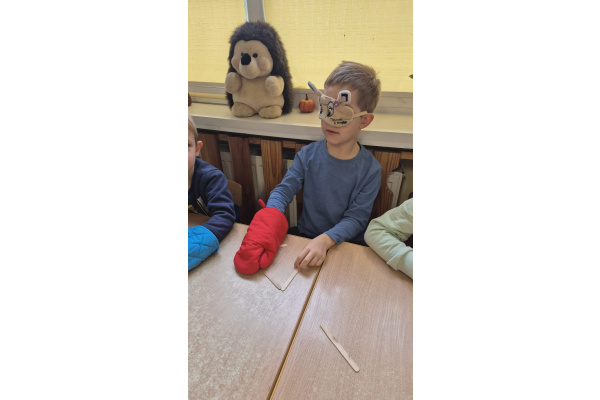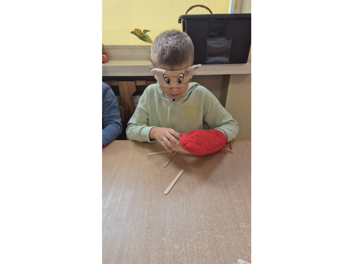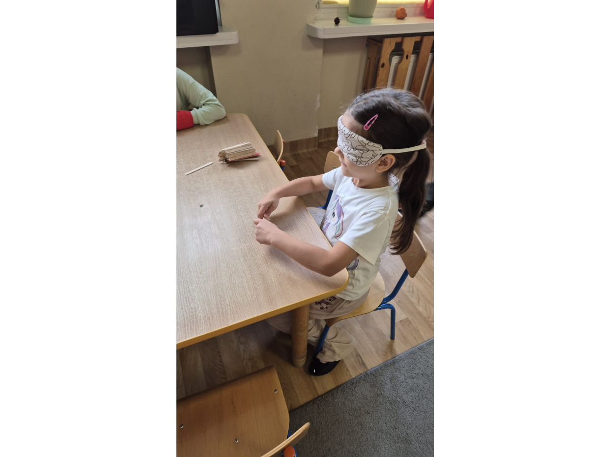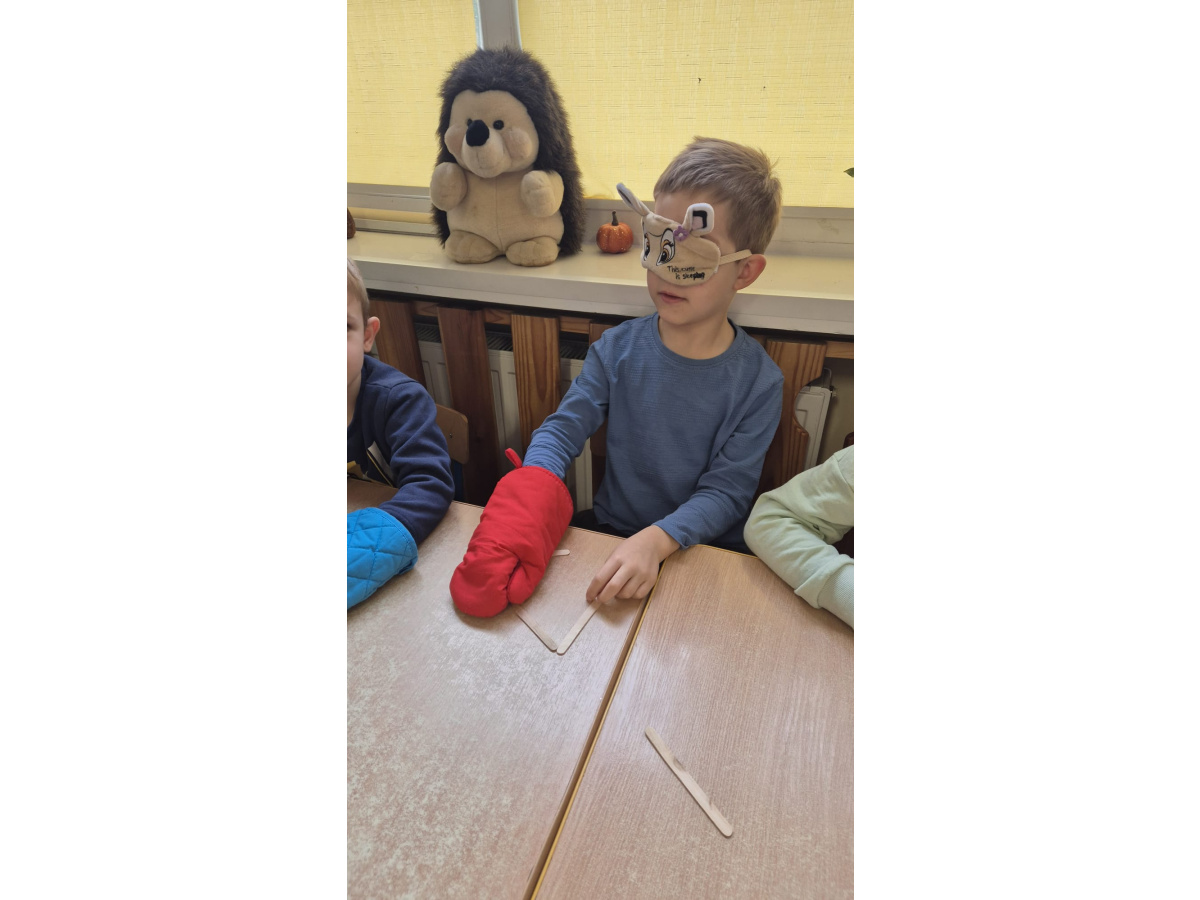 Warsztaty były pełne emocji i zabawy! Dzieci łapały patyczki w rękawicach kuchennych z zamkniętymi oczami, co pozwoliło im doświadczyć, jak trudne mogą być codzienne czynności dla osób z ograniczeniami. Układały też figury geometryczne z patyczków, rozwijając wyobraźnię i zdolności manualne. Na zakończenie — nie lada wyzwanie! Przedszkolaki chodziły w płetwach, ucząc się równowagi i współpracy.