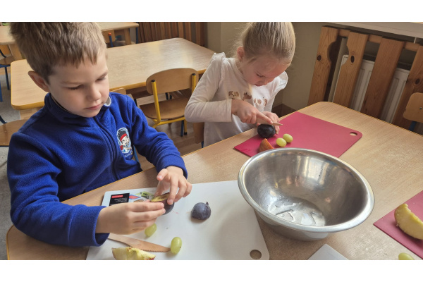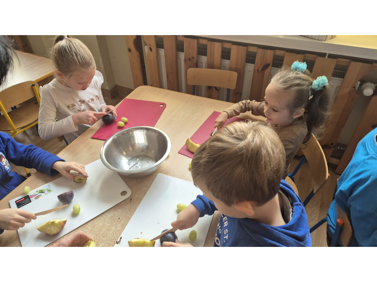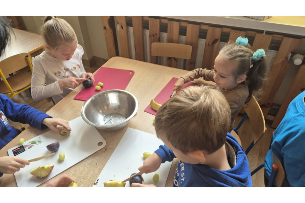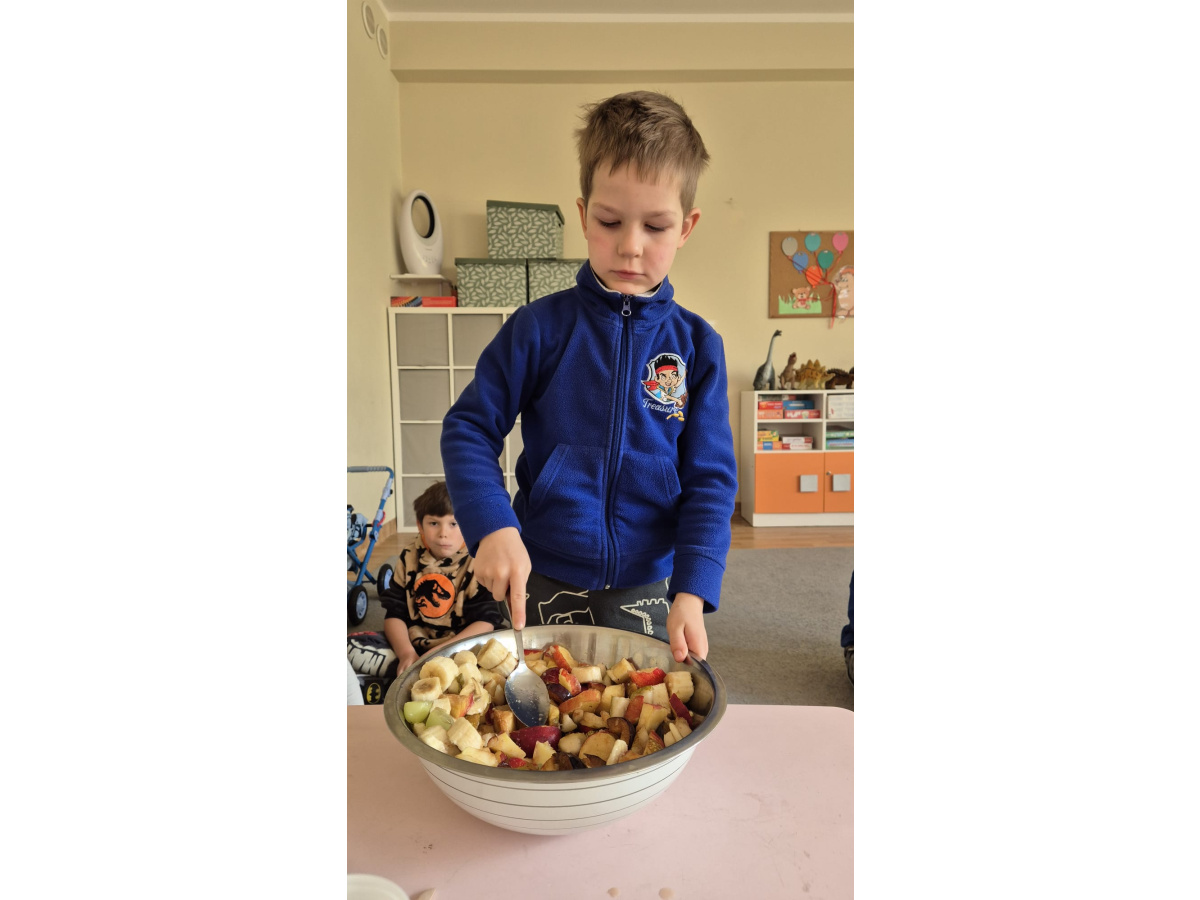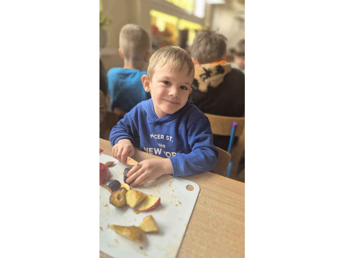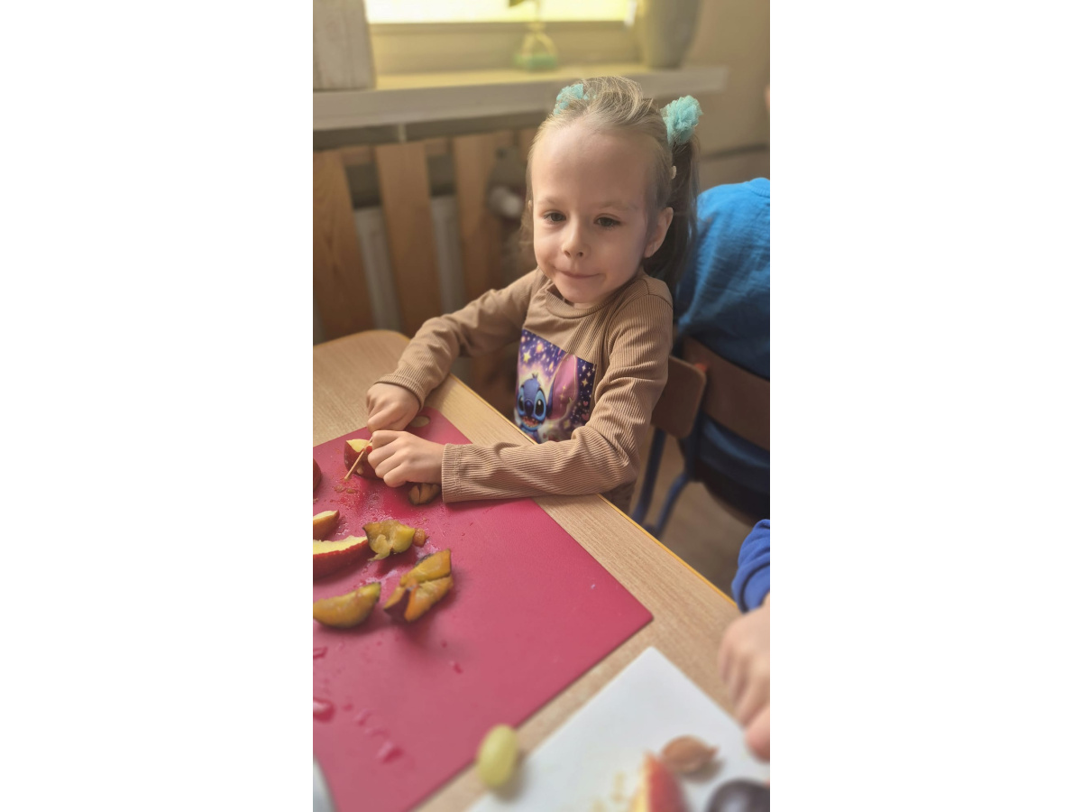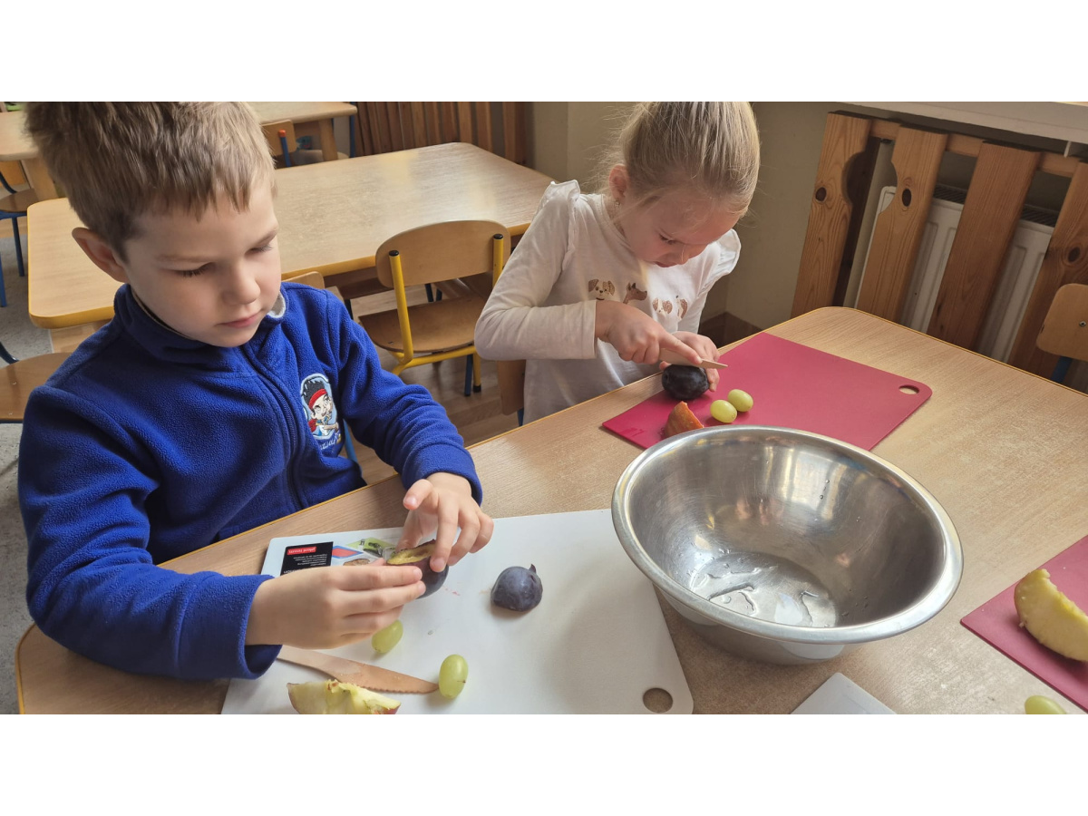 Dzieci z zaangażowaniem umyły a następnie pokroimy owoce. Podczas zajęć przedszkolaki uczyły się rozpoznawać owoce, rozwijały umiejętności współpracy i samodzielności. Na koniec wszyscy z apetytem zajadali przygotowane pyszności. Było kolorowo, zdrowo i bardzo smacznie!