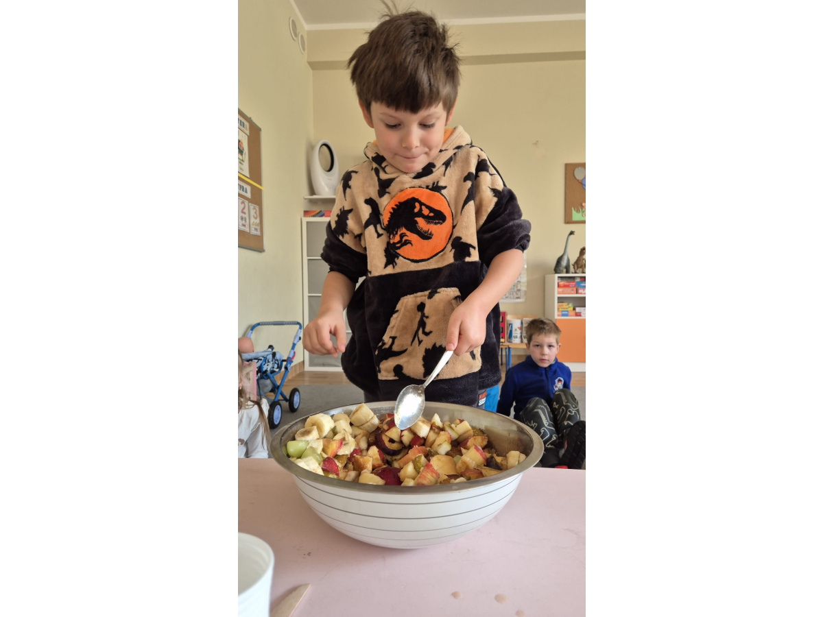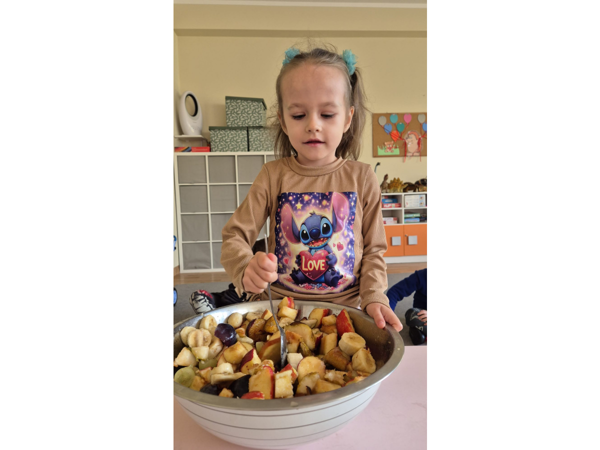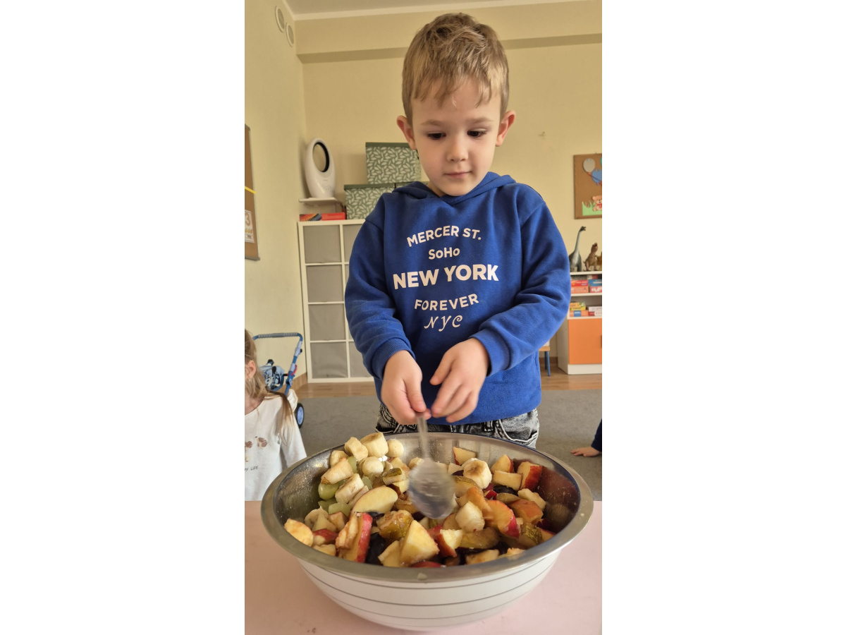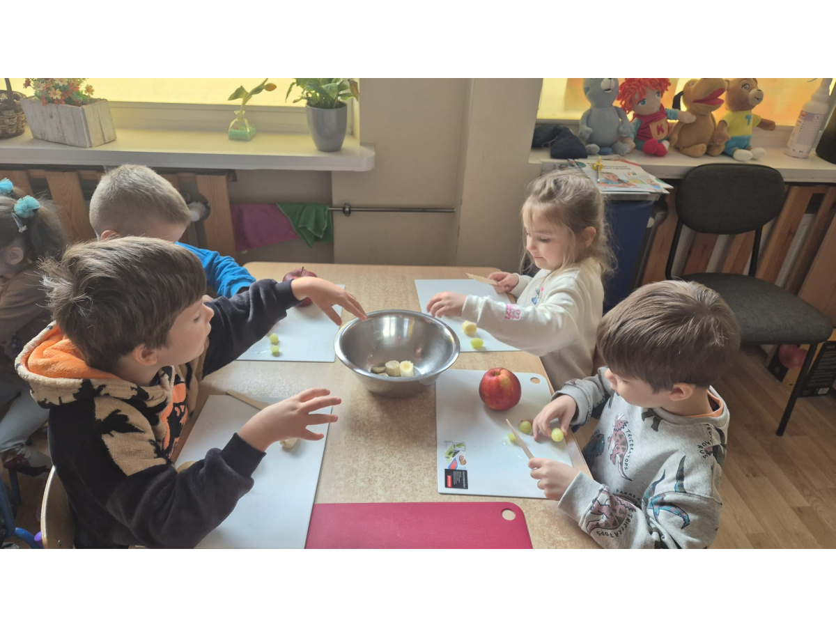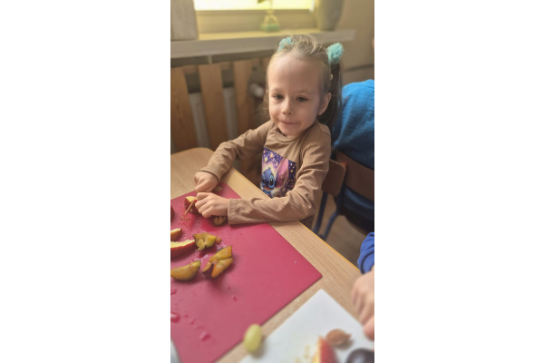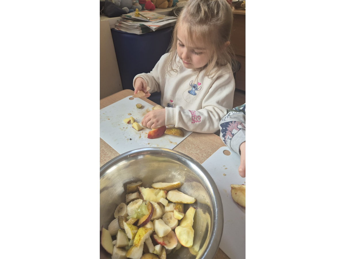 Dzieci z zaangażowaniem umyły a następnie pokroimy owoce. Podczas zajęć przedszkolaki uczyły się rozpoznawać owoce, rozwijały umiejętności współpracy i samodzielności. Na koniec wszyscy z apetytem zajadali przygotowane pyszności. Było kolorowo, zdrowo i bardzo smacznie!