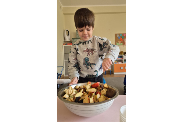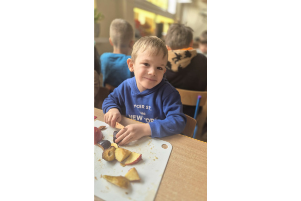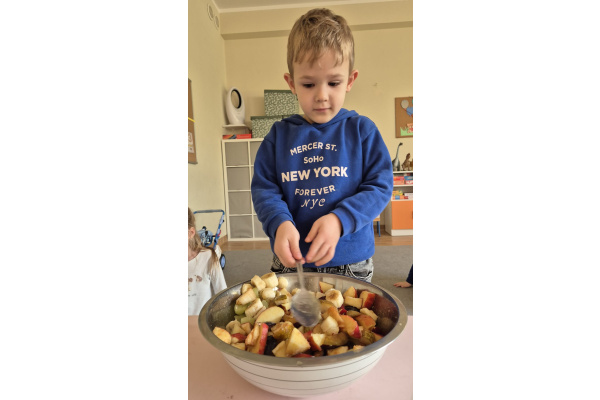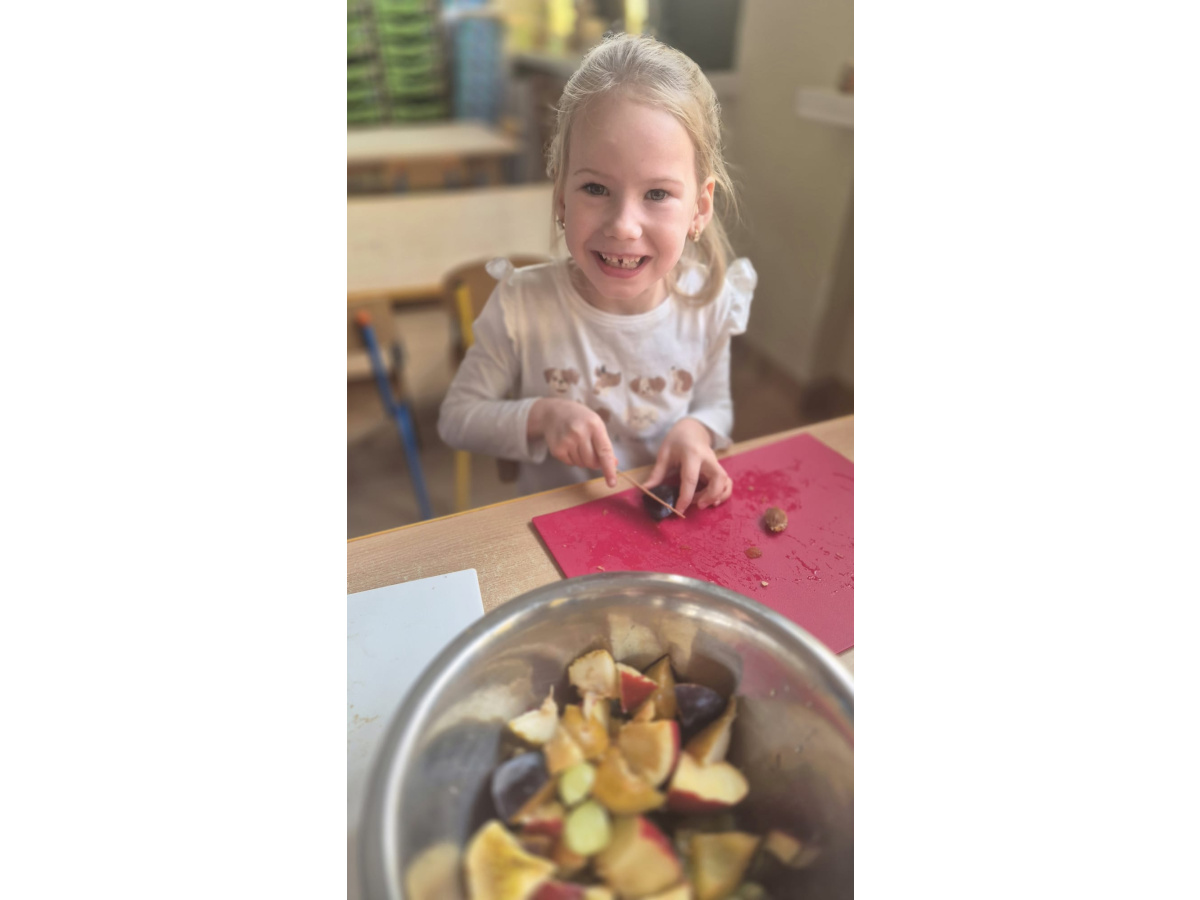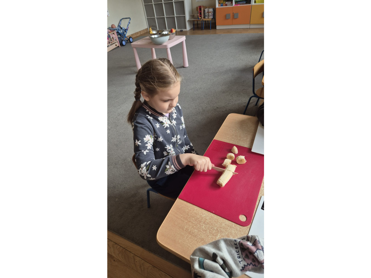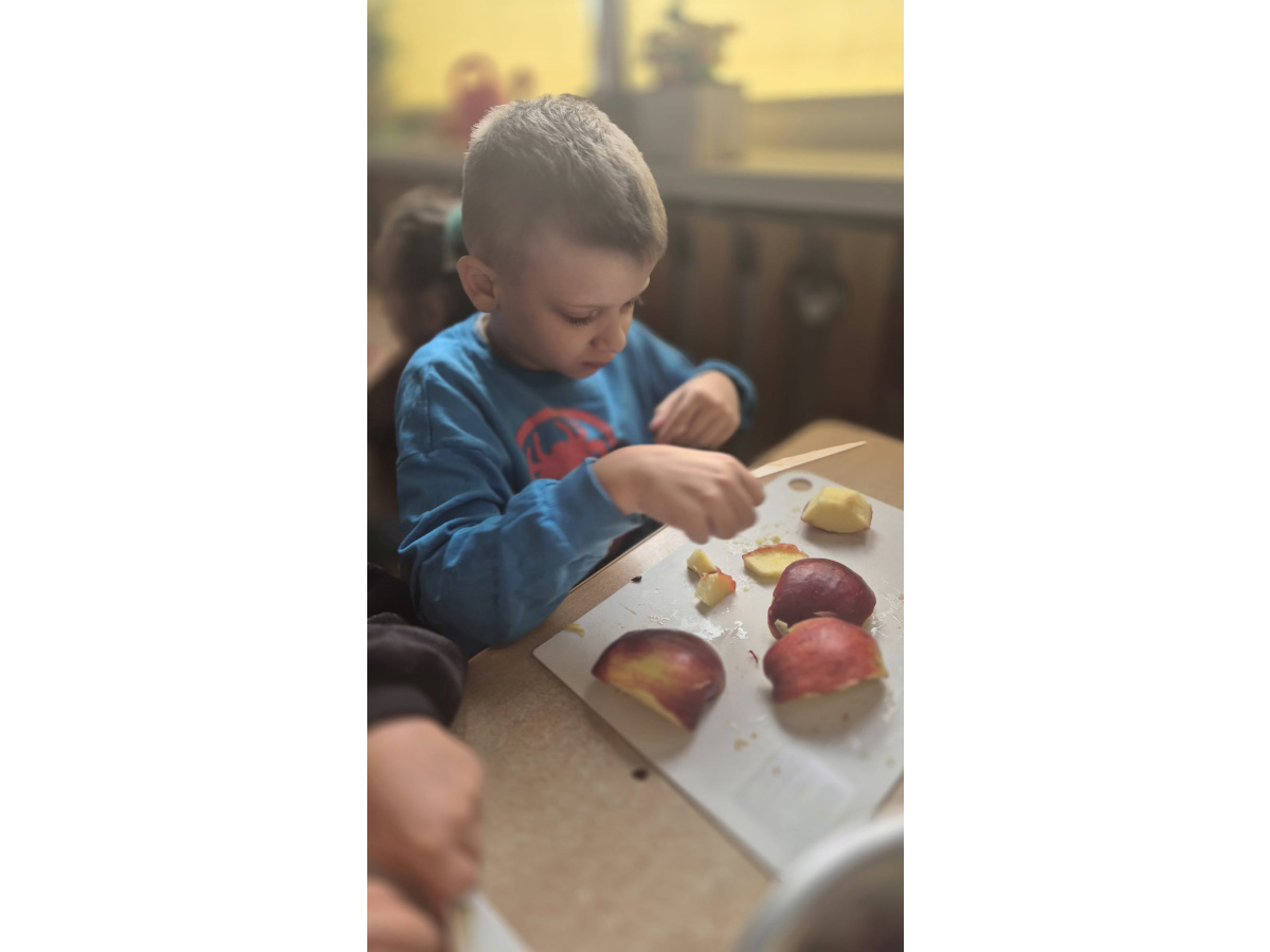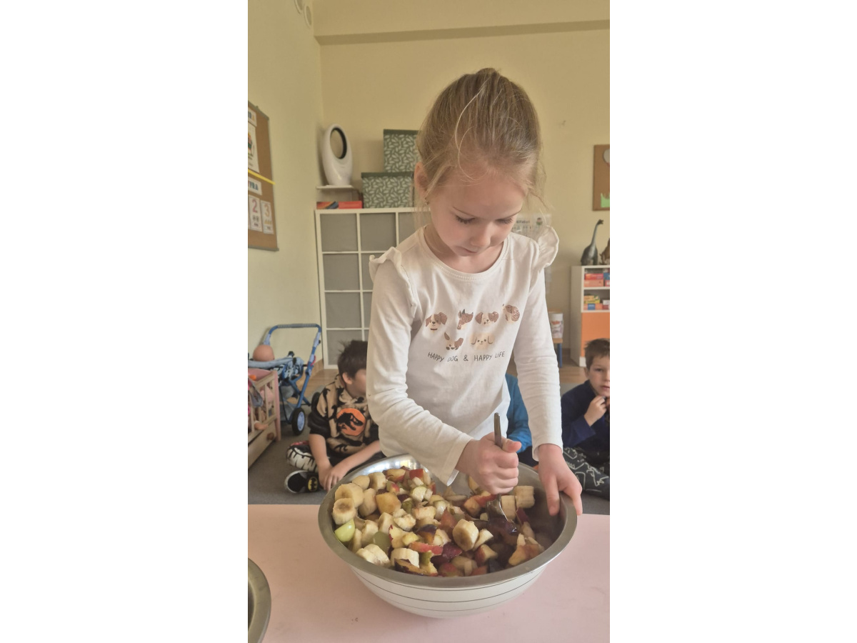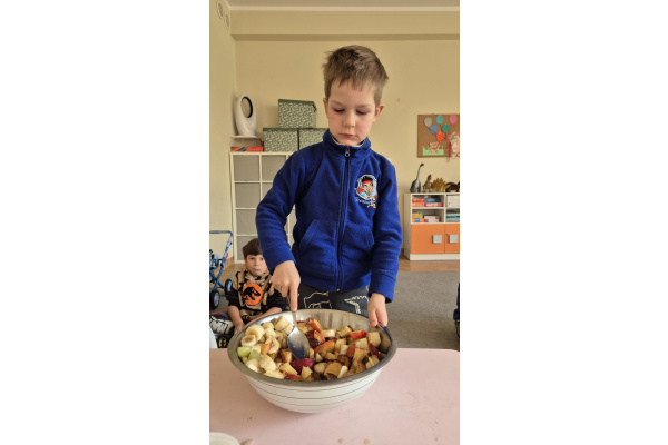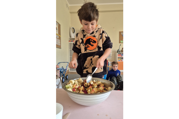 Dzieci z zaangażowaniem umyły a następnie pokroimy owoce. Podczas zajęć przedszkolaki uczyły się rozpoznawać owoce, rozwijały umiejętności współpracy i samodzielności. Na koniec wszyscy z apetytem zajadali przygotowane pyszności. Było kolorowo, zdrowo i bardzo smacznie!