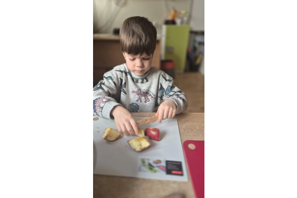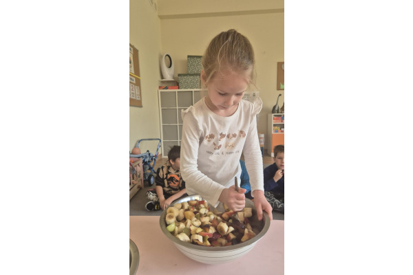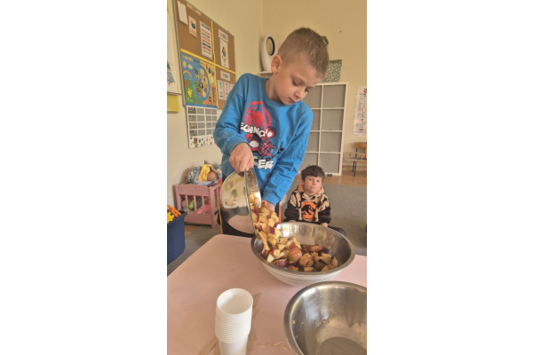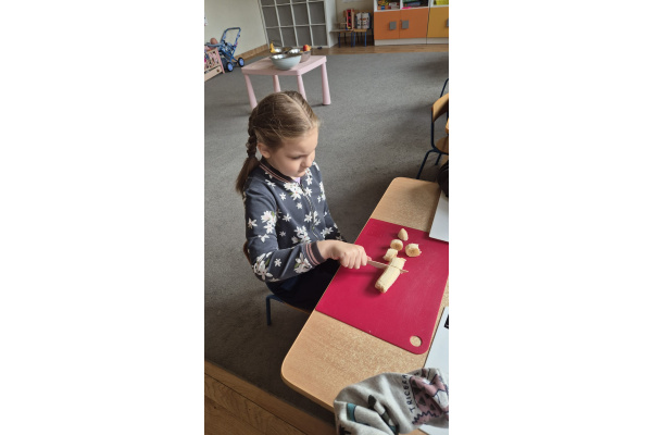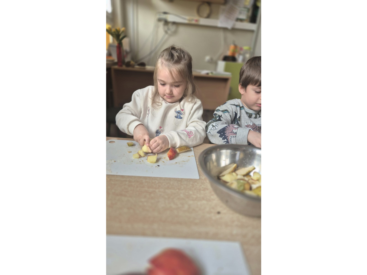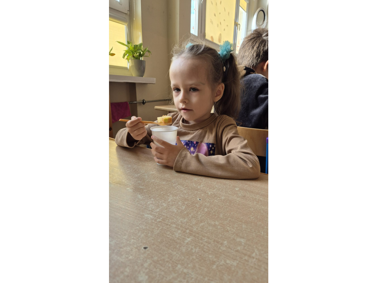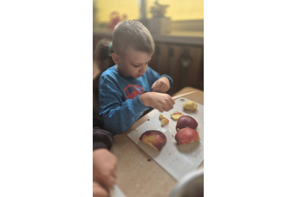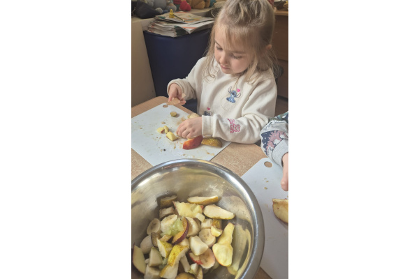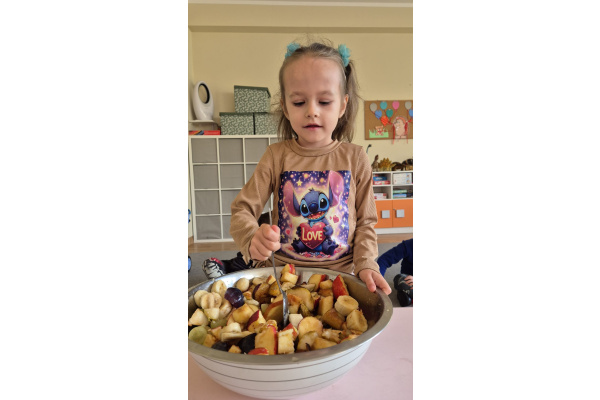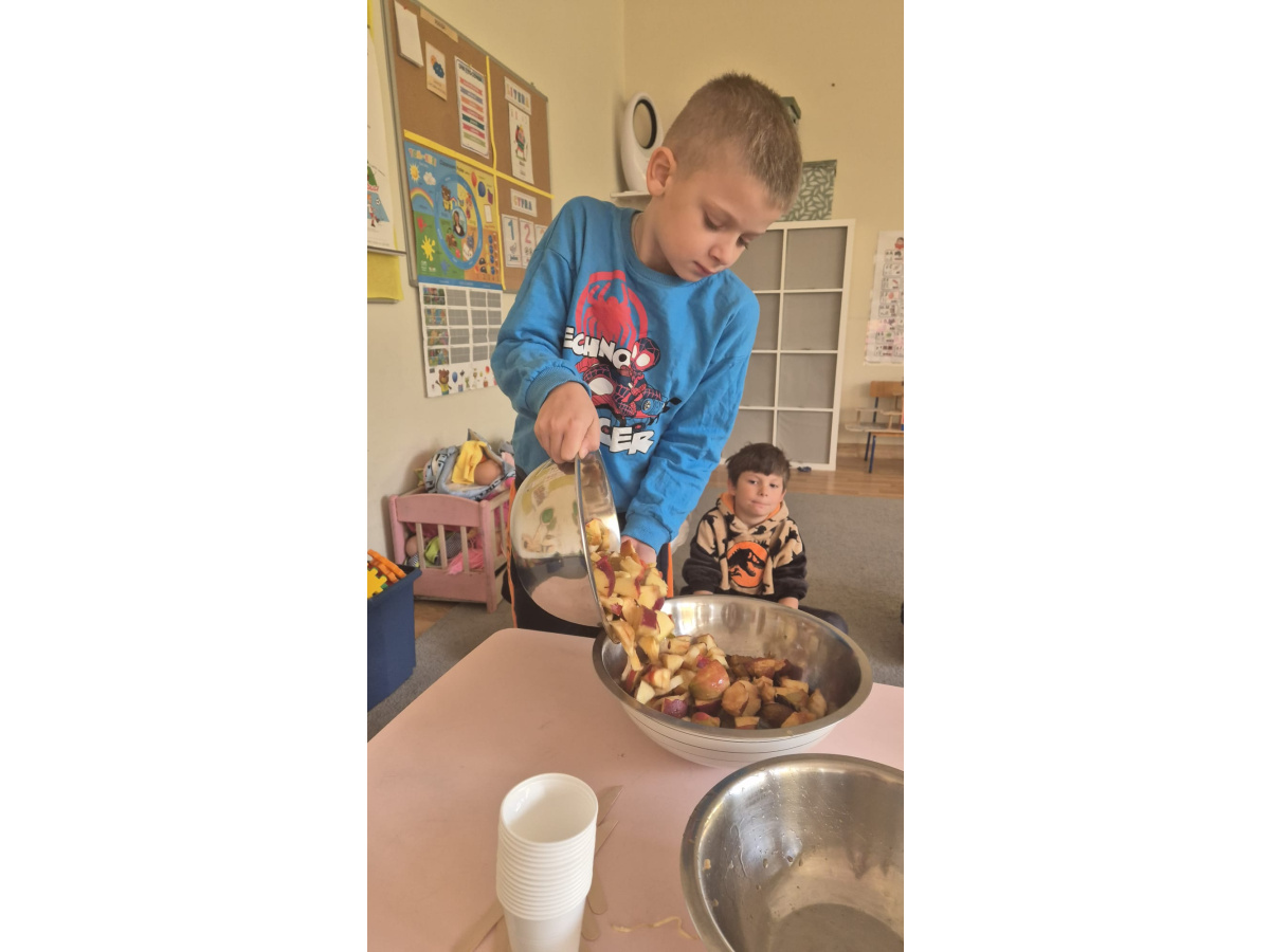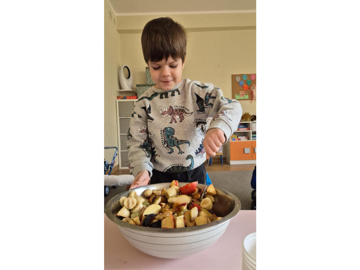 Dzieci z zaangażowaniem umyły a następnie pokroimy owoce. Podczas zajęć przedszkolaki uczyły się rozpoznawać owoce, rozwijały umiejętności współpracy i samodzielności. Na koniec wszyscy z apetytem zajadali przygotowane pyszności. Było kolorowo, zdrowo i bardzo smacznie!