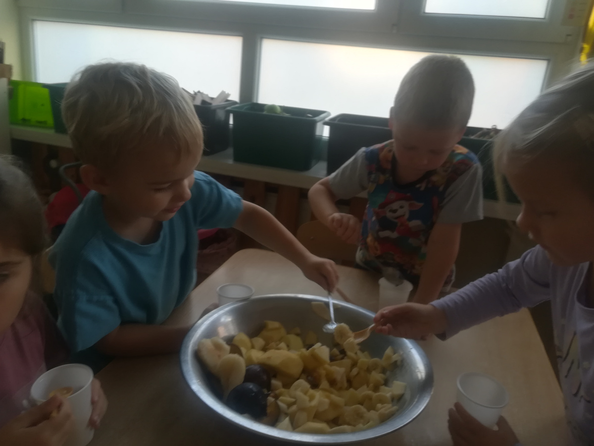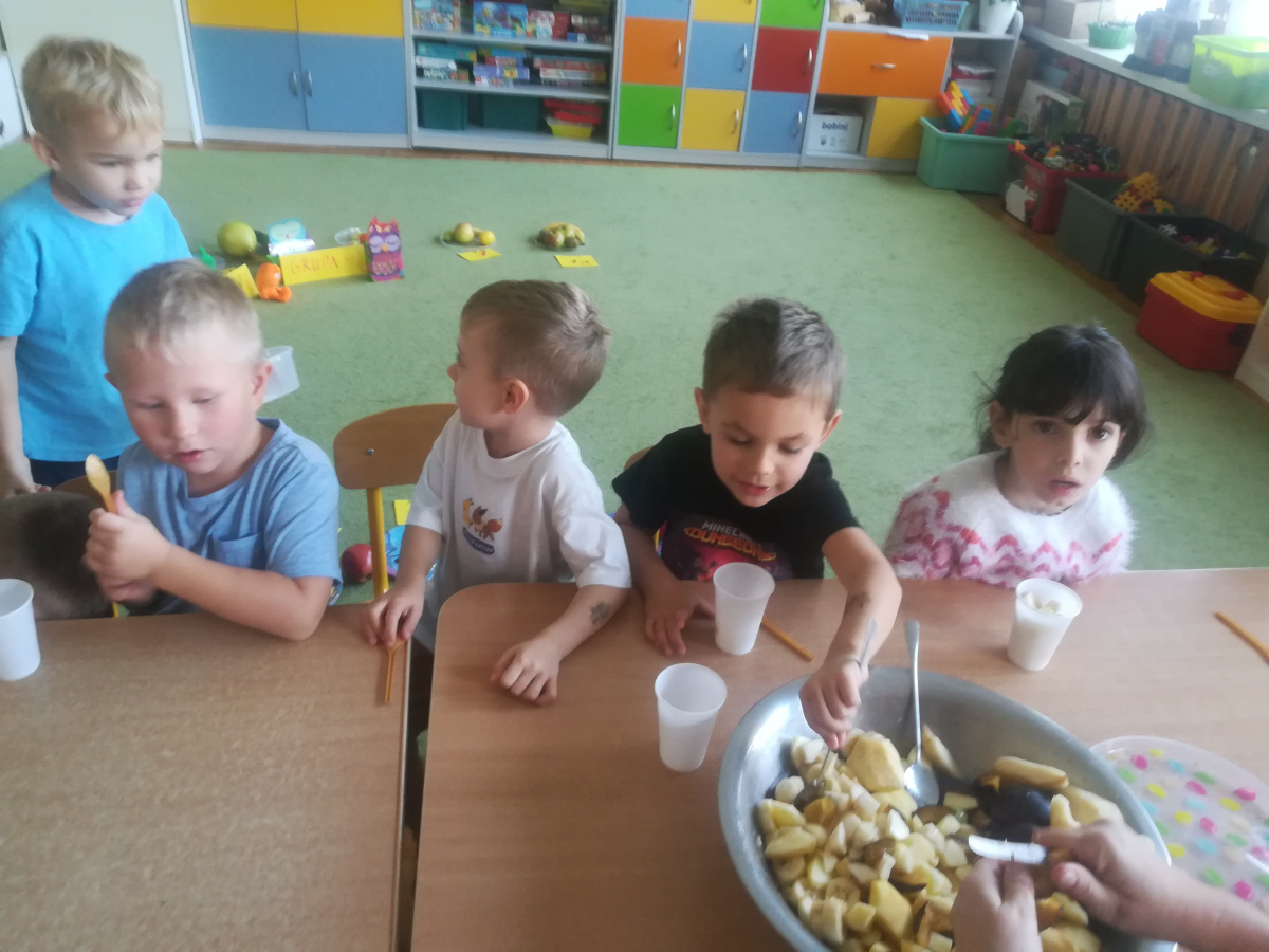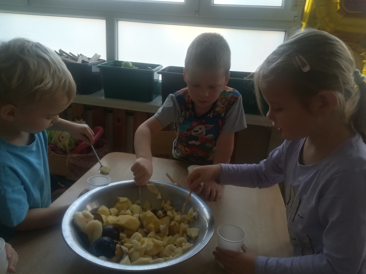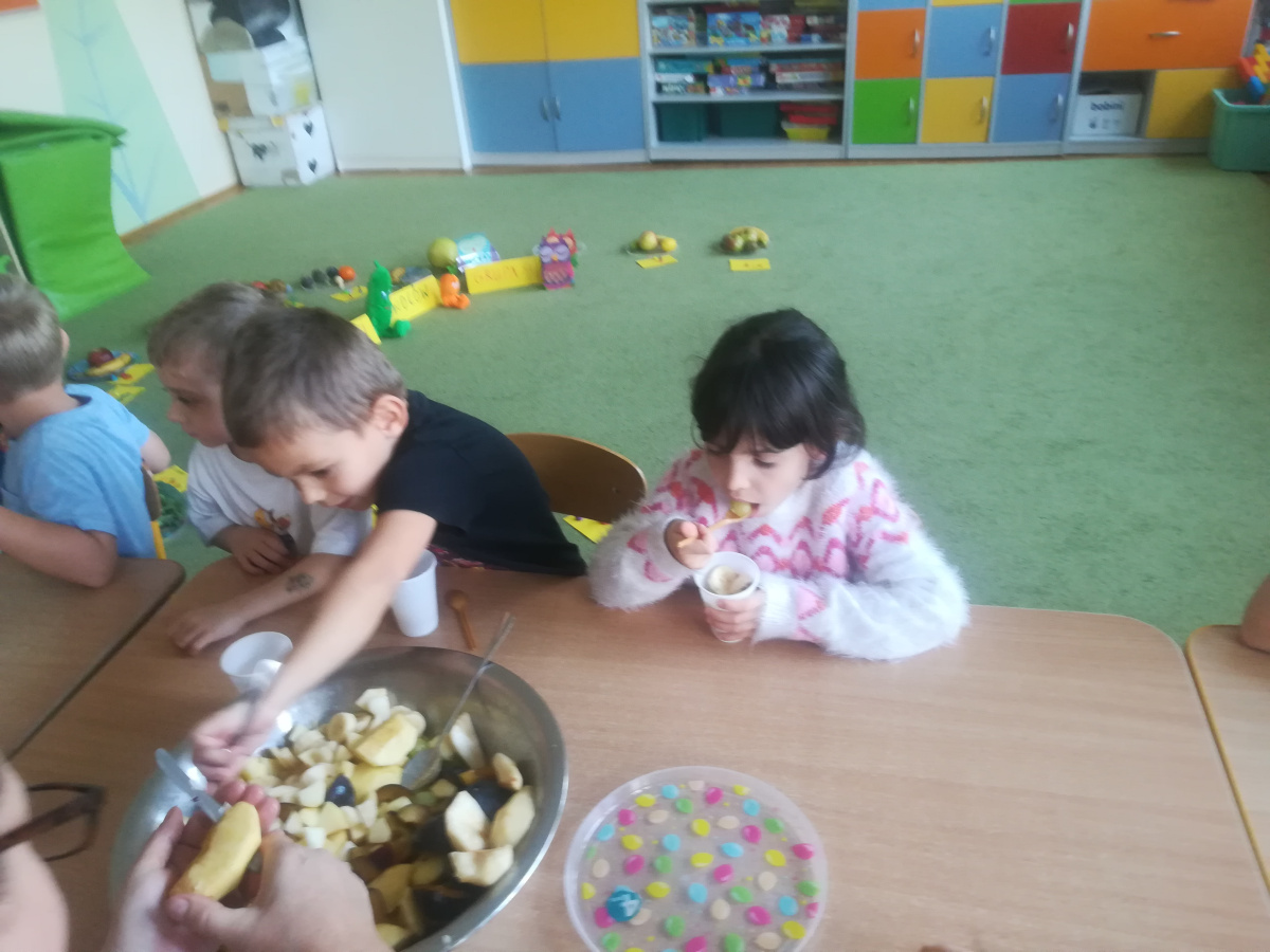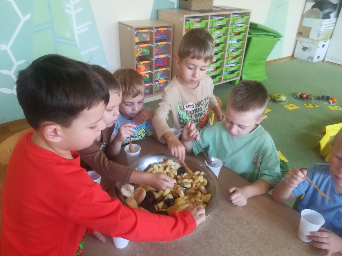 Dzieci z zaangażowaniem umyły a następnie pokroimy owoce. Podczas zajęć przedszkolaki uczyły się rozpoznawać owoce, rozwijały umiejętności współpracy i samodzielności. Na koniec wszyscy z apetytem zajadali przygotowane pyszności. Było kolorowo, zdrowo i bardzo smacznie!