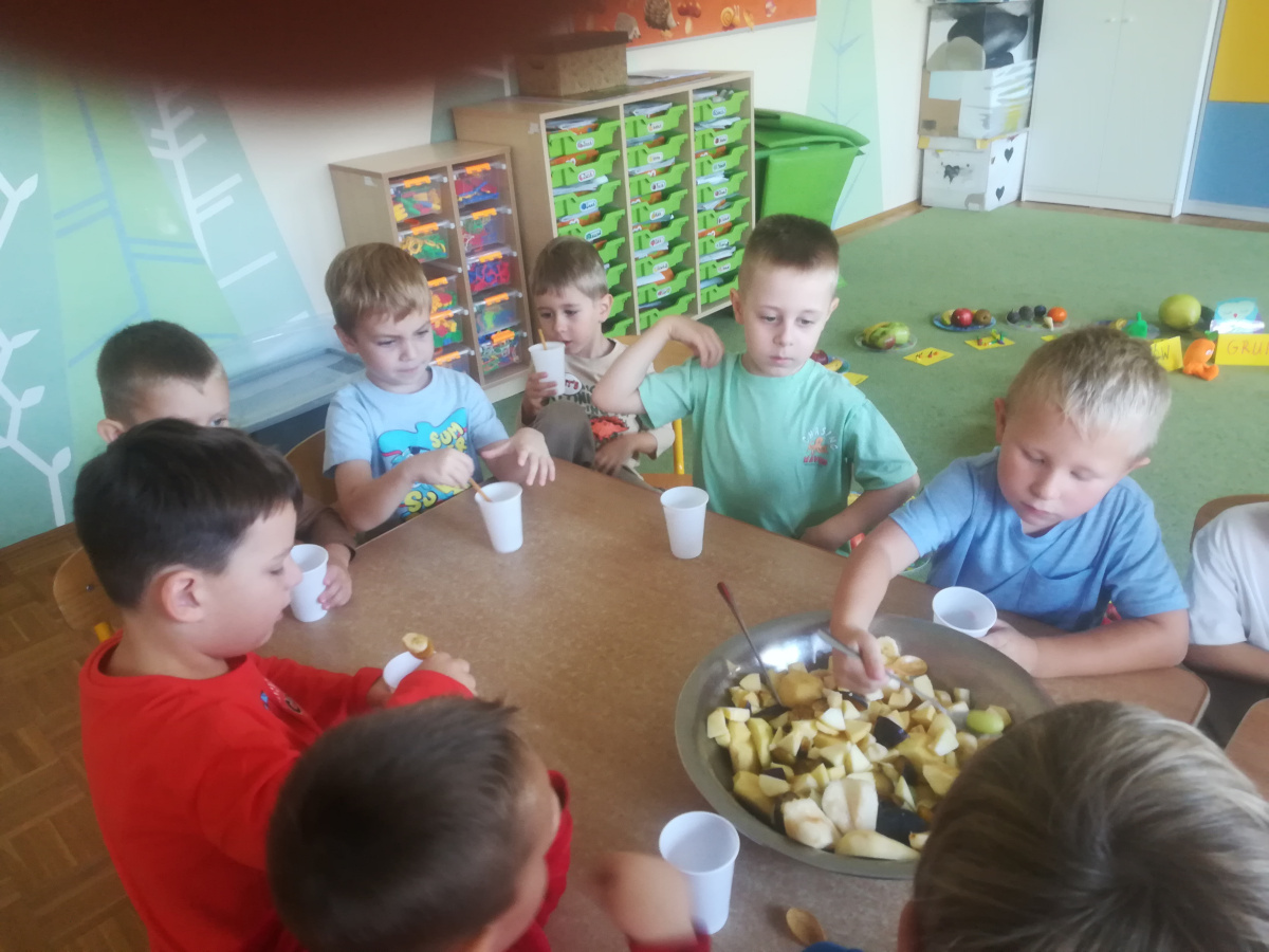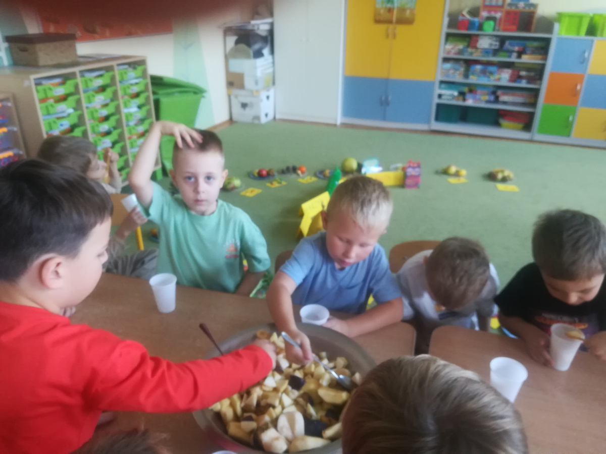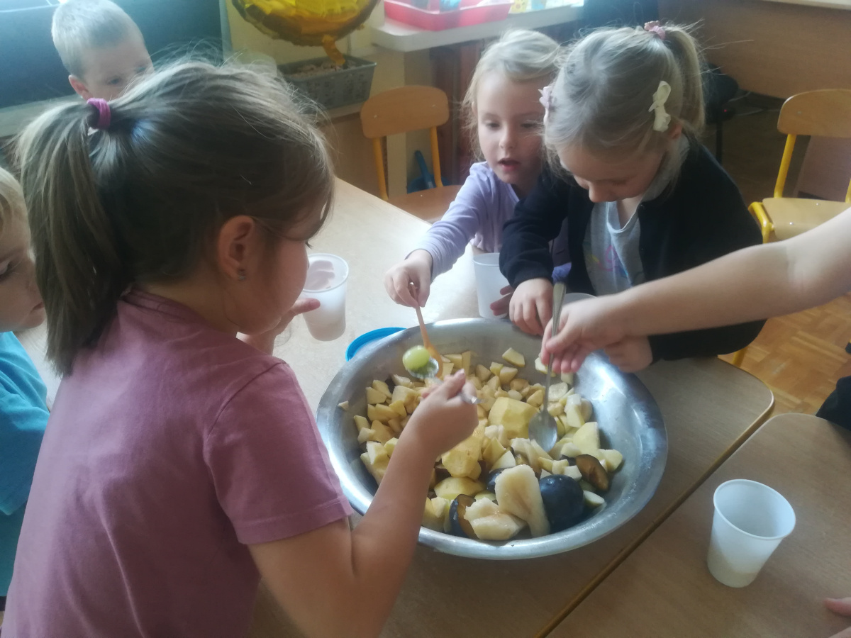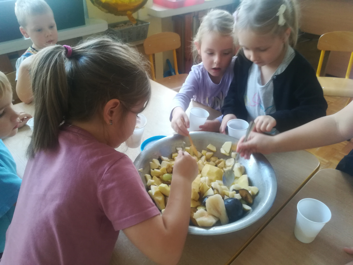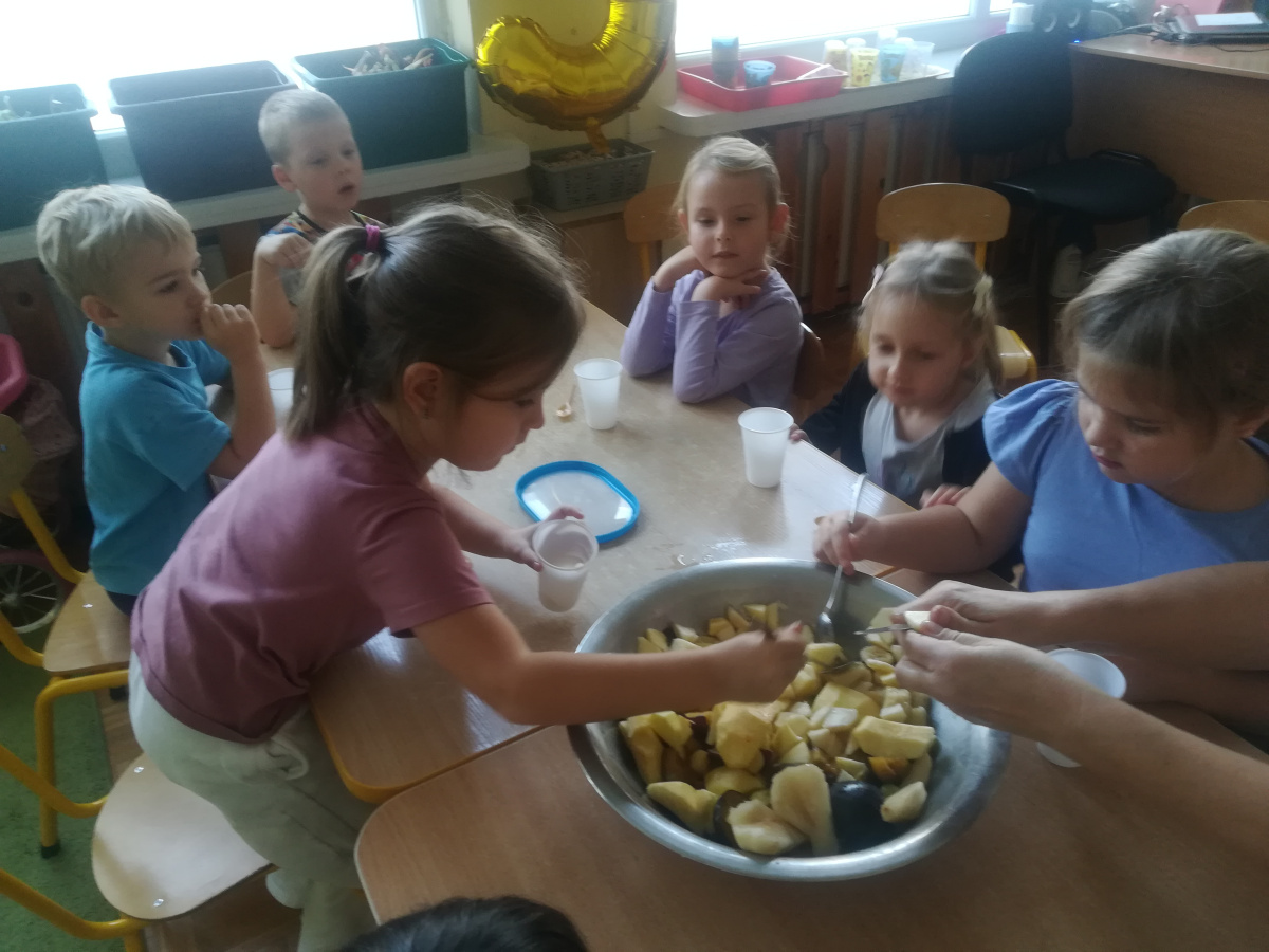 Dzieci z zaangażowaniem umyły a następnie pokroimy owoce. Podczas zajęć przedszkolaki uczyły się rozpoznawać owoce, rozwijały umiejętności współpracy i samodzielności. Na koniec wszyscy z apetytem zajadali przygotowane pyszności. Było kolorowo, zdrowo i bardzo smacznie!